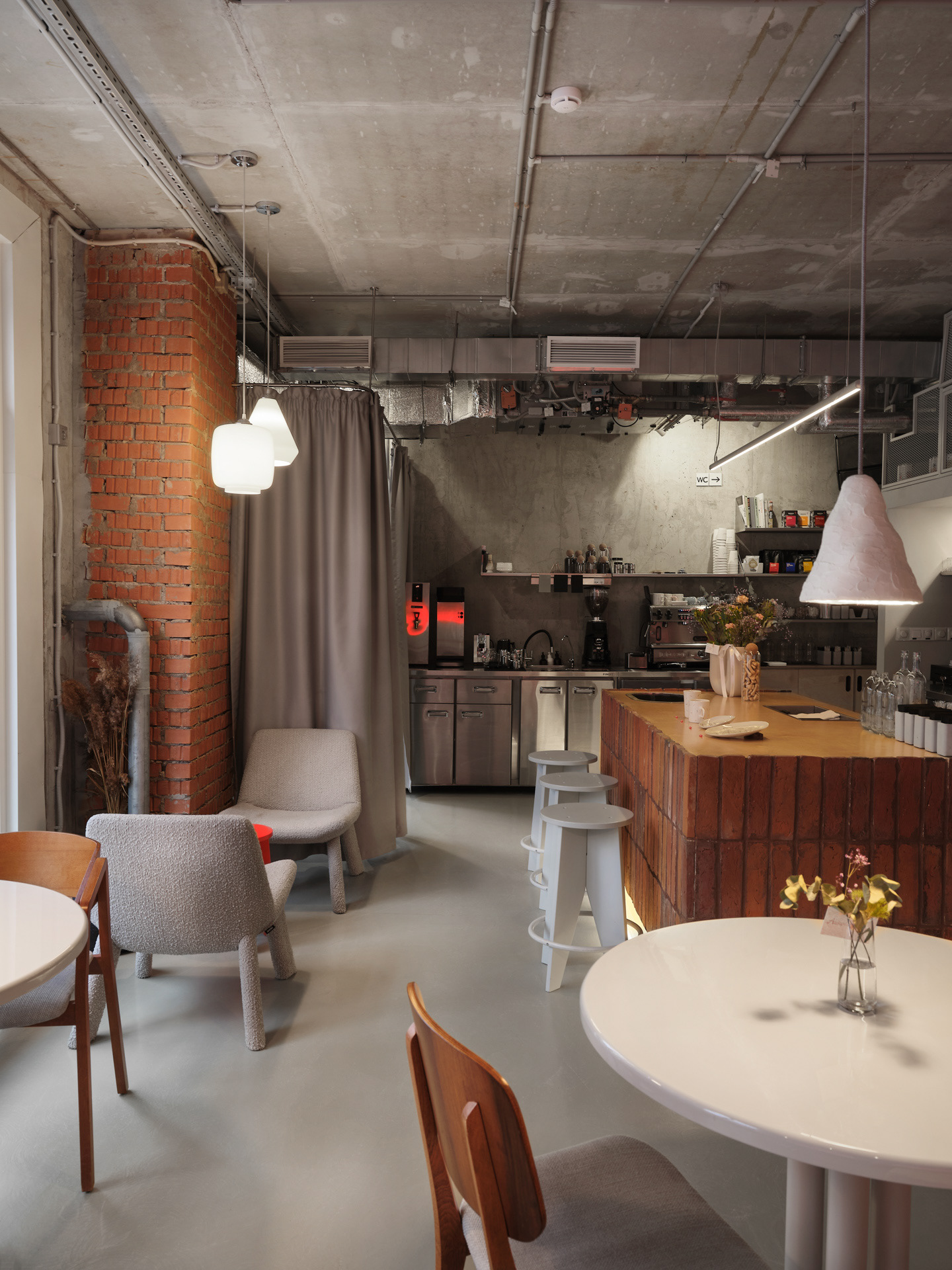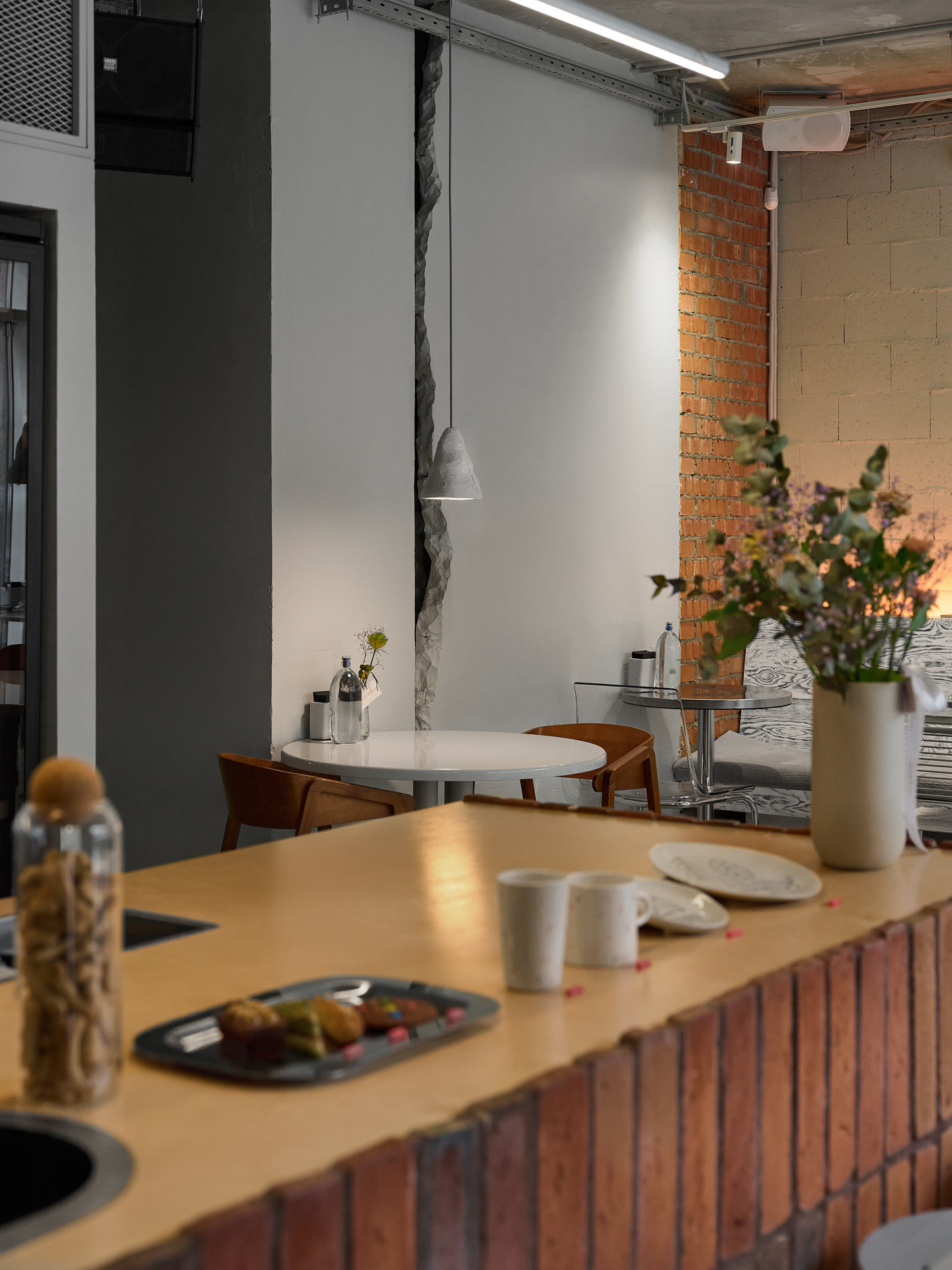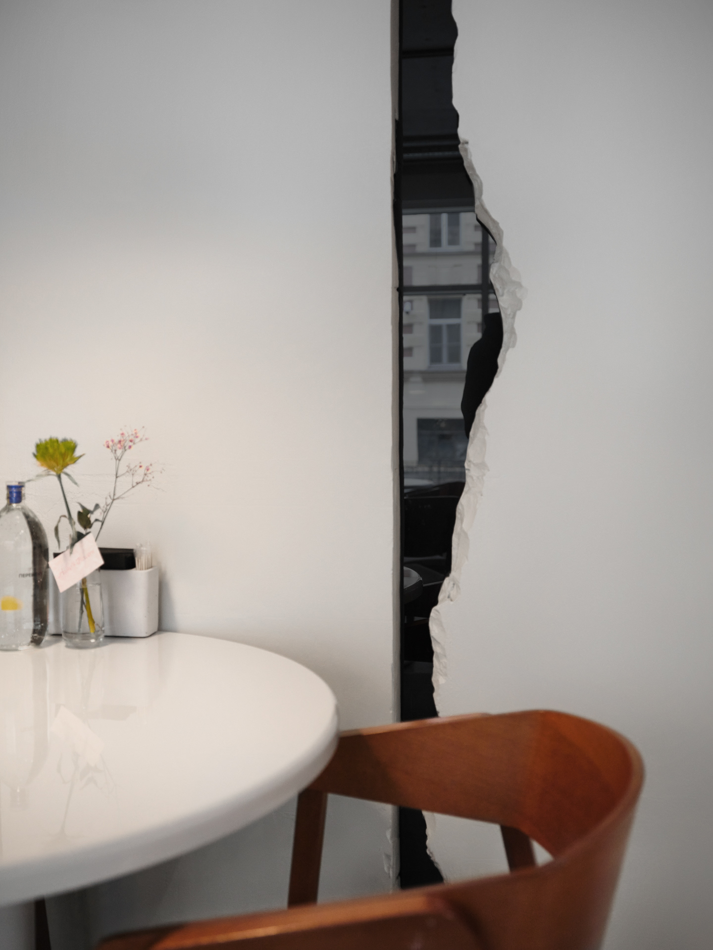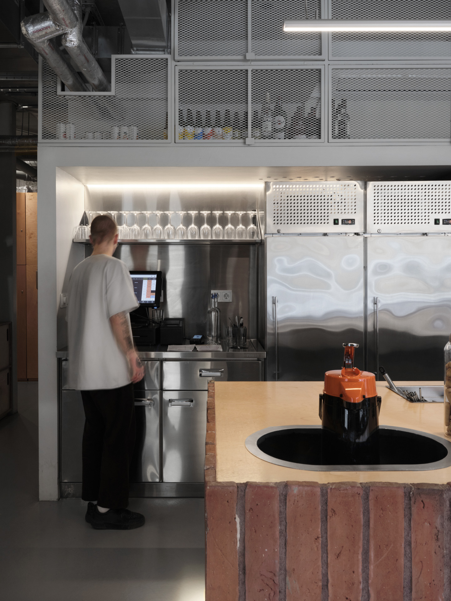 The interior was created like a drawing - many things are made by hand, like filling transparent countertops or a crack that accidentally tore the wall through which the synthesis with the studio takes place, allowing the visitor to observe the work of architects in real time