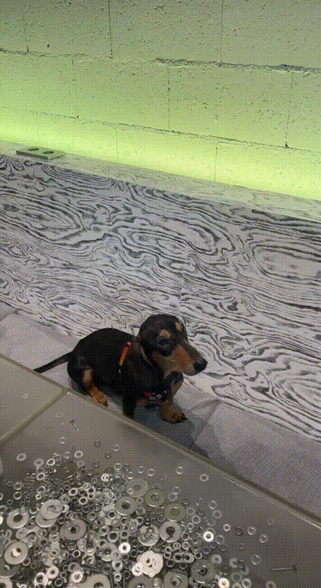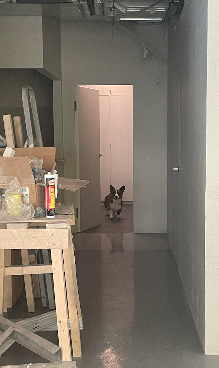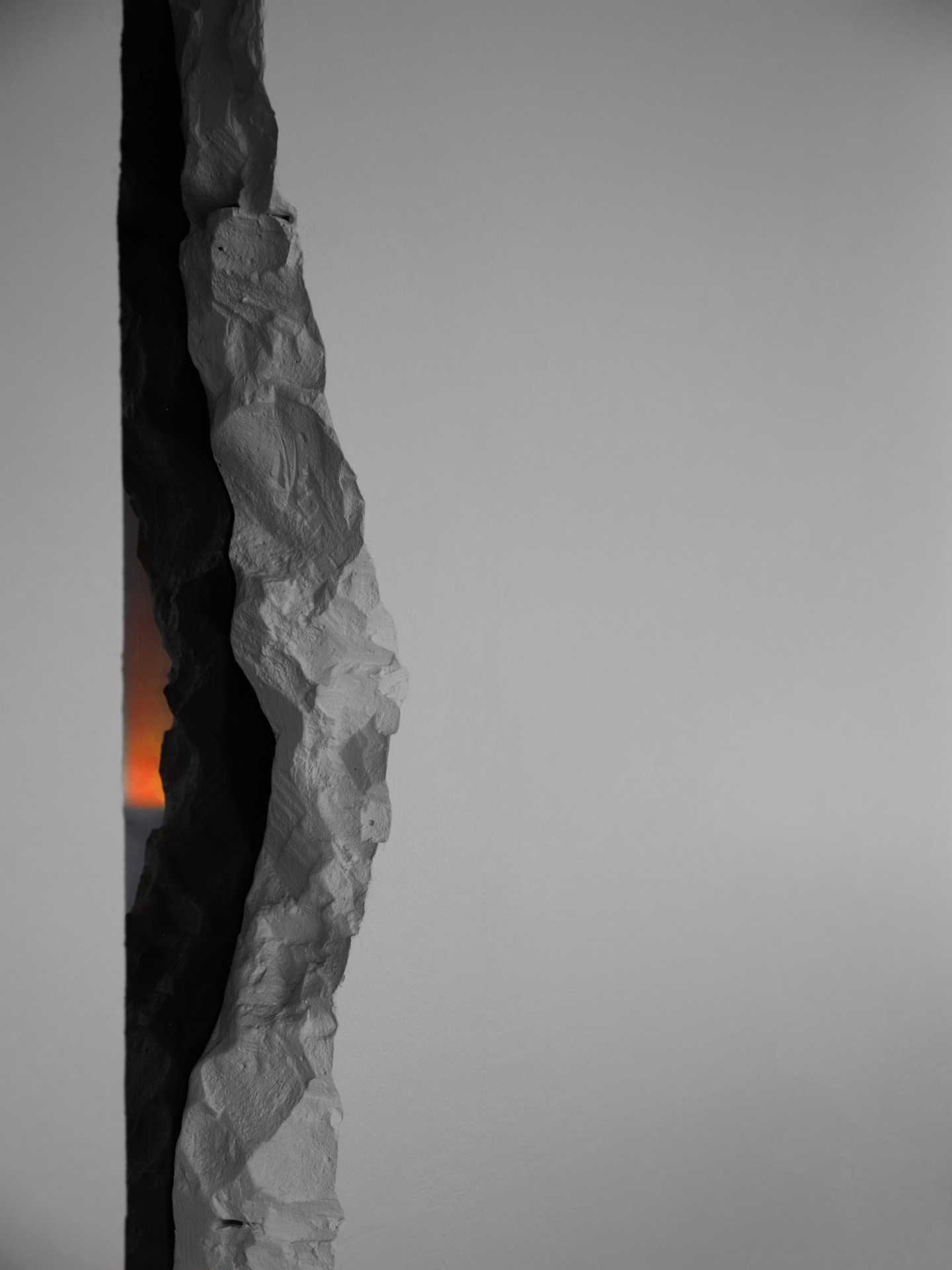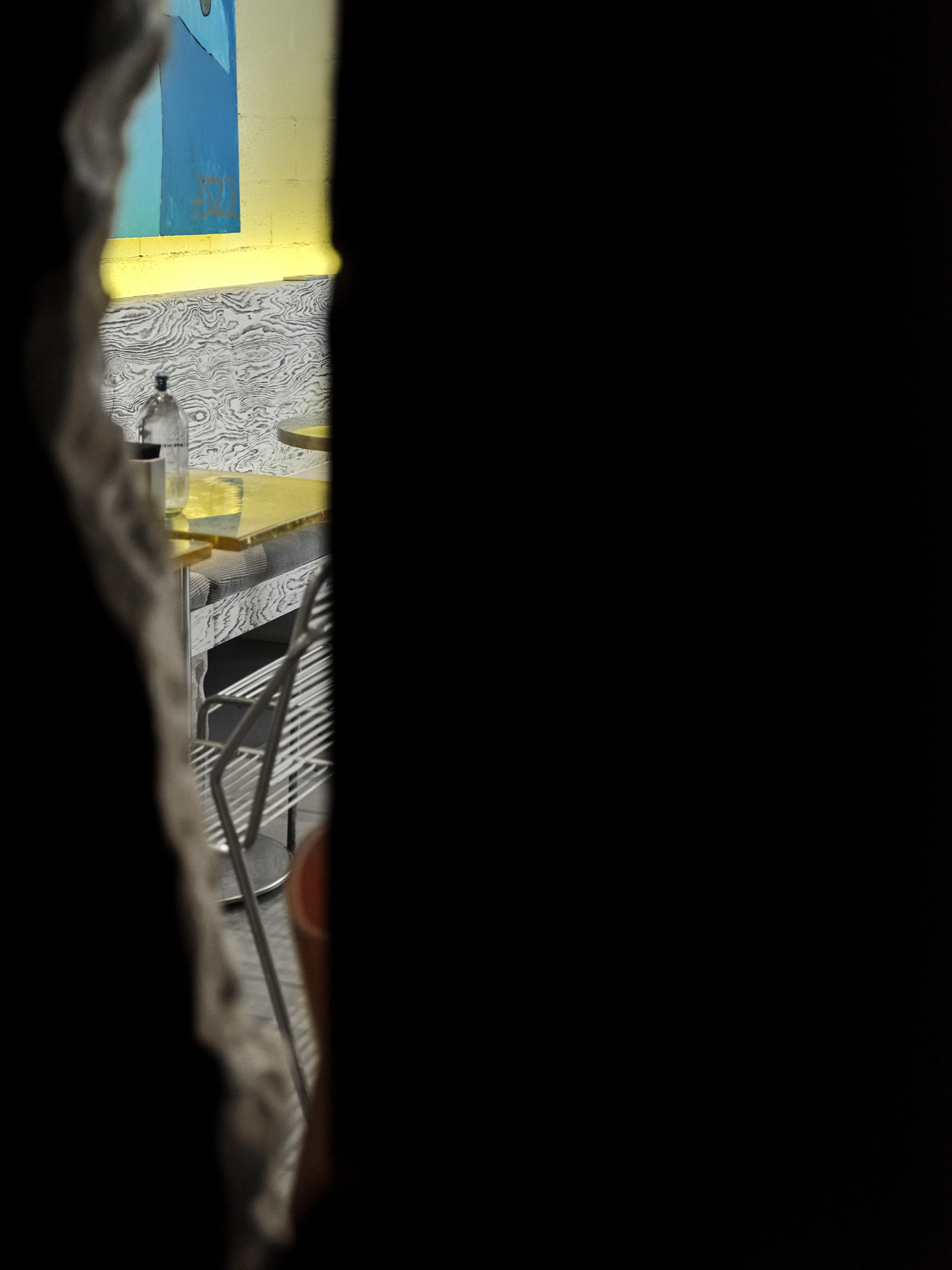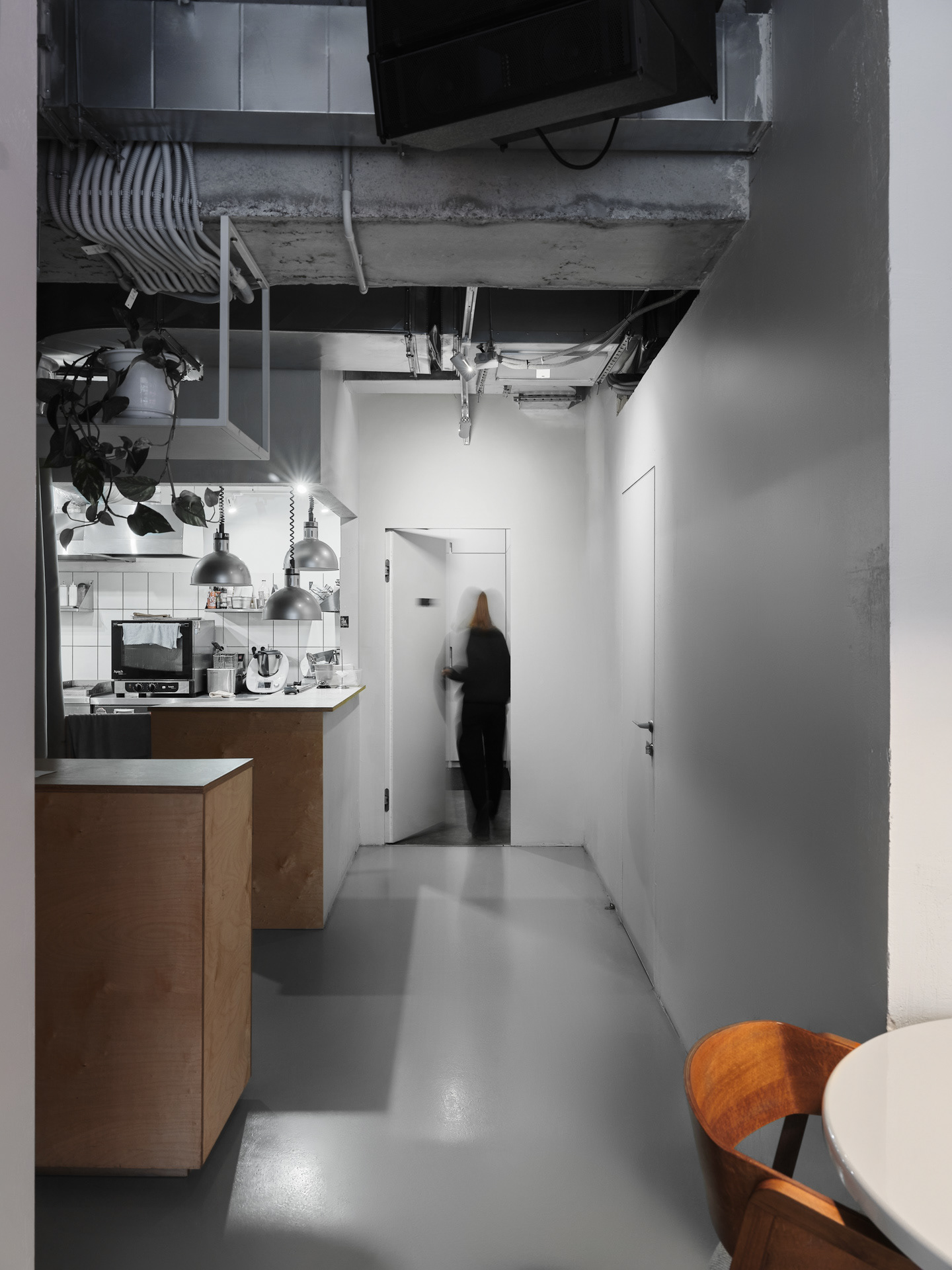 The interior was created like a drawing - many things are made by hand, like filling transparent countertops or a crack that accidentally tore the wall through which the synthesis with the studio takes place, allowing the visitor to observe the work of architects in real time