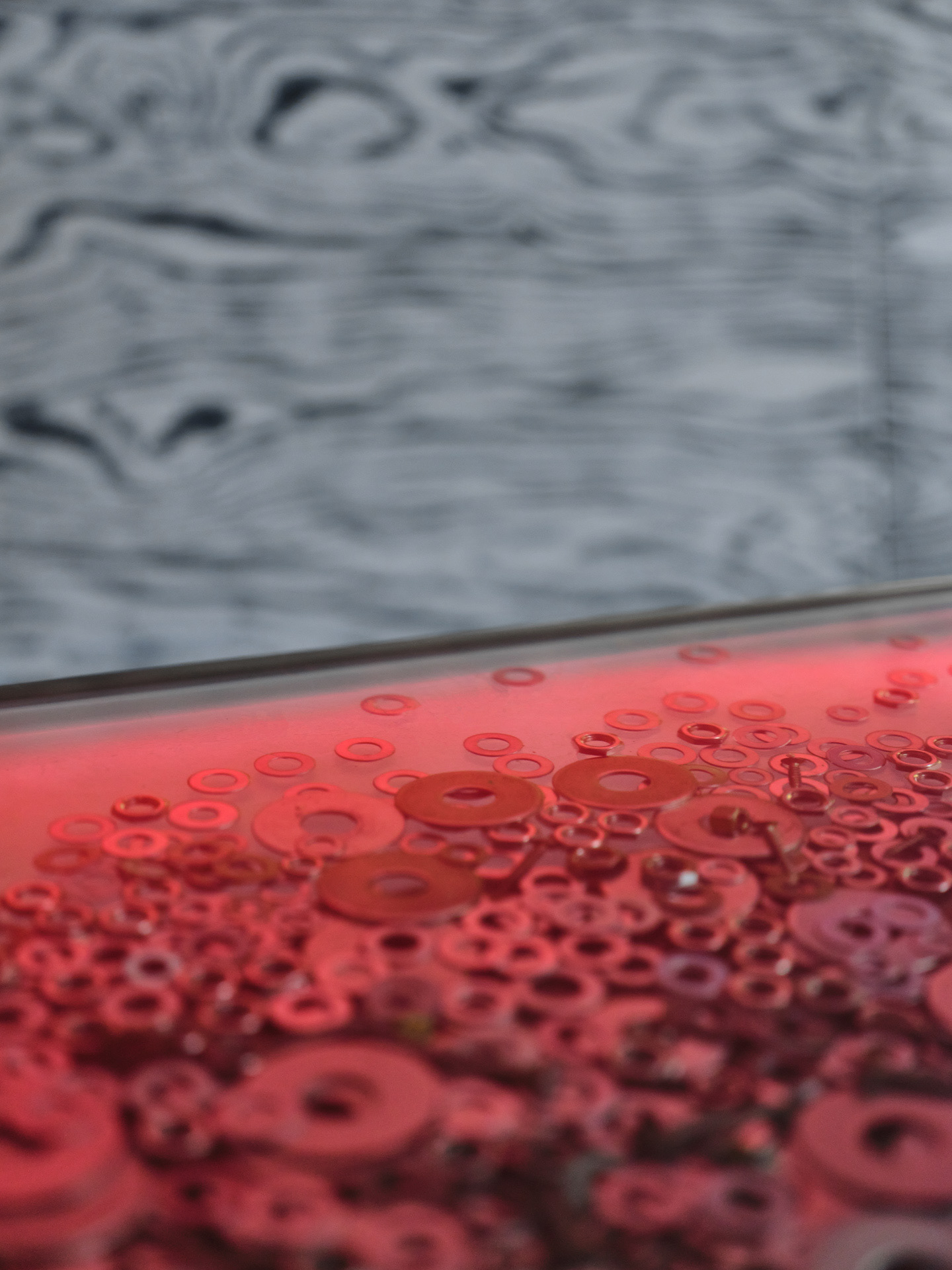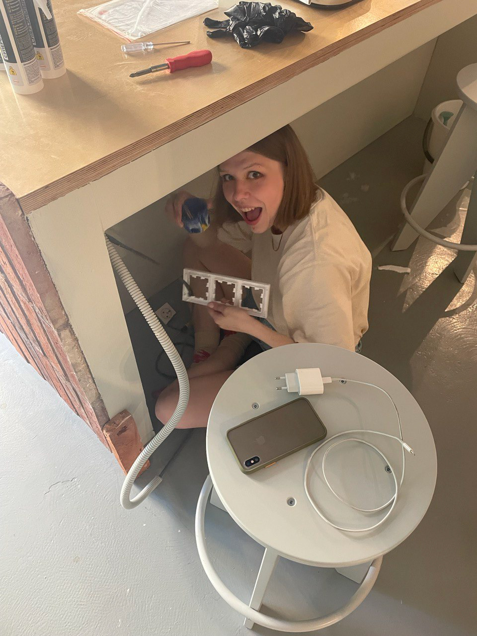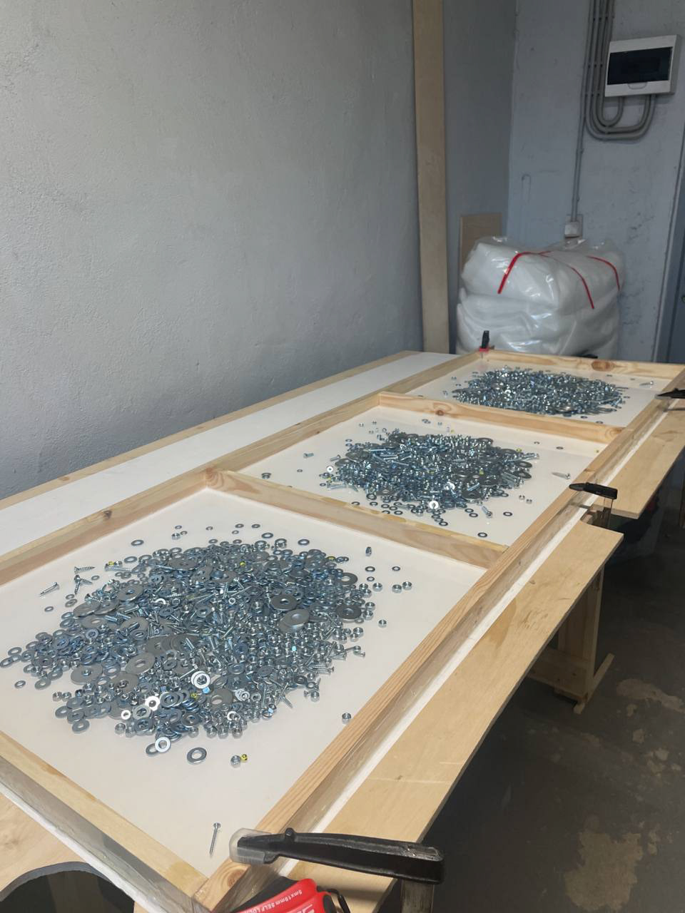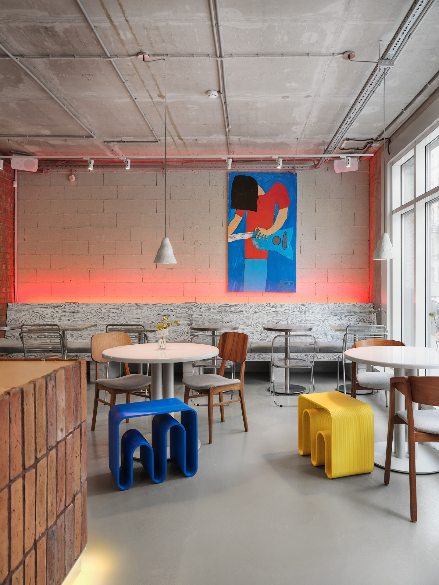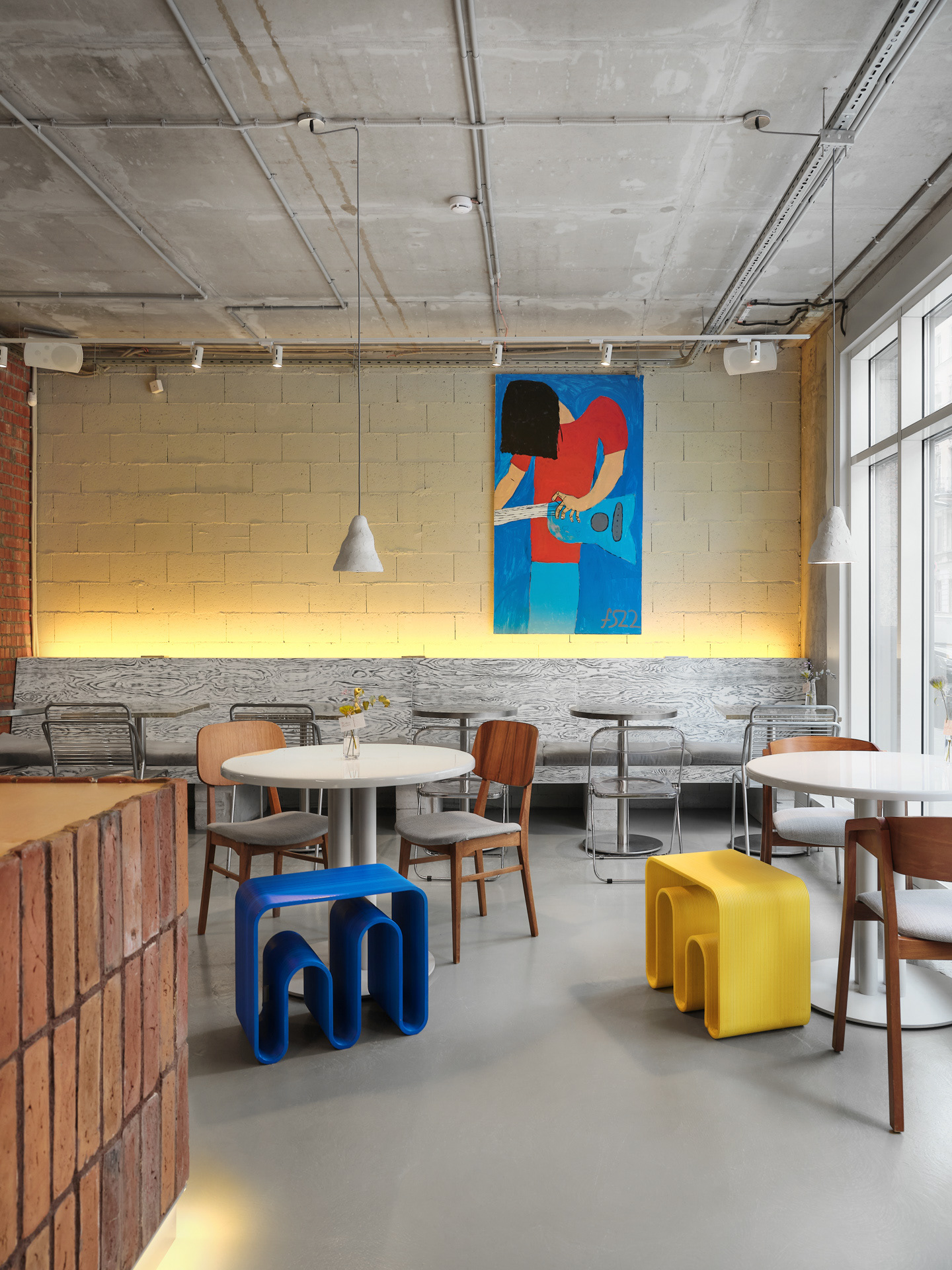 A separate feature of the space was real, raw building materials: bare concrete walls, brick columns that were not sewn up, plywood furniture, a bench standing on building blocks, transparent tables in which various parts - nuts, bolts and screws - drowned.