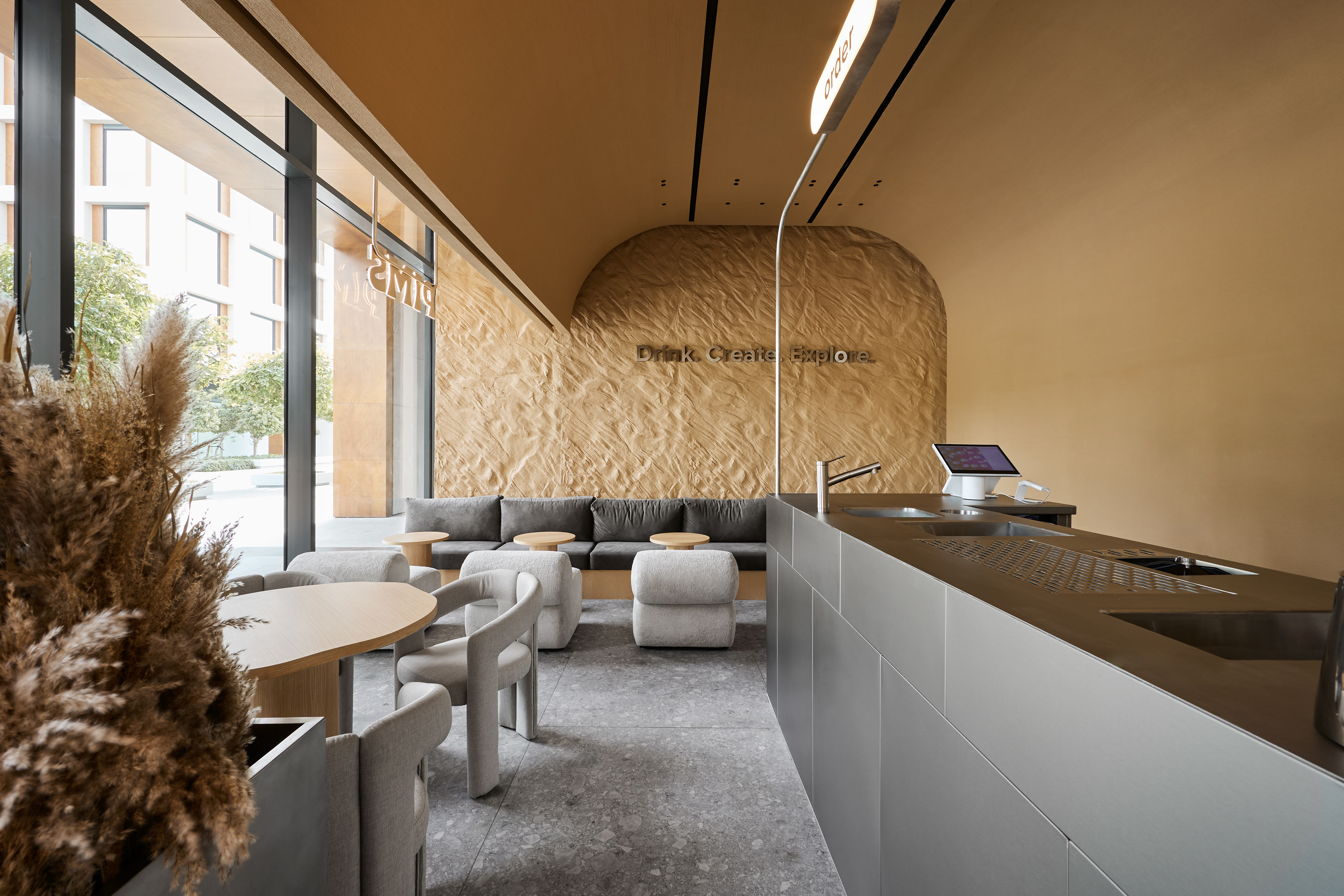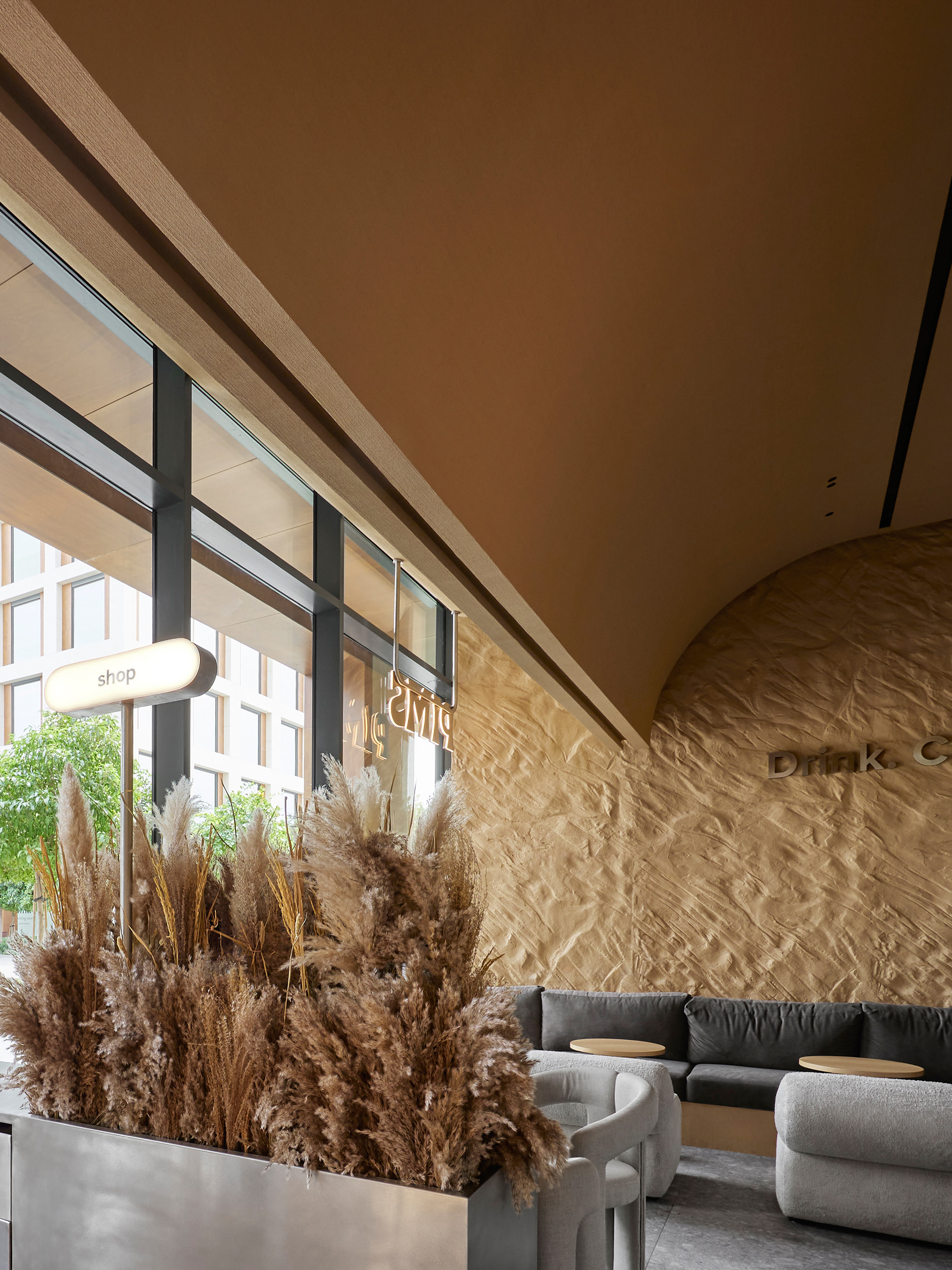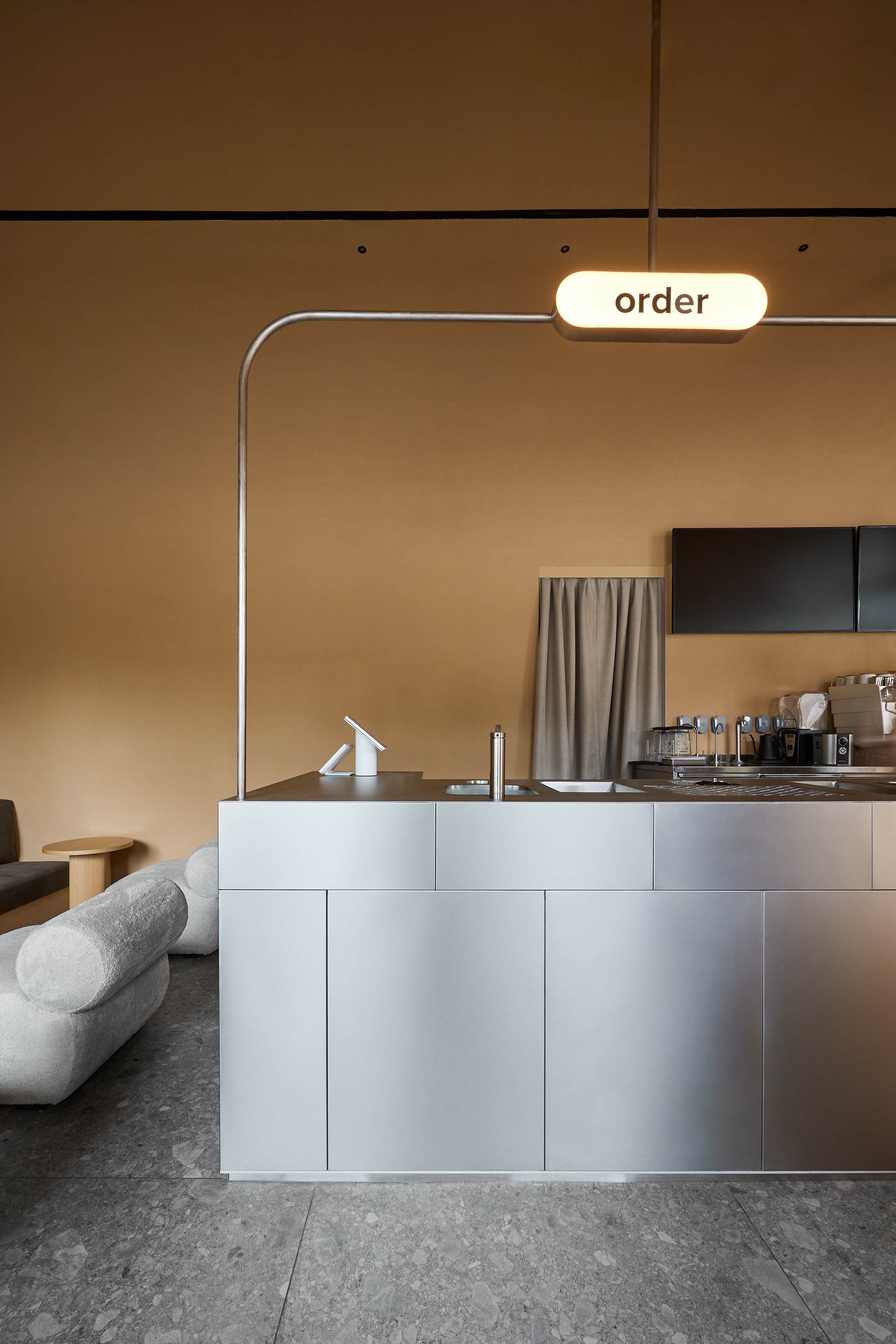 In the new establishment, we emphasized continuity with the first version of the venue: using sandy textures, and beige-golden elements in contrast with matte metallic panels.
