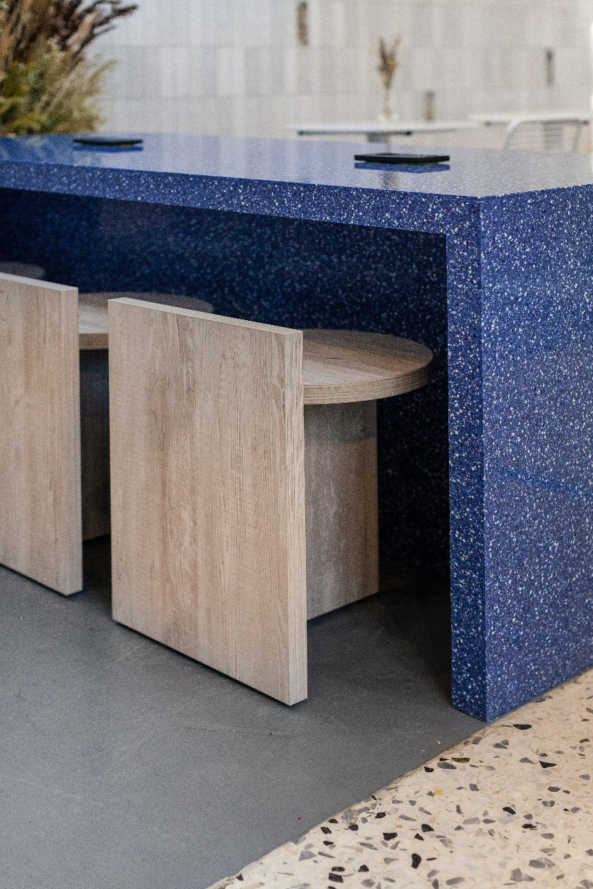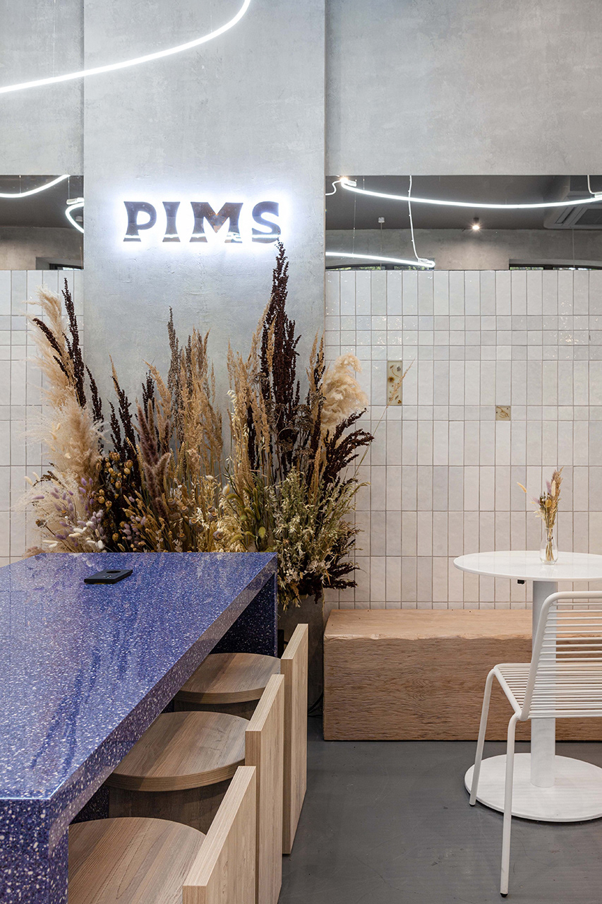 For the first flagship tea house, PIMS, we built the concept on the contrast of natural and man-made materials. Synthetic surfaces such as polycarbonate, metal, neon and glass are combined with log benches, stone-textured walls, and dried flowers sprouting from the floor through red granite rubble. Intense signature colors, reflective and translucent materials are woven into rough surfaces and objects