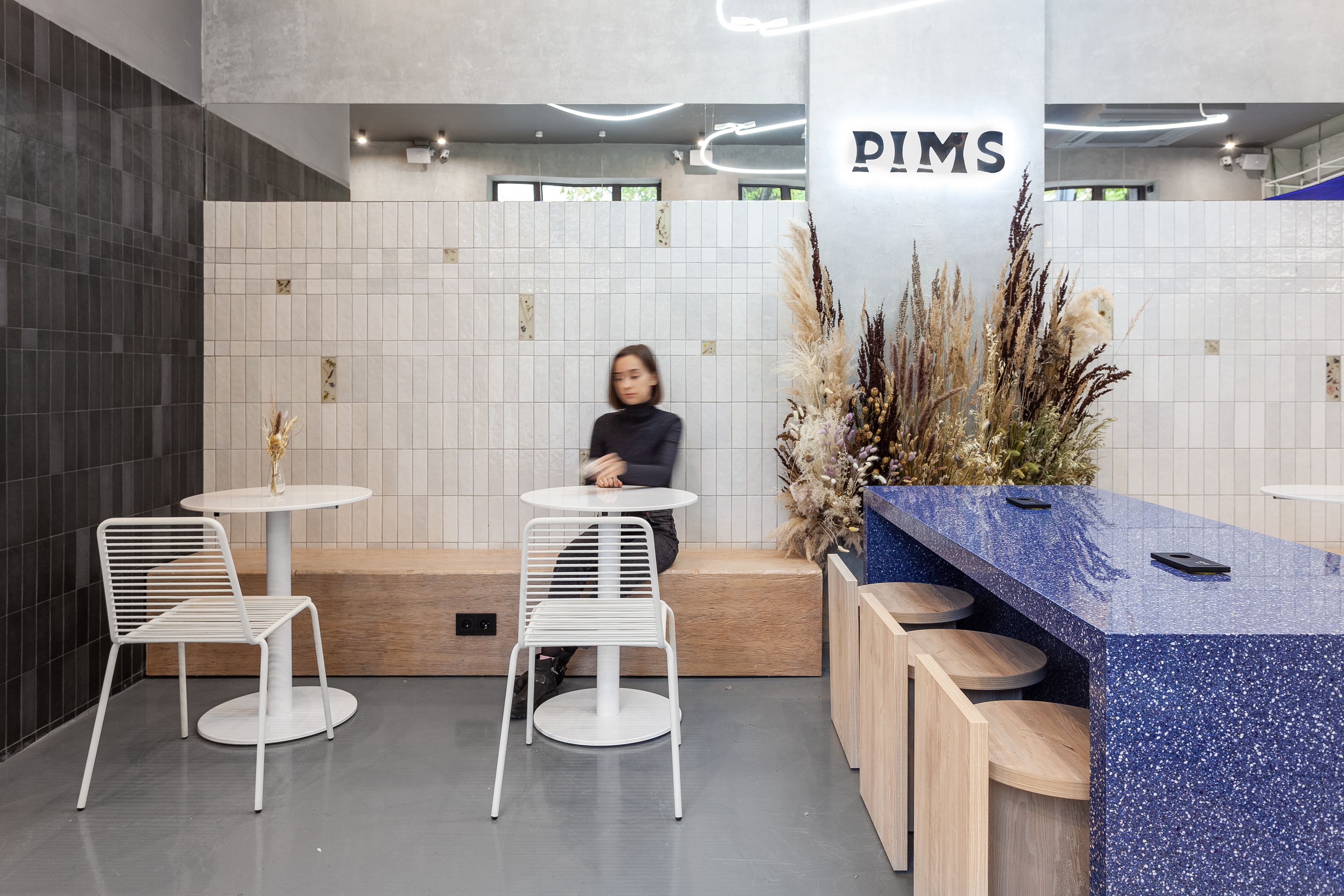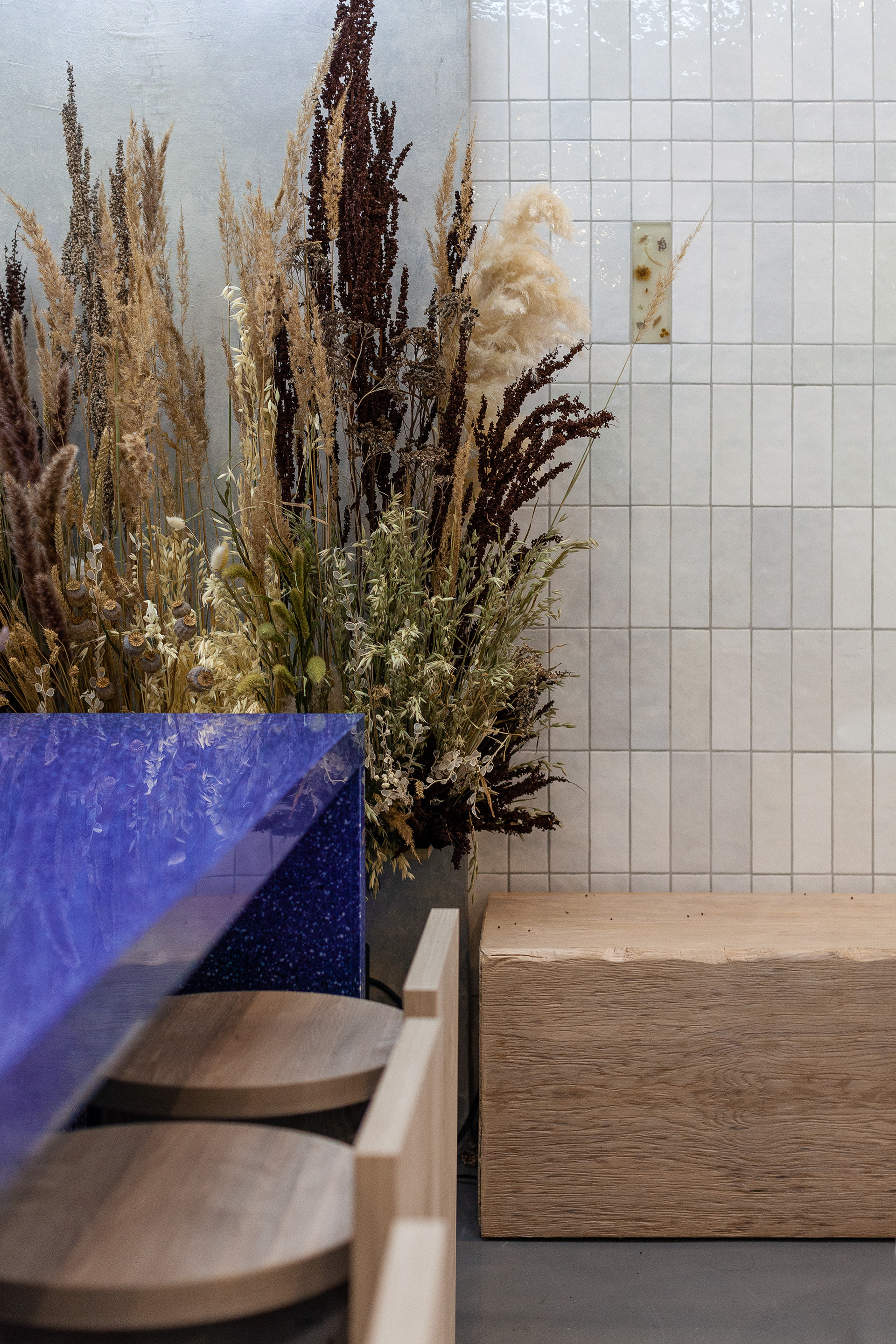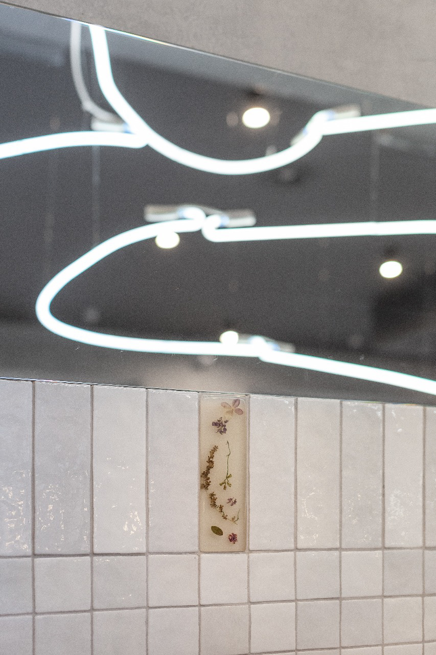 The main, but not noticeable at first glance, semantic accent of the space is a transparent tile with flowers and herbs frozen in it - like tea, decorated with fragrant petals and leaves. By embedding the symbol of tea in the walls of the teahouse, we physically and visually reflect its inalienability from PIMS