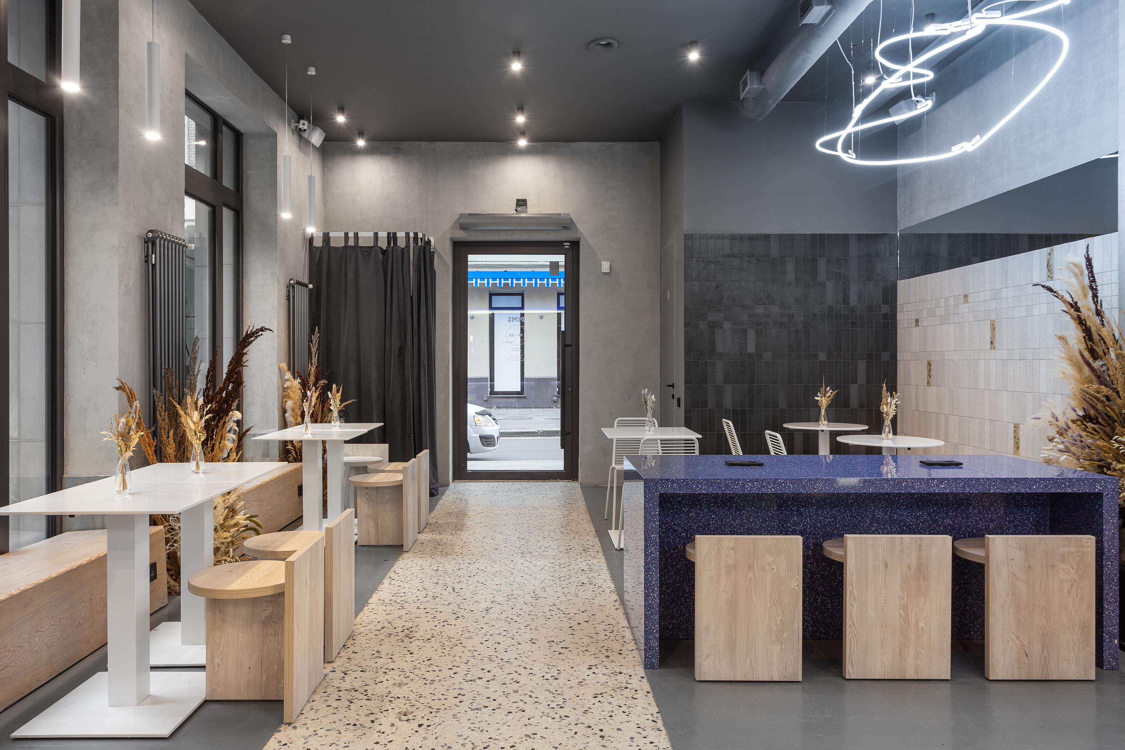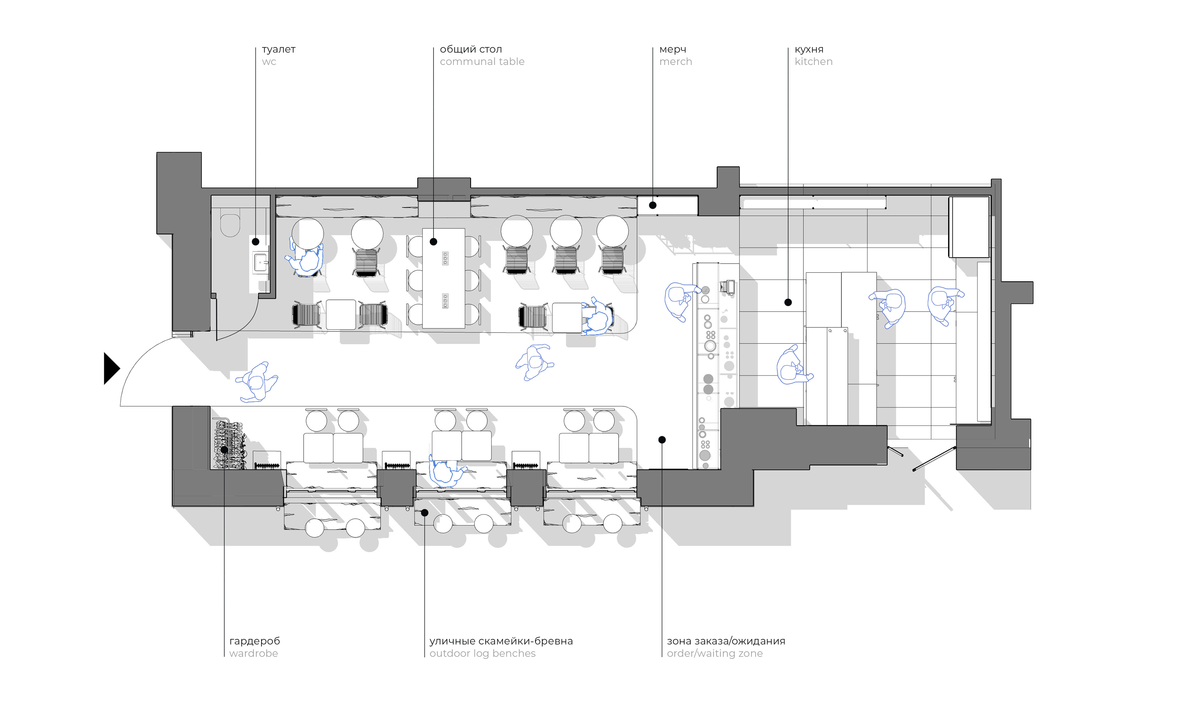 In a relatively small area, we managed to accommodate 32 comfortable seats, a full kitchen and a cash desk with a waiting area, a wardrobe and a shelf for merch. For the warm season, log benches with built-in stainless steel tables are placed into the windows from the outside