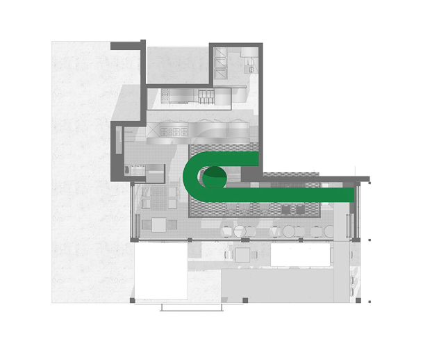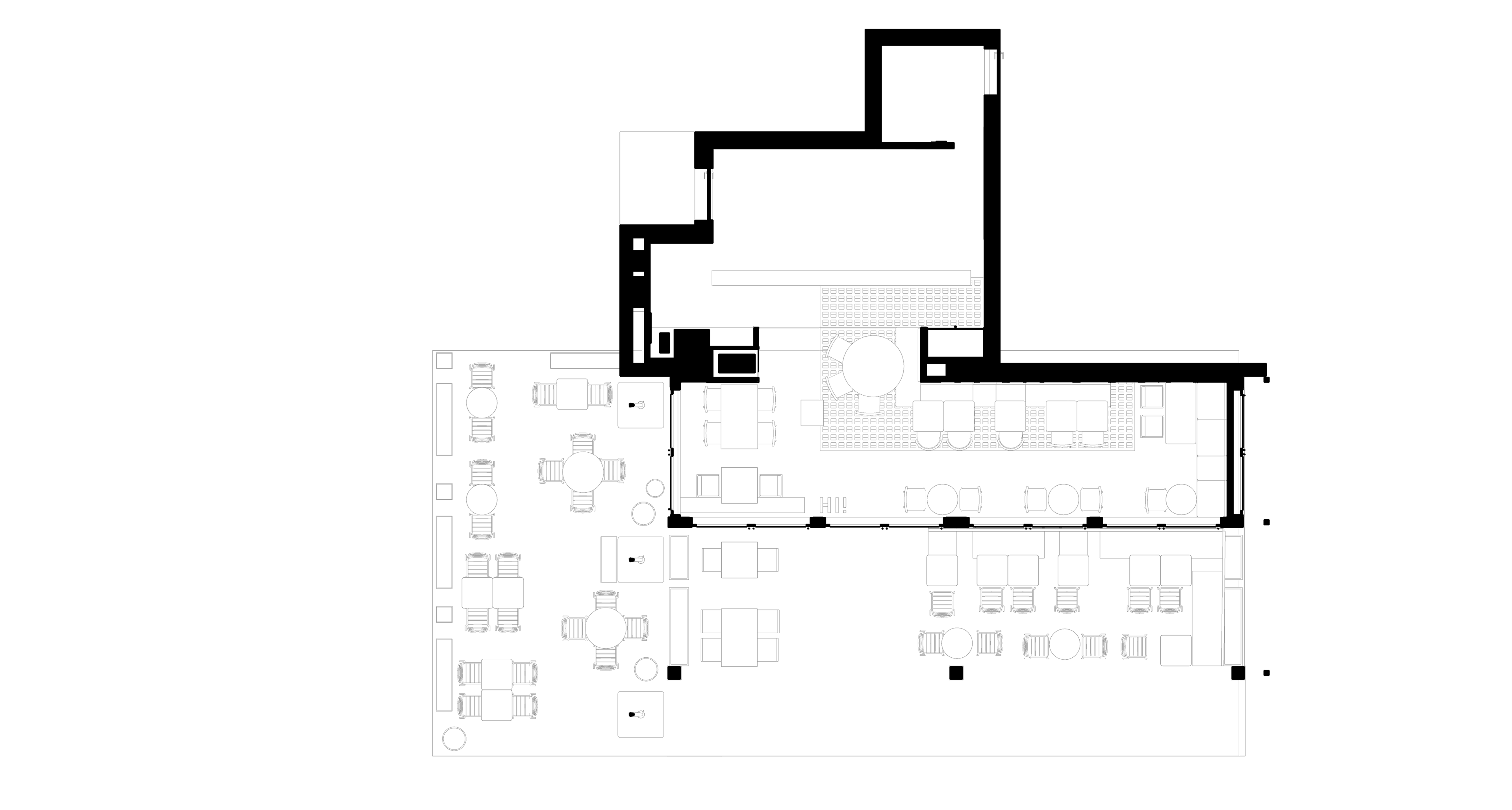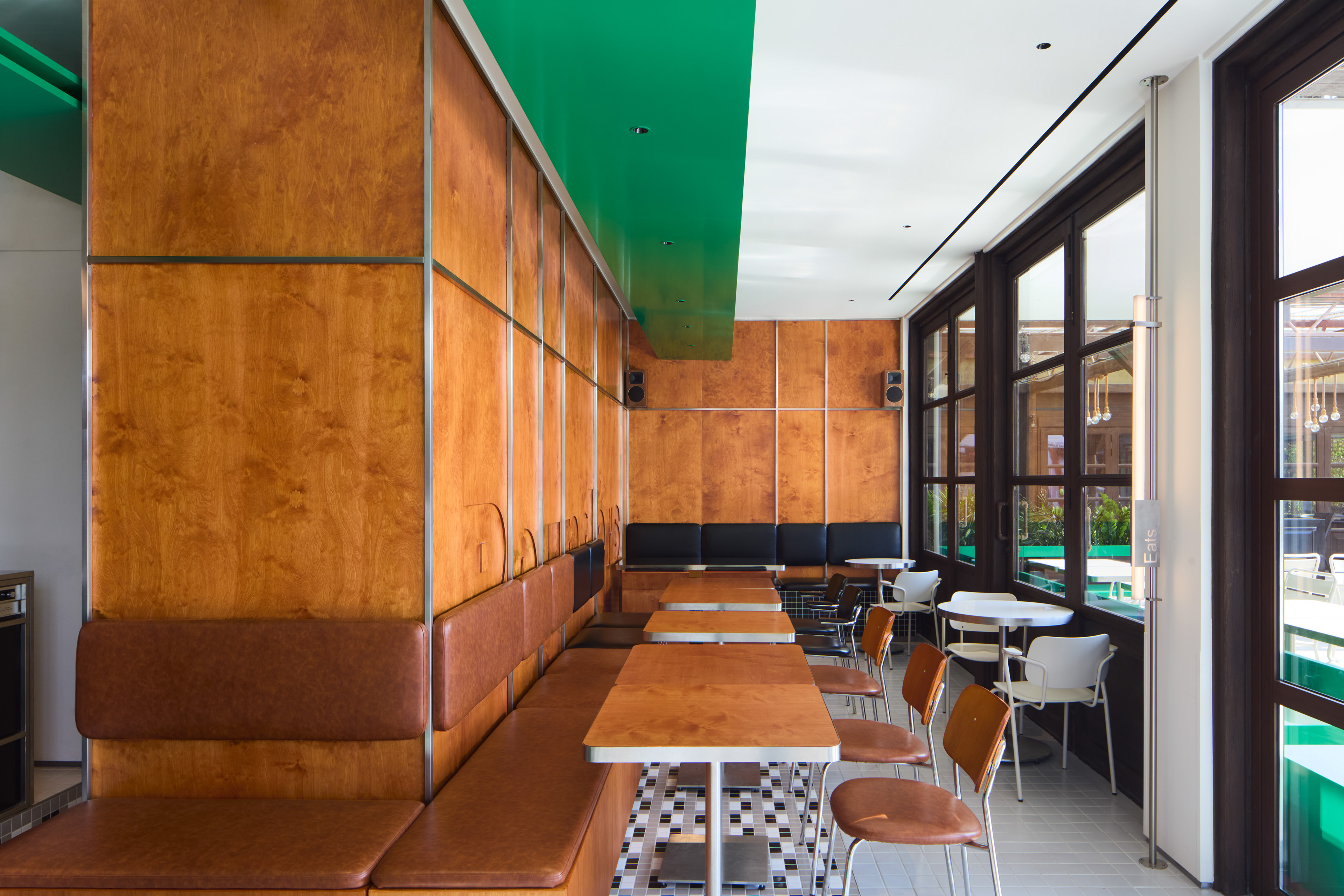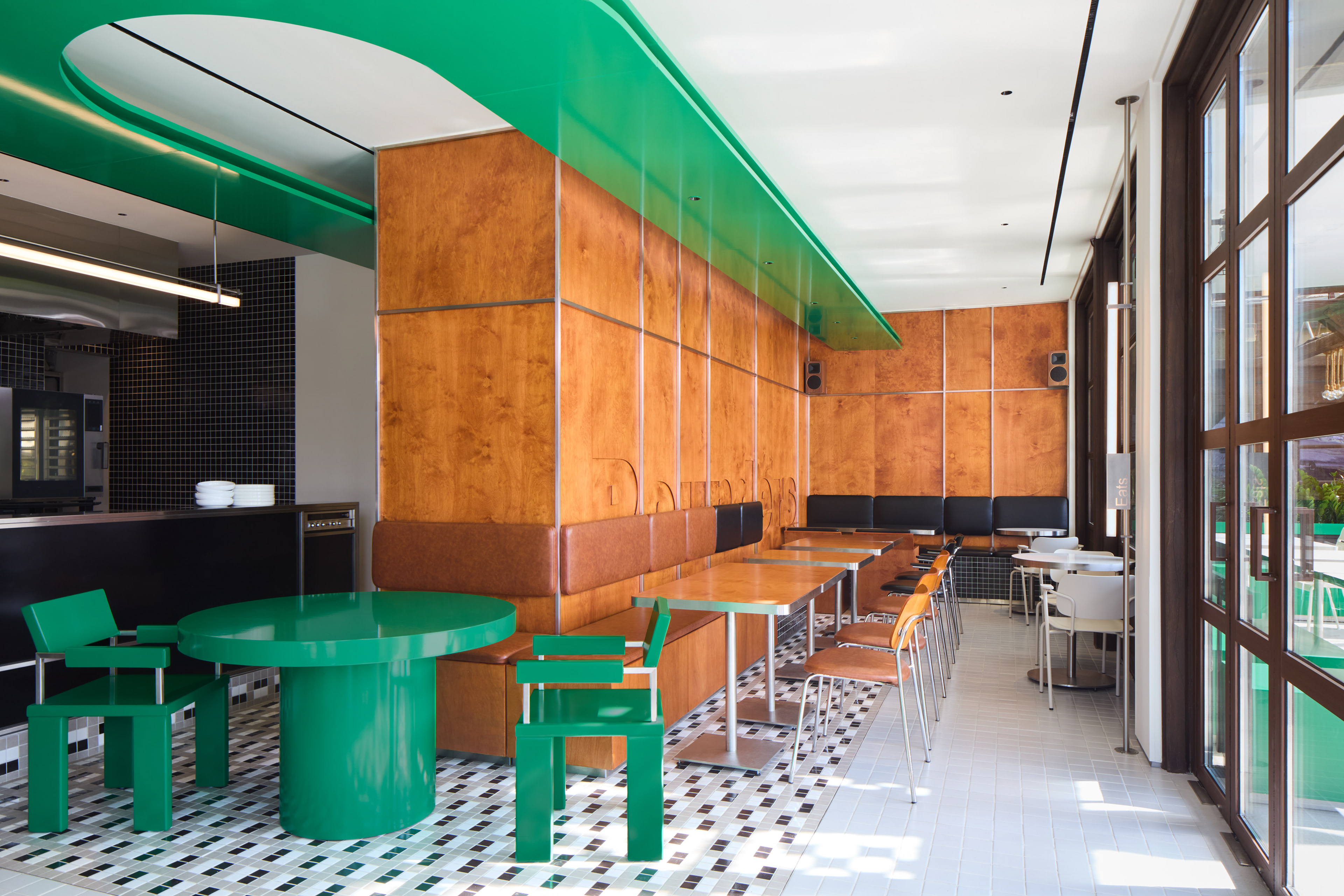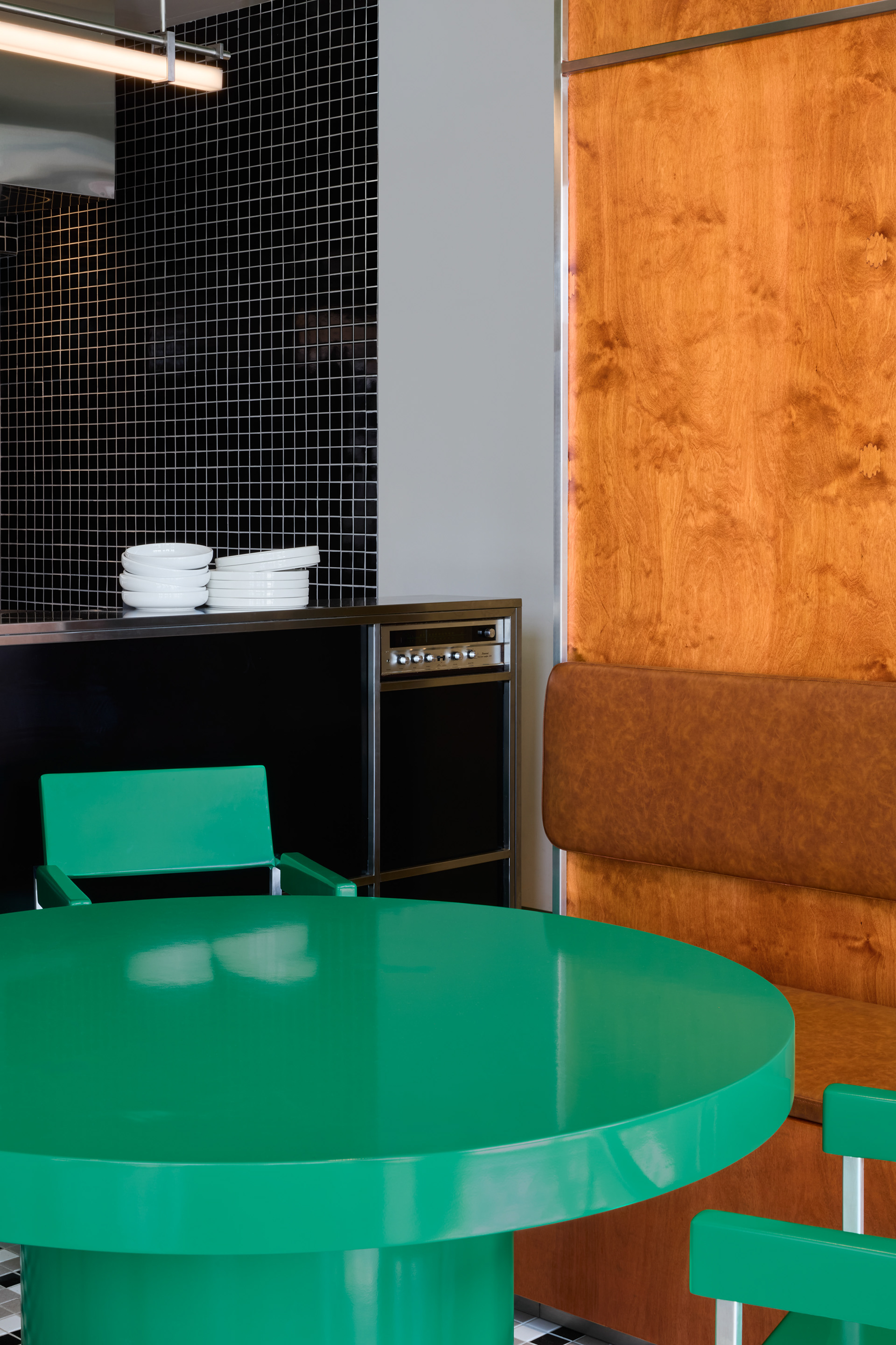 The interior is built on functional and simple materials: lacquered plywood, stainless steel, and multi-format tilesarranged in a strict graphic pattern. The black lacquered MDF used for the bar references 1960s furniture with its signature metal framing.