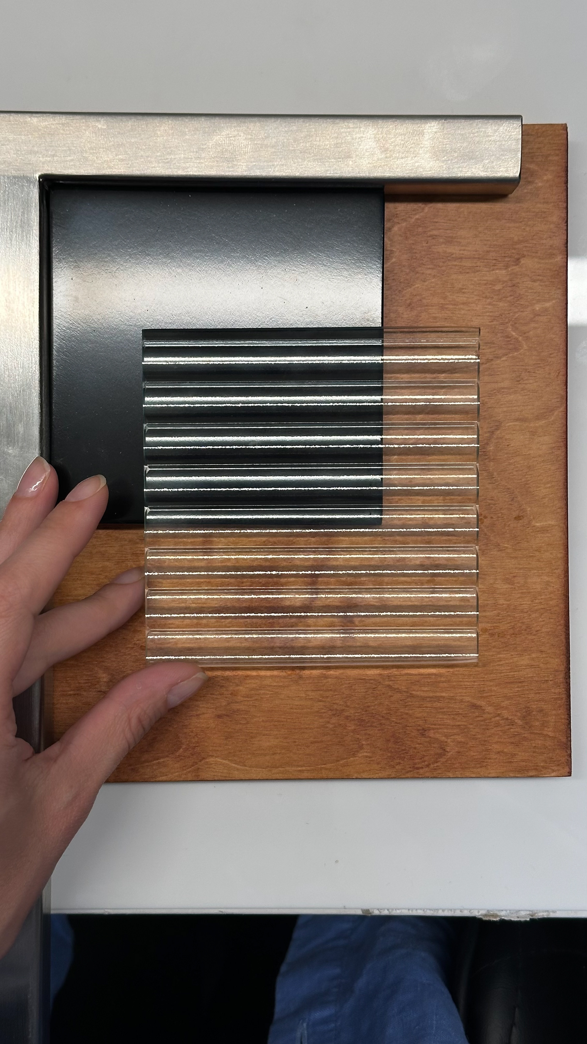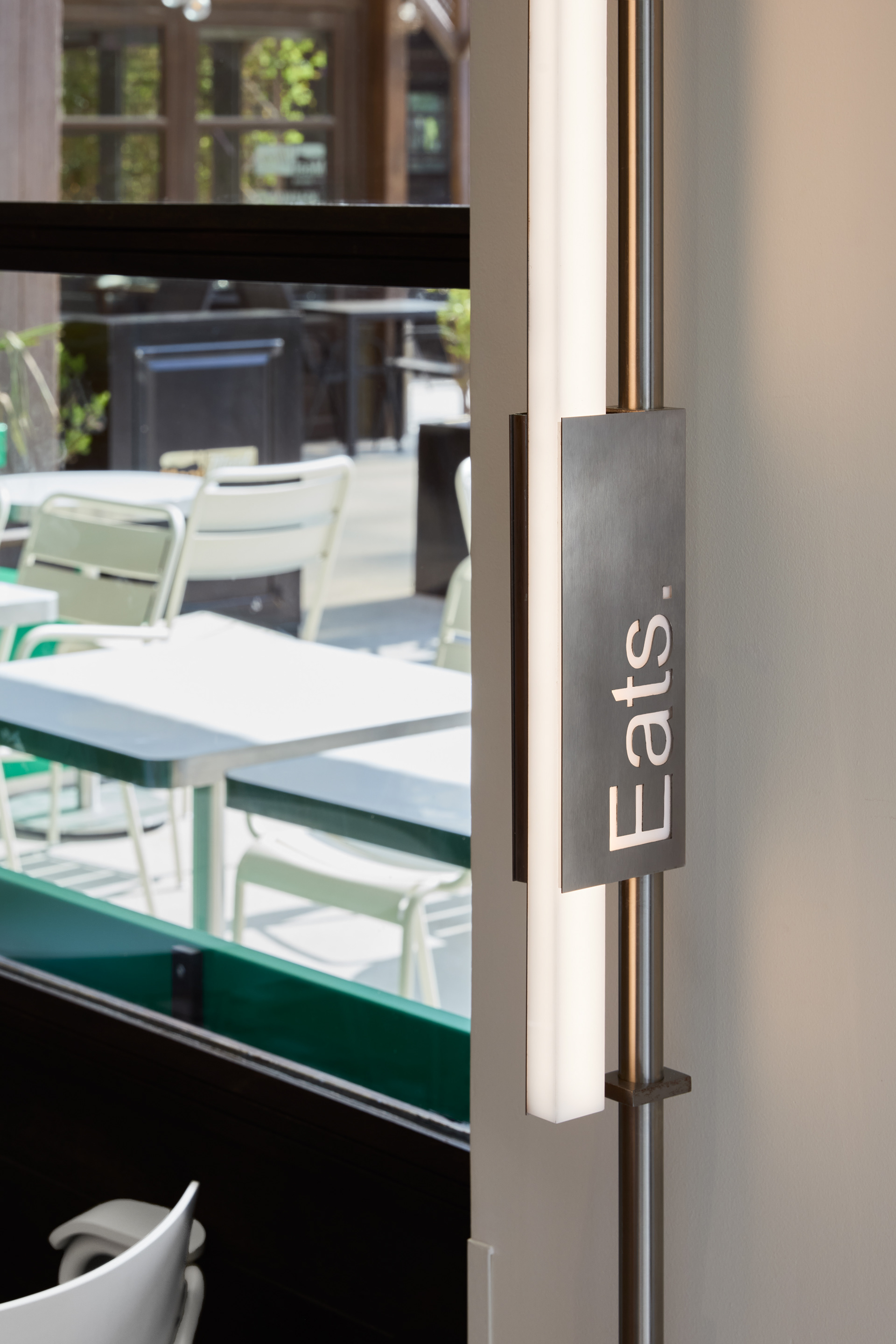 The theme of blending classic and modern elements continues in unique details, such as a sliding board concealing the ice cream station. Its design is inspired by a 1970s vintage calendar, but instead of round elements, it features square, pixel-like forms, with text explaining the etymology of the café’s name. The stainless steel and acrylic light fixtures, with cut-out brand descriptors (Brew, Eats), reinforce the aesthetics of industrial design from the past.