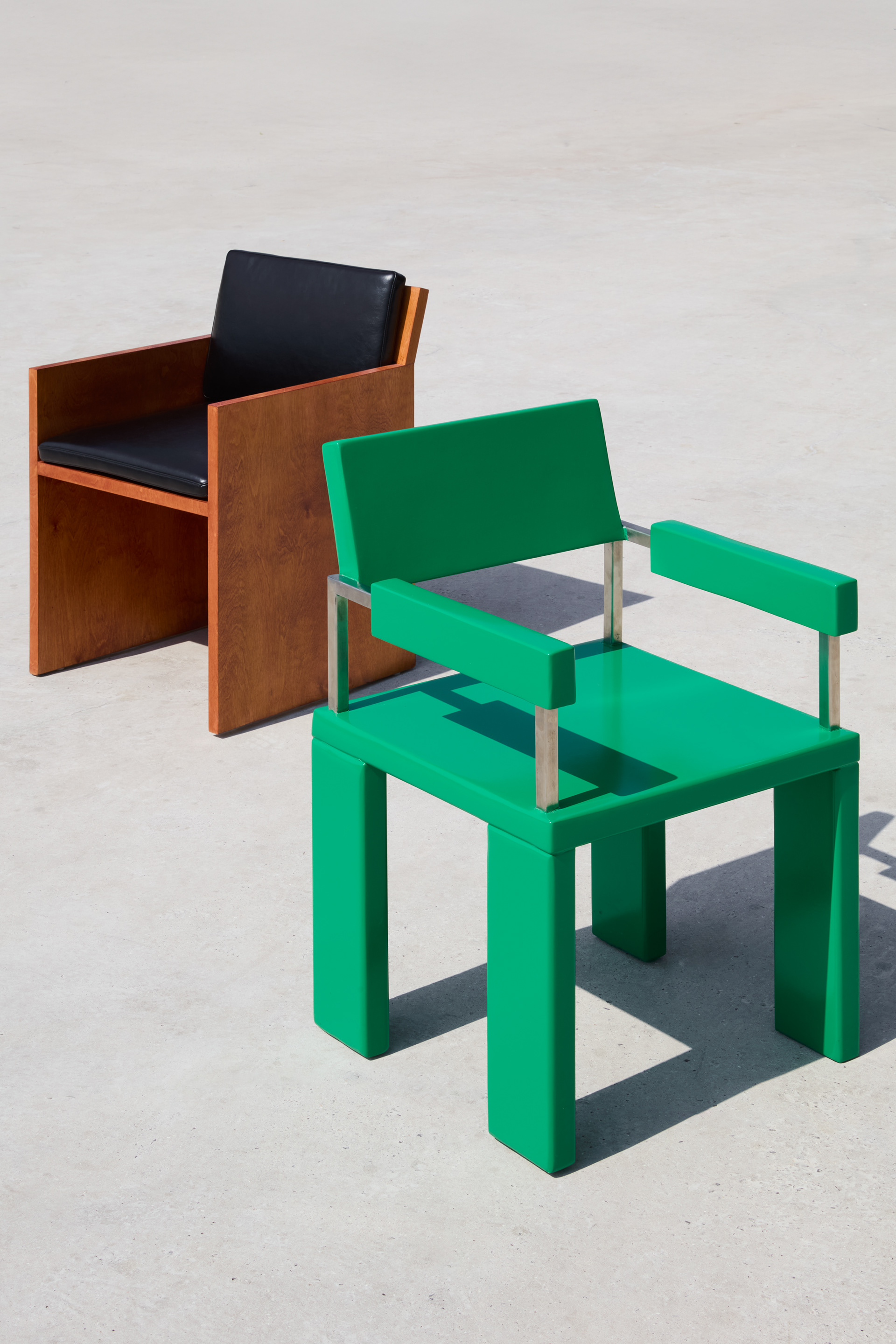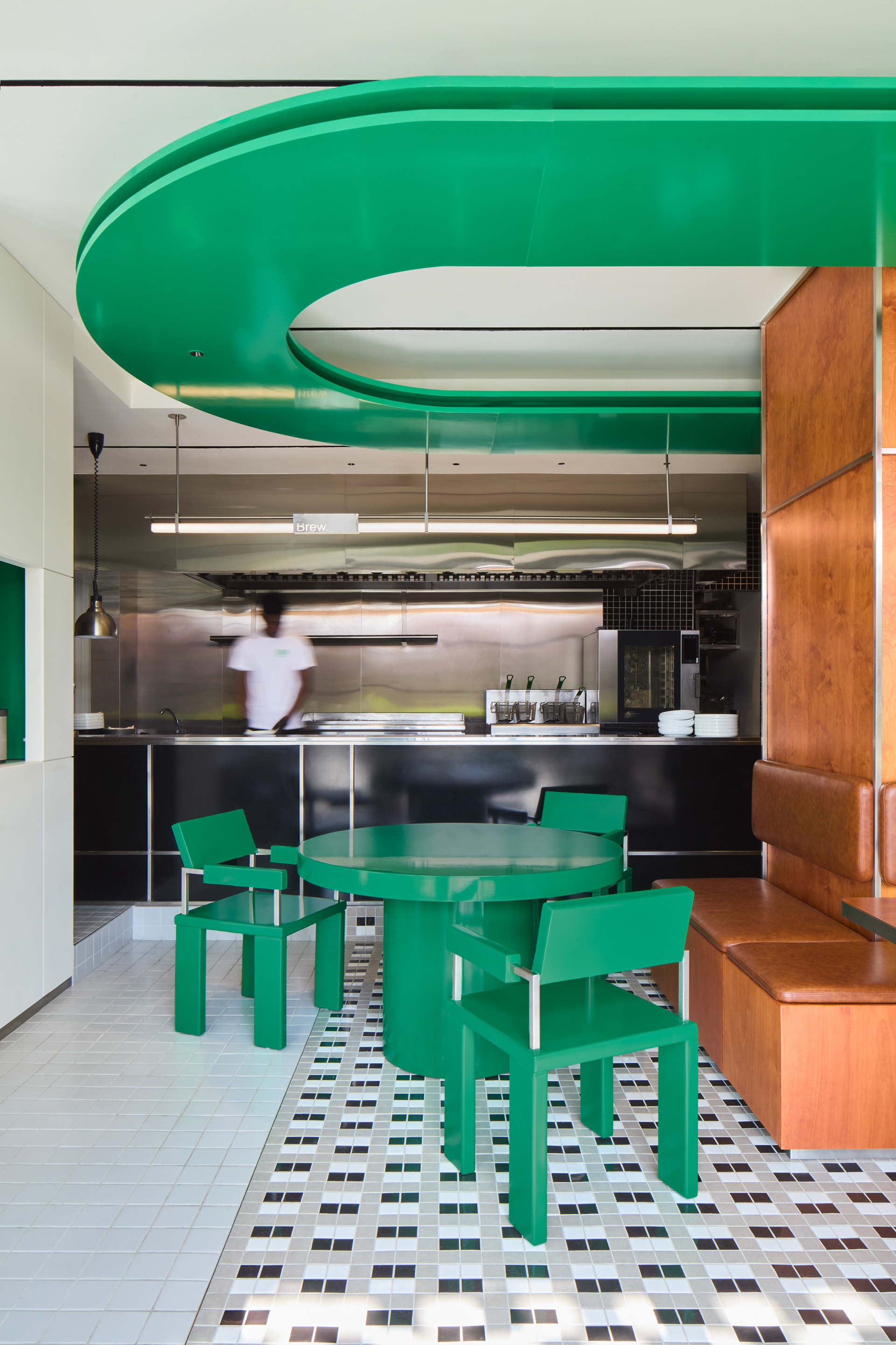 The project also incorporates the iconic Finnish Artek Likki chairs from 1951 in a soft milky shade, adding a refined touch. In contrast, an accent curved structure above the seating area, inspired by the capital letter of the café’s name, serves as a focal point. Beneath it, angular chairs reminiscent of modular construction pieces reinforce the play on form.
