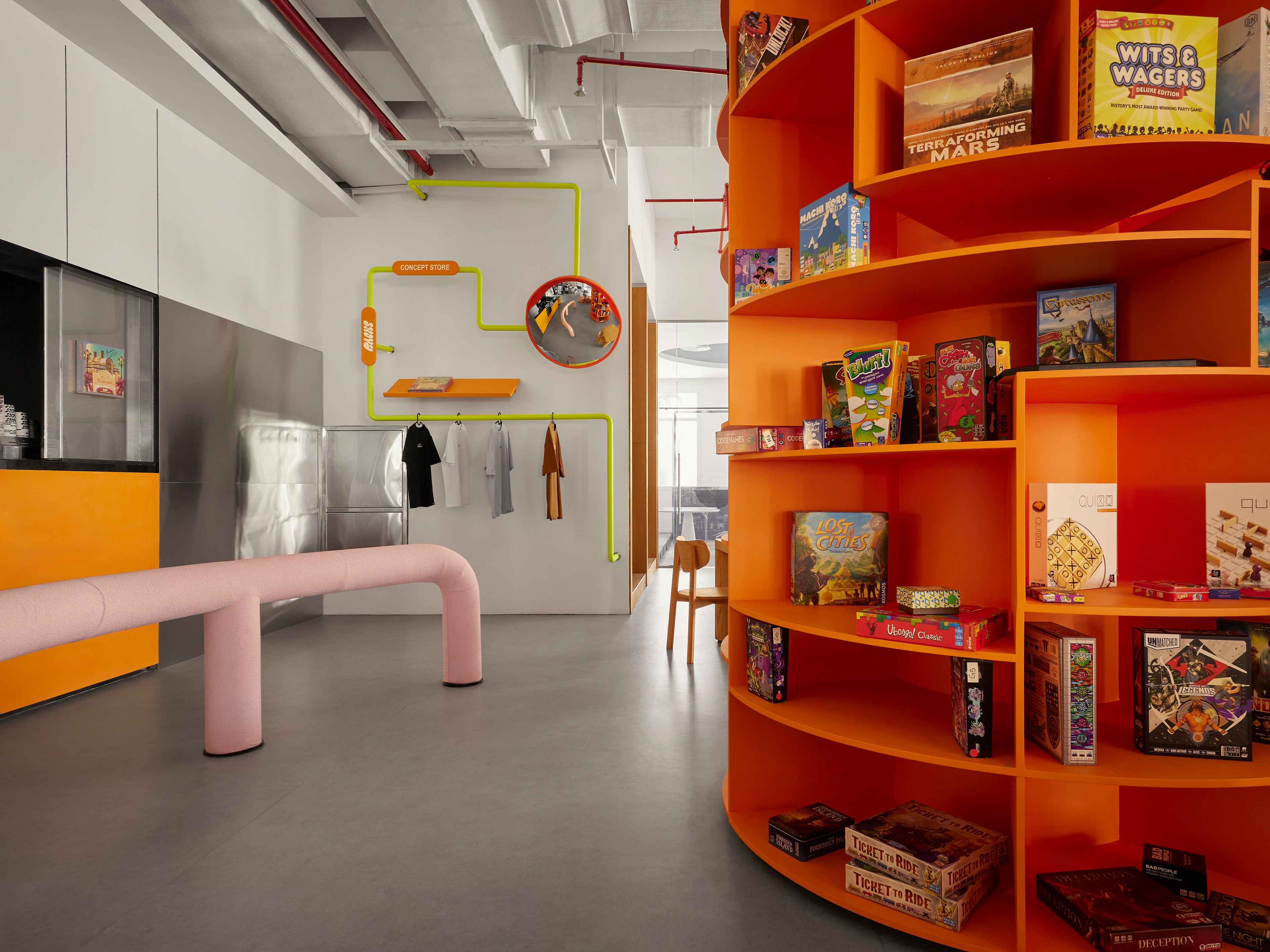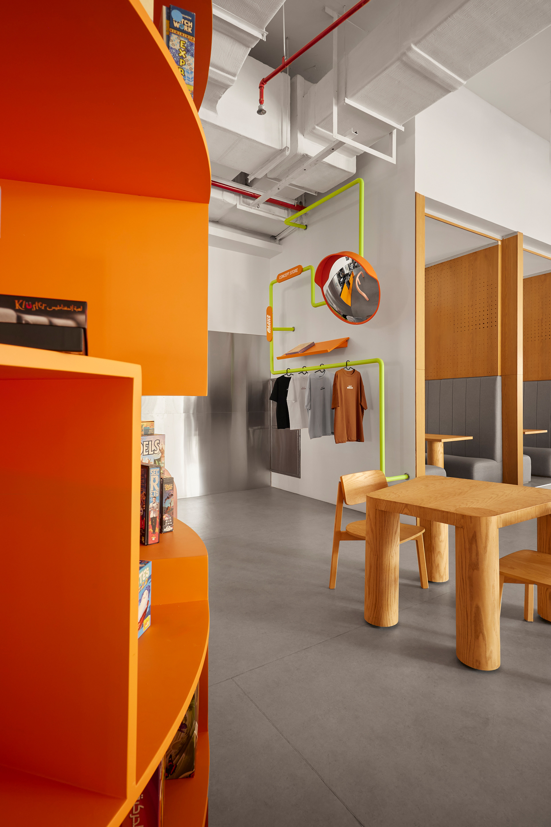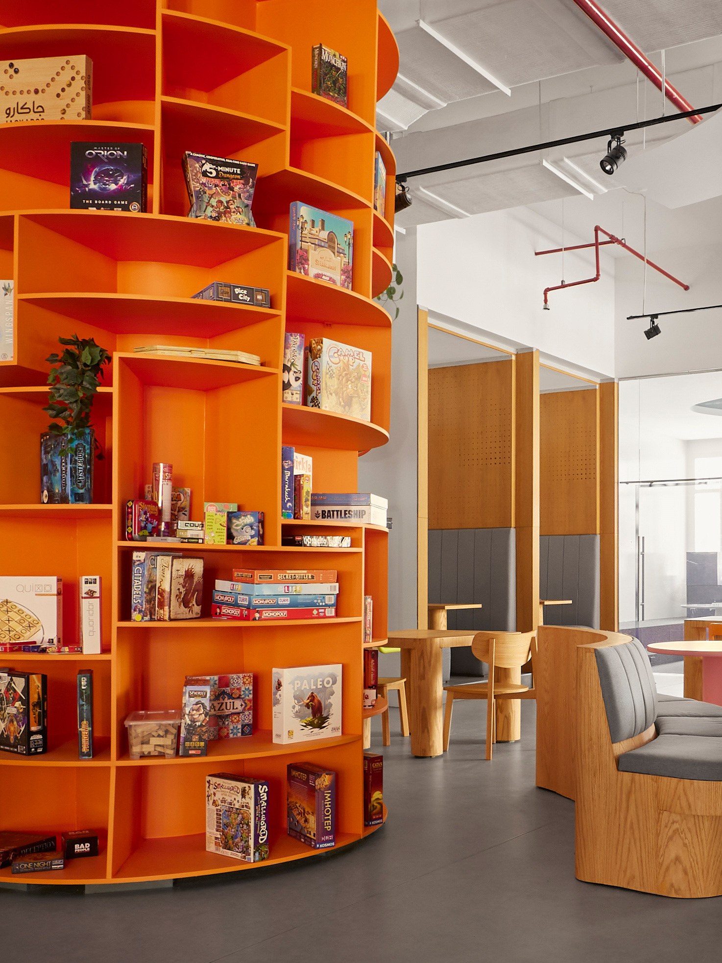 The main design solution was to use the idea of a board game as the foundation for the café’s layout. Upon receiving the space, they discovered a large circular column right in the center. This led to the idea of turning a drawback into an advantage by wrapping the column with asymmetrically placed orange shelves, creating a sense of dynamism. As a result, this central feature becomes a focal point, with different guest zones forming around it.