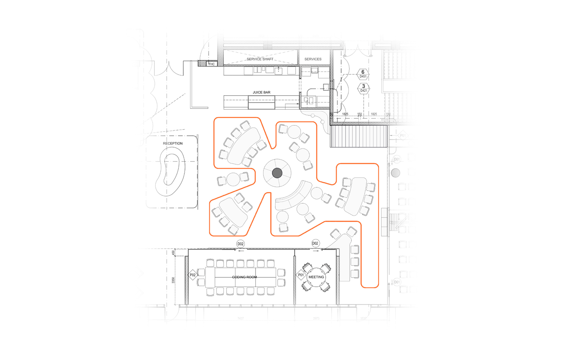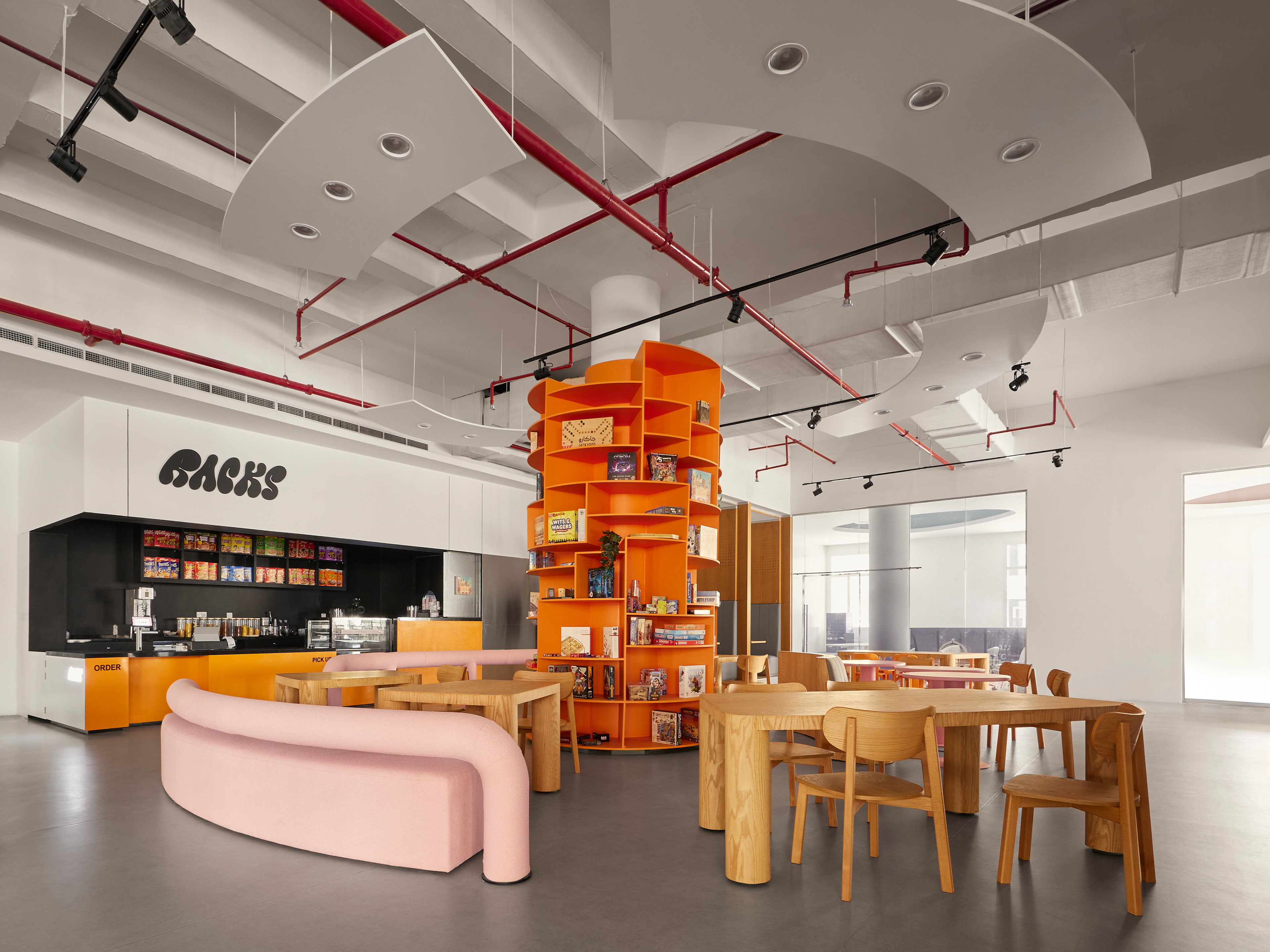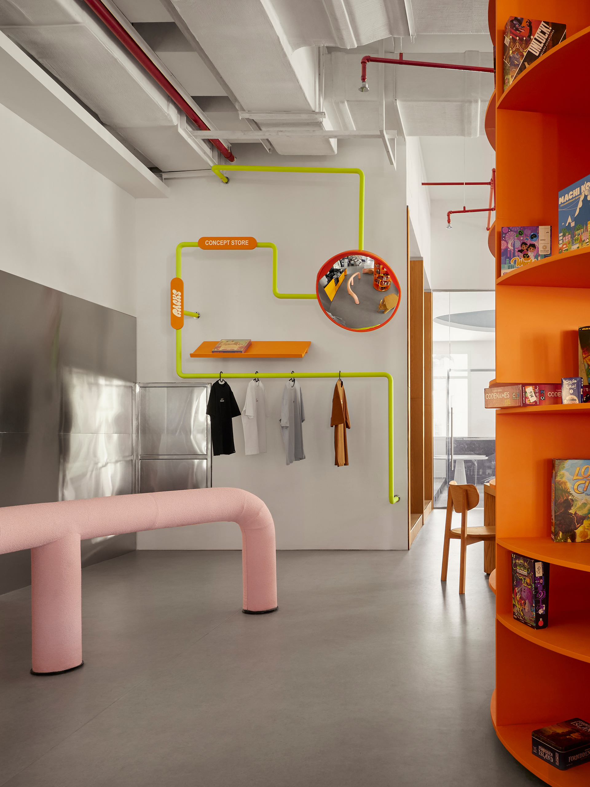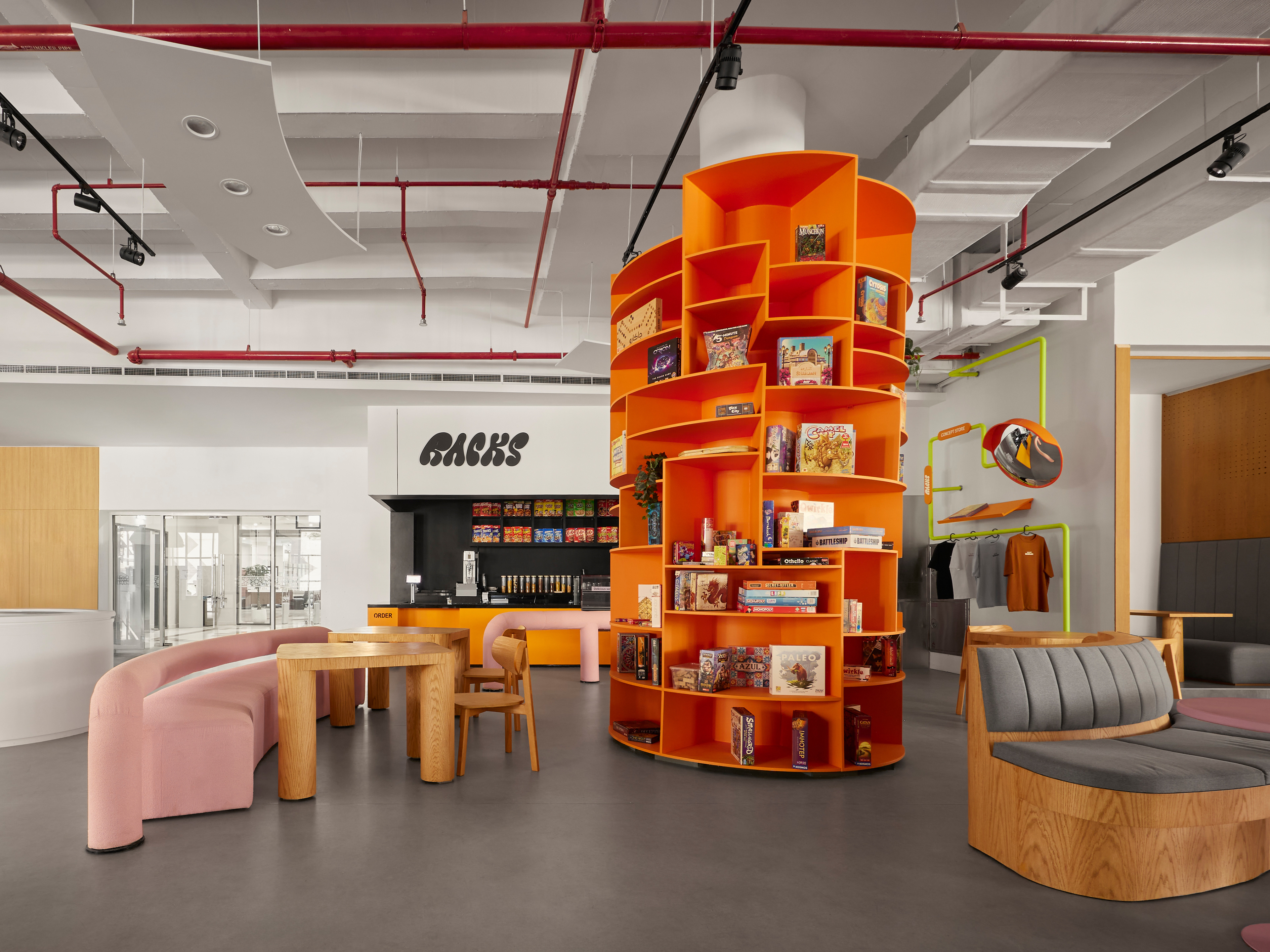 The main design solution was to use the idea of a board game as the foundation for the café’s layout. Upon receiving the space, they discovered a large circular column right in the center. This led to the idea of turning a drawback into an advantage by wrapping the column with asymmetrically placed orange shelves, creating a sense of dynamism. As a result, this central feature becomes a focal point, with different guest zones forming around it.