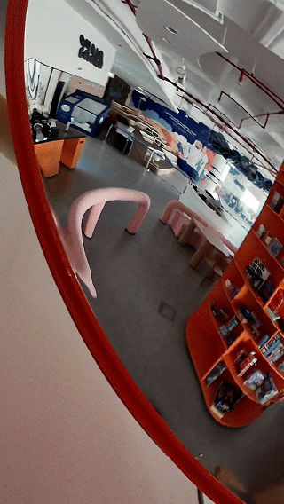 A notable feature is the merch area, designed with surreal elements: pipes and a distorted mirror enhance the playful atmosphere. Nearby, there is a wall designed for collecting Polaroid photos of all the café’s visitors.