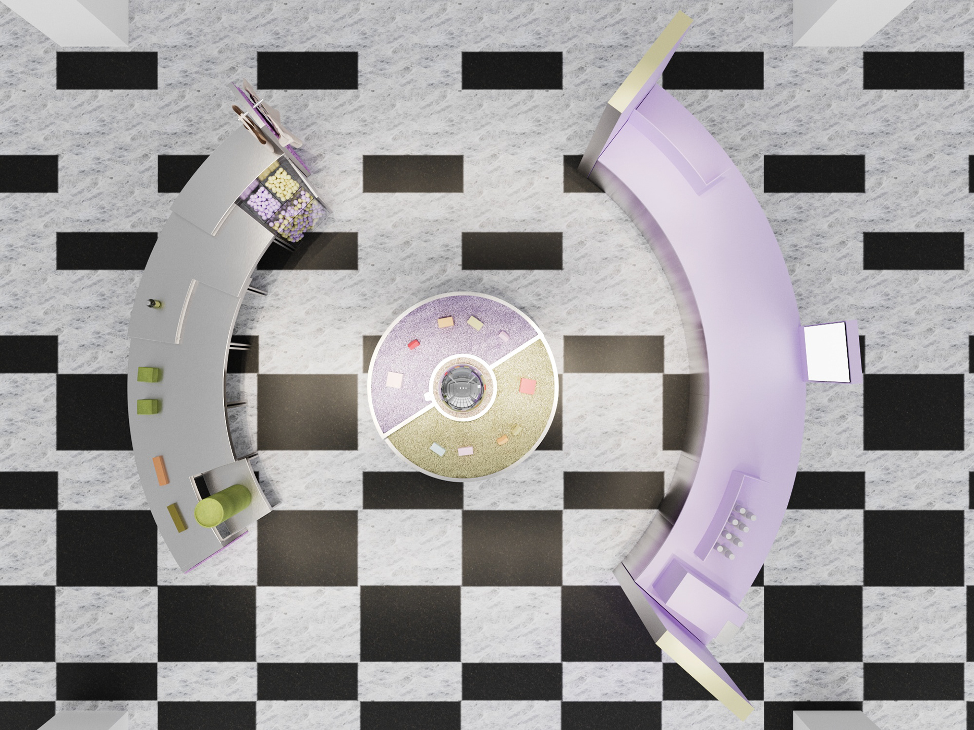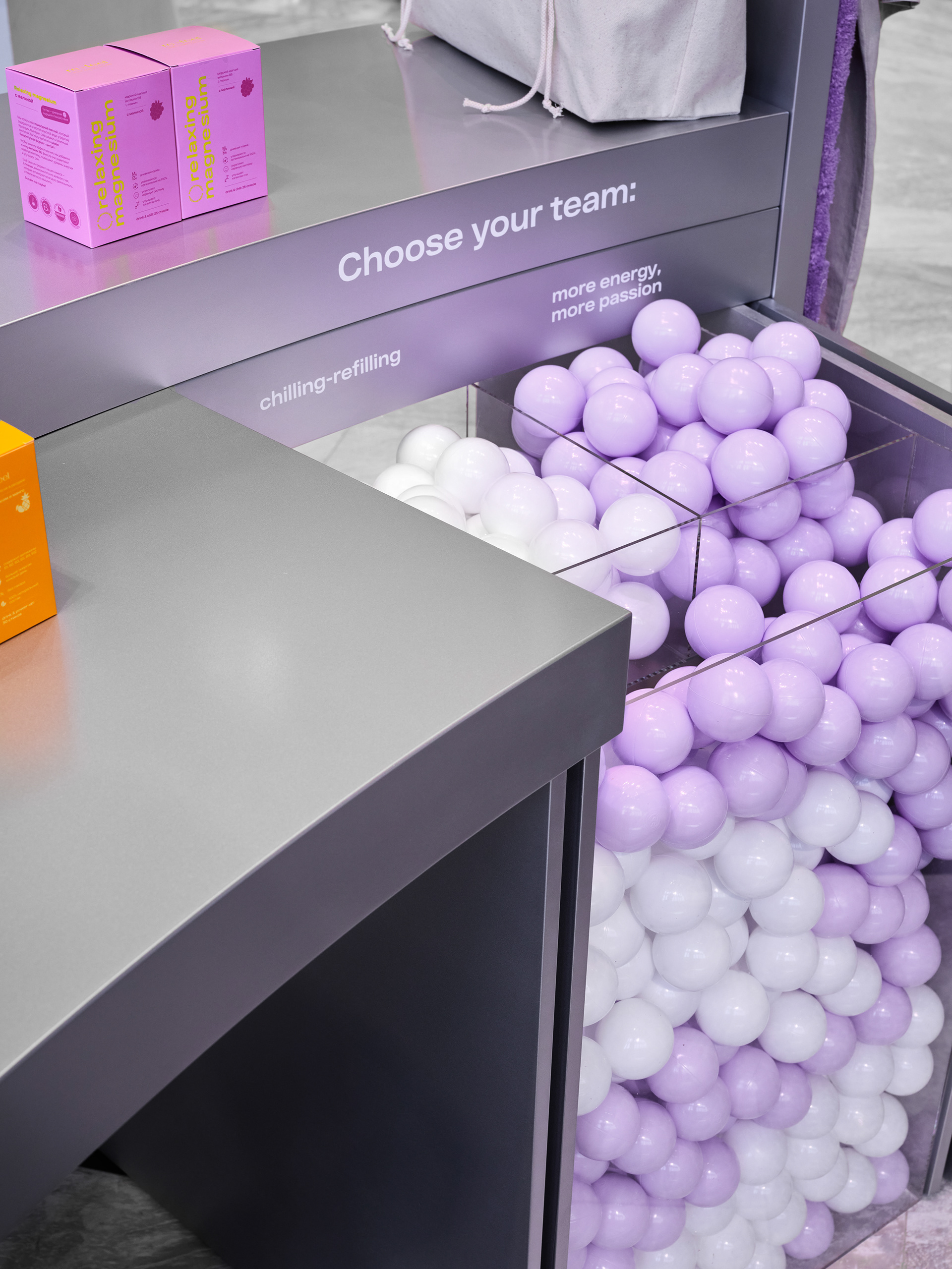 At the center of the composition is a showcase featuring the brand’s products, flanked by a wellness bar and a merch area with interactive boxes. This creates a space that feels both open and cozy.