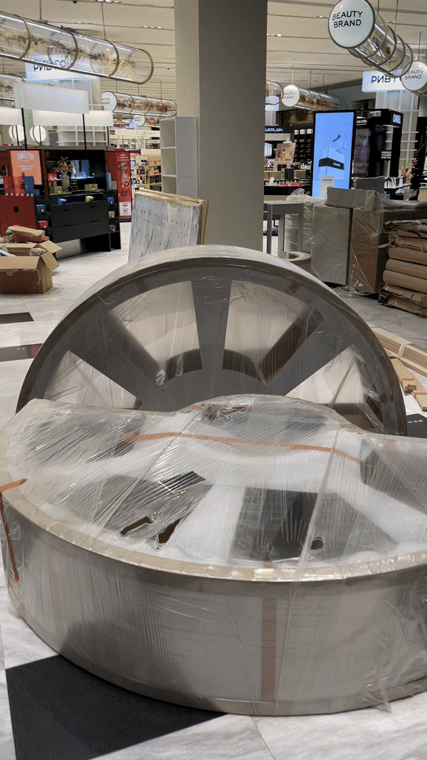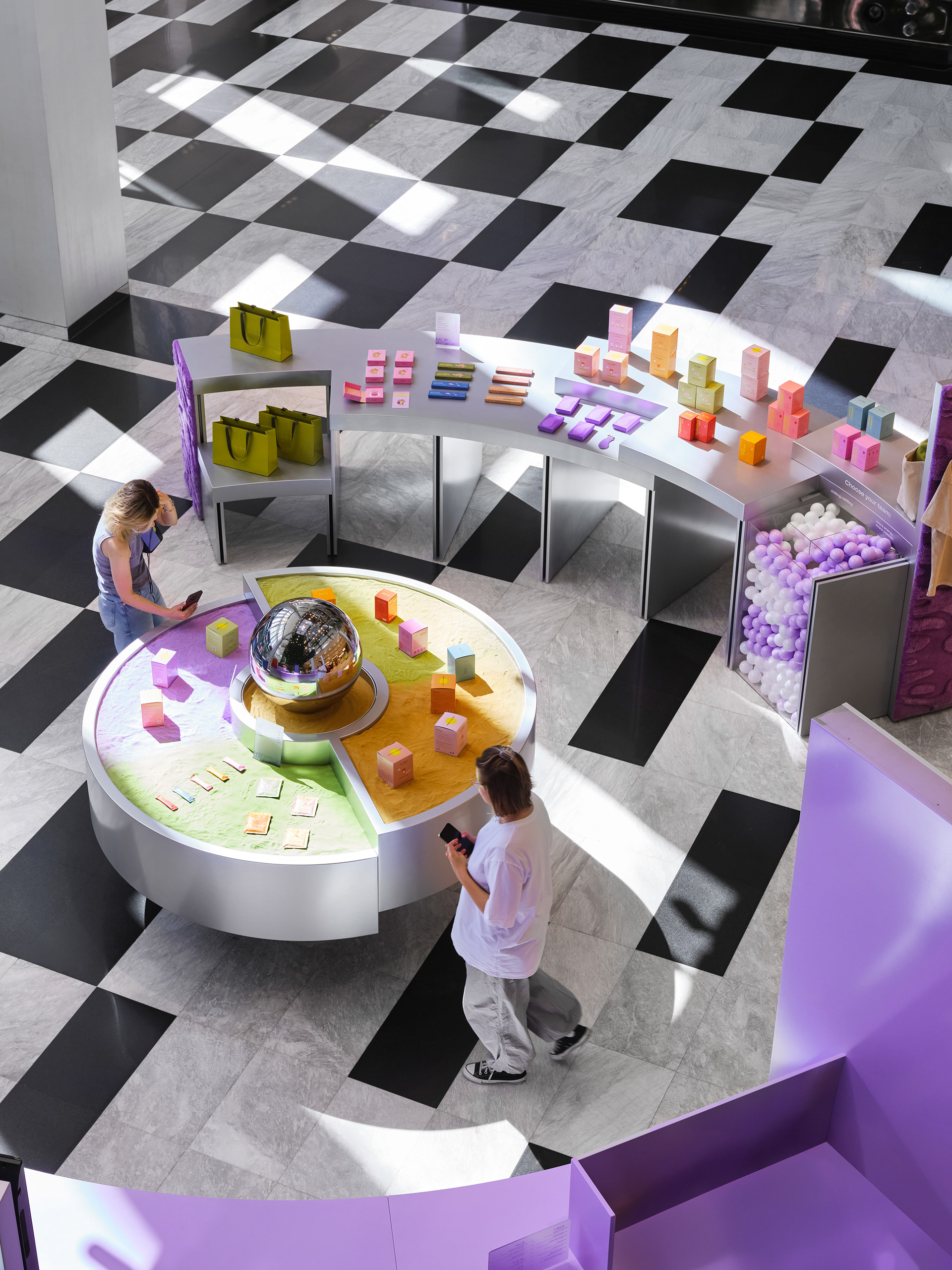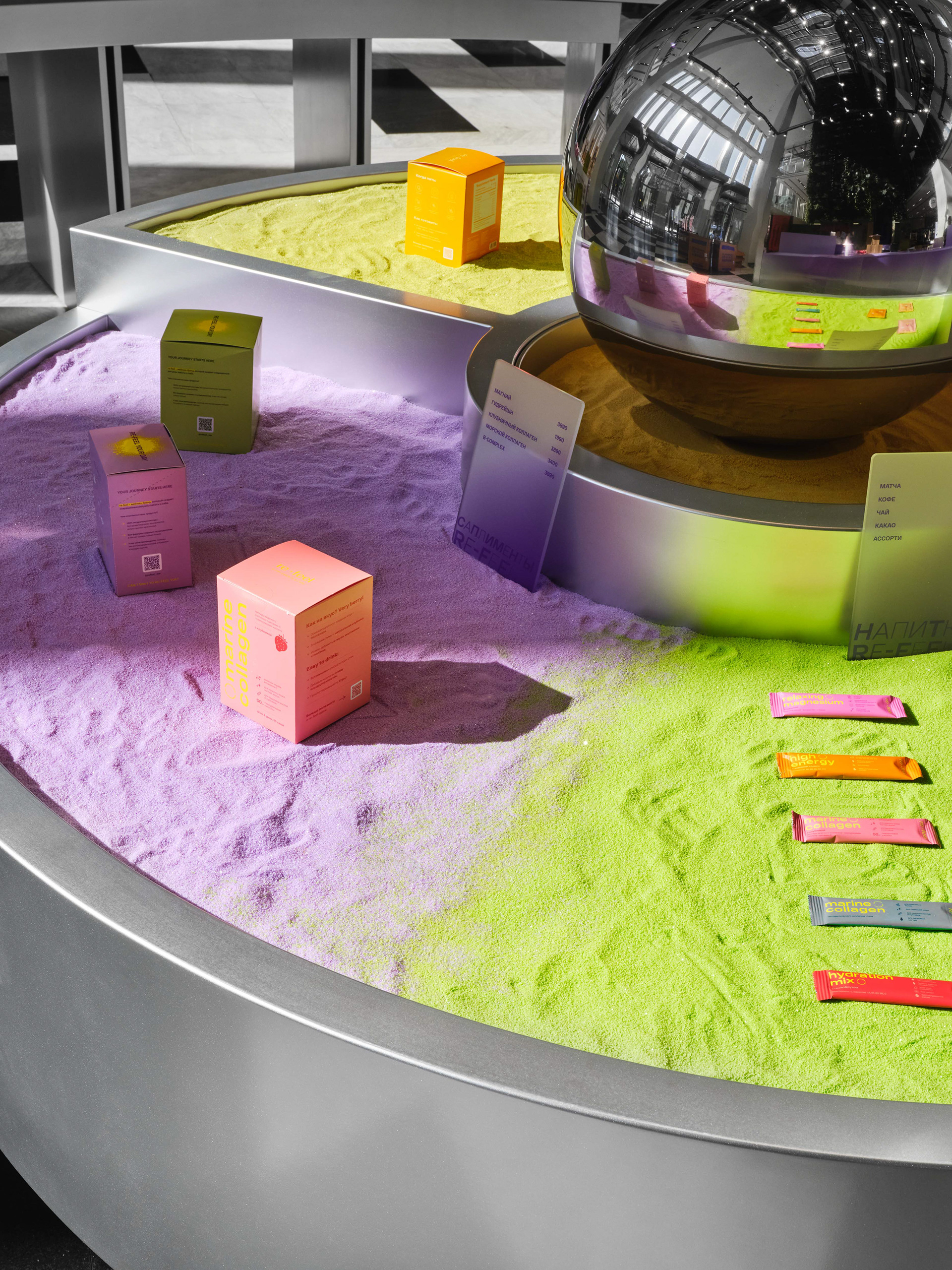 Re-feel’s products are natural, beneficial, and technologically advanced. To highlight these qualities, metallic-effect surfaces and soft color gradients were chosen. For a variety of tactile experiences, materials like sand and tufted rugs from Kovrua were incorporated. To visually balance the space, a large metallic sphere was placed at the center, embodying the technological essence of the brand’s products.