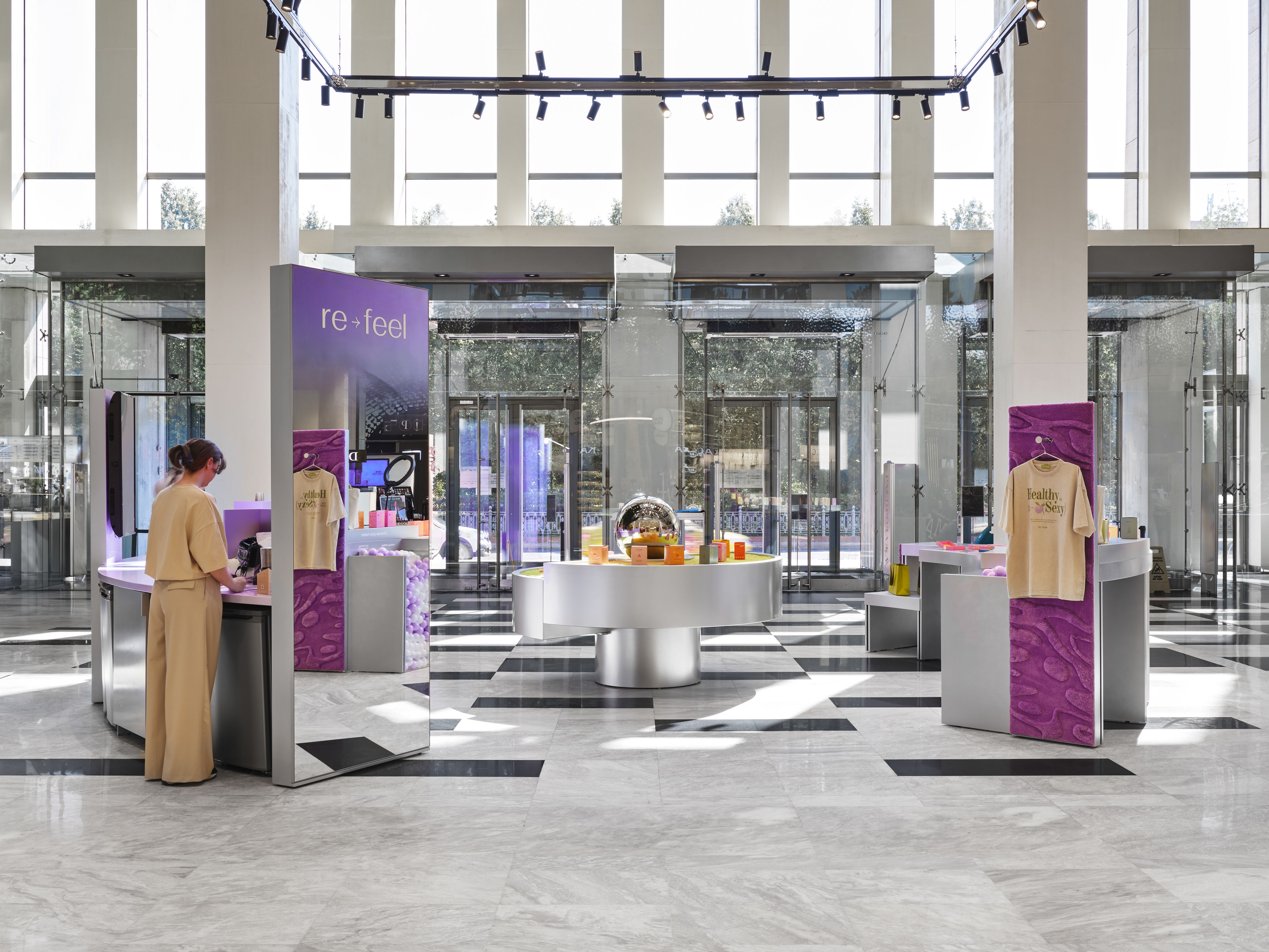 Care lies at the heart of the concept for re-feel’s new wellness pop-up project. The focus is on how visitors feel and how their experience can be enhanced. The space is designed as a booster station—a place to quickly recharge and gain a powerful boost for both emotional and physical well-being.