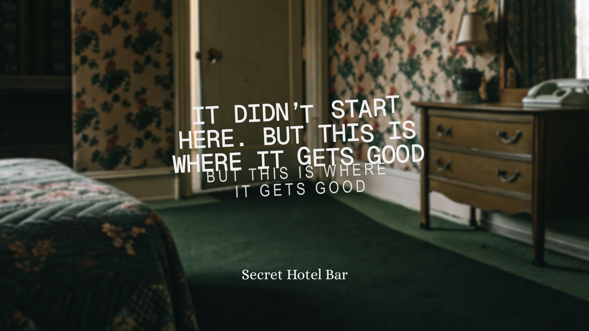 The third concept deepened the sense of enigma through fragmented letterforms seen “through a keyhole.” And the fourth introduced a cinematic detective motif — a handwritten note left behind, pointing you to a room number with no explanation.