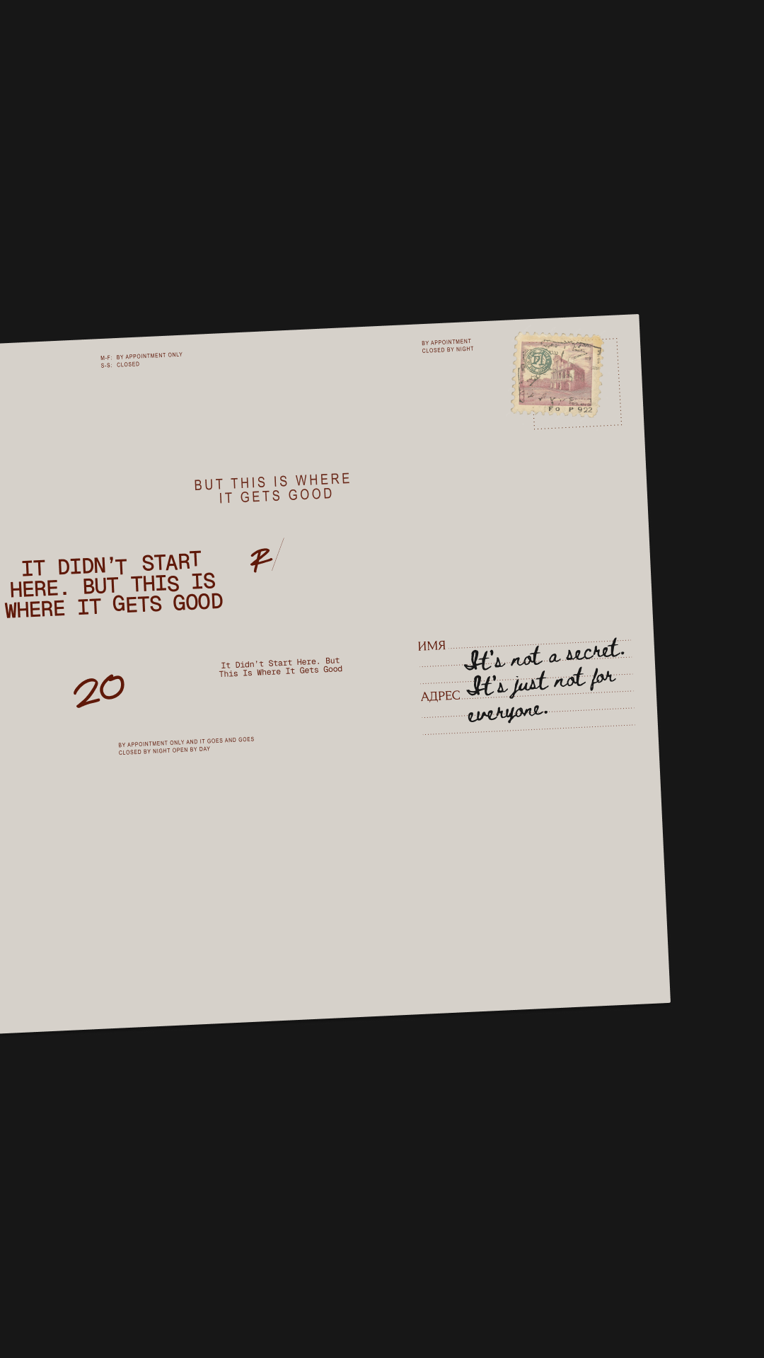After testing several directions, we chose a final identity that expresses this mood most clearly. A neat sheet of paper lies on the table, typewritten, with a short handwritten signature at the bottom. No address, no name. A message left only to you. The logo reflects the same balance: the random rhythm of printed text and the warm intonation of a personal trace.
