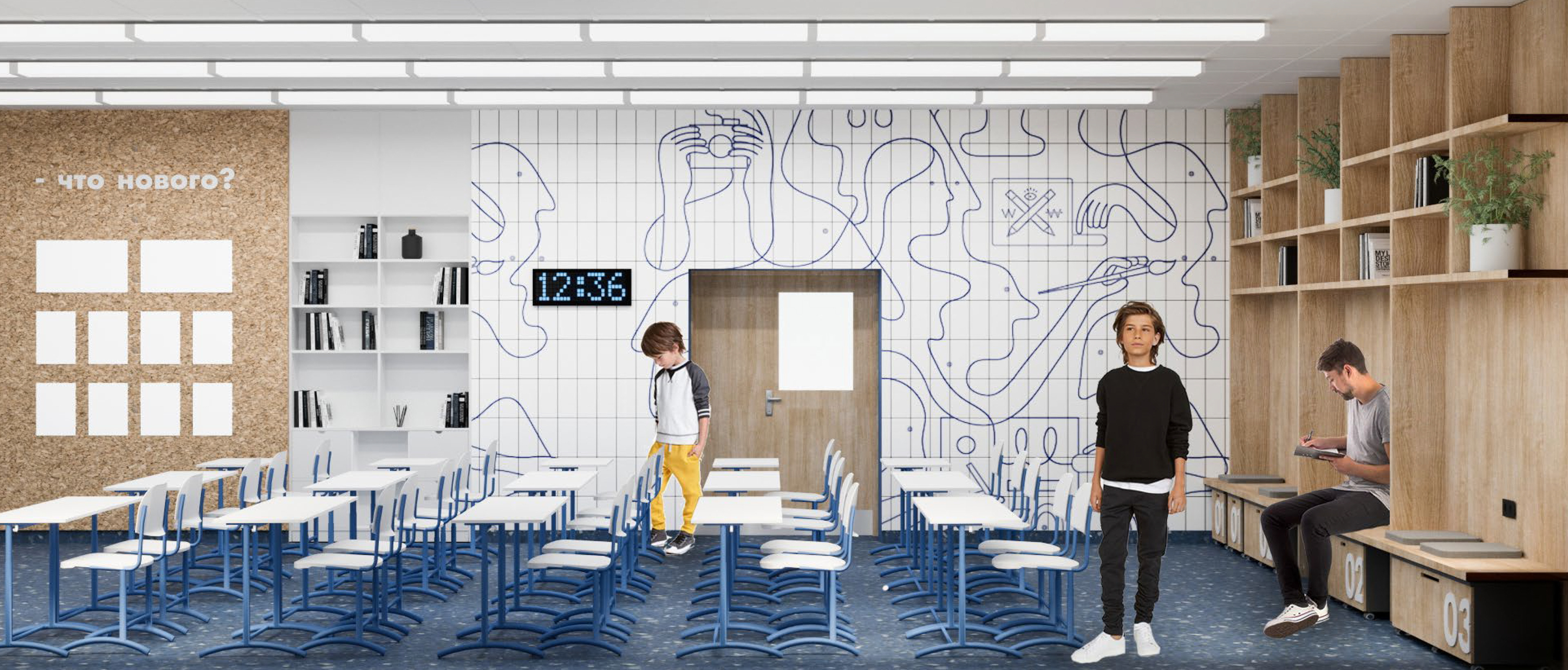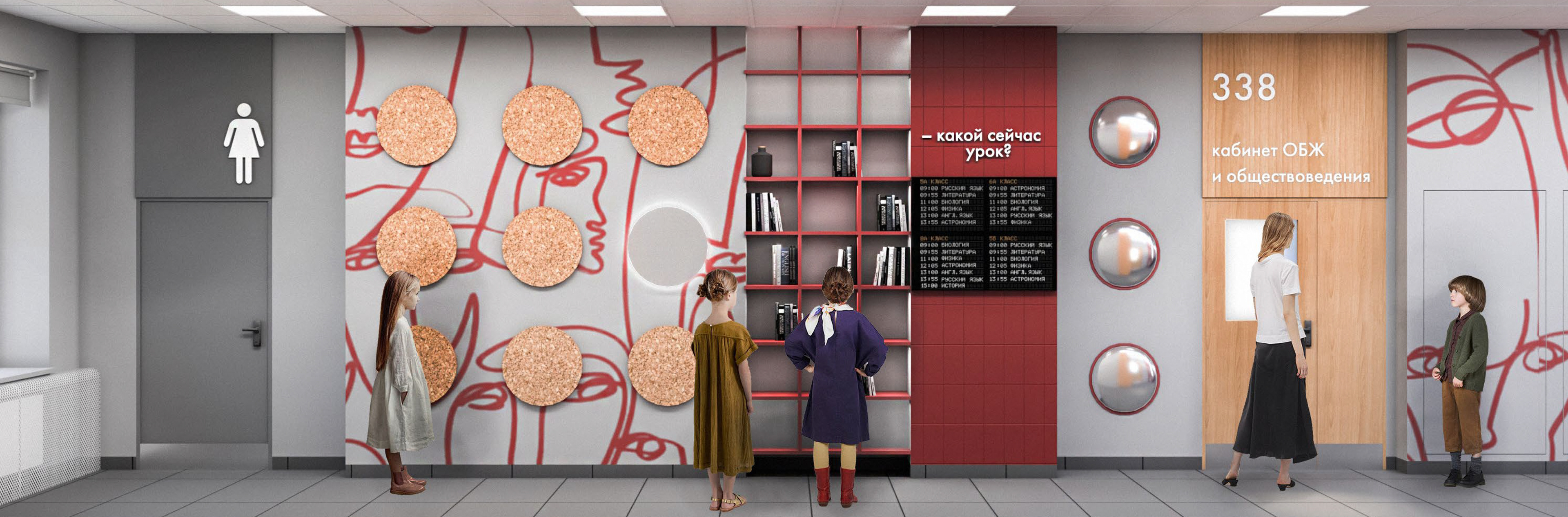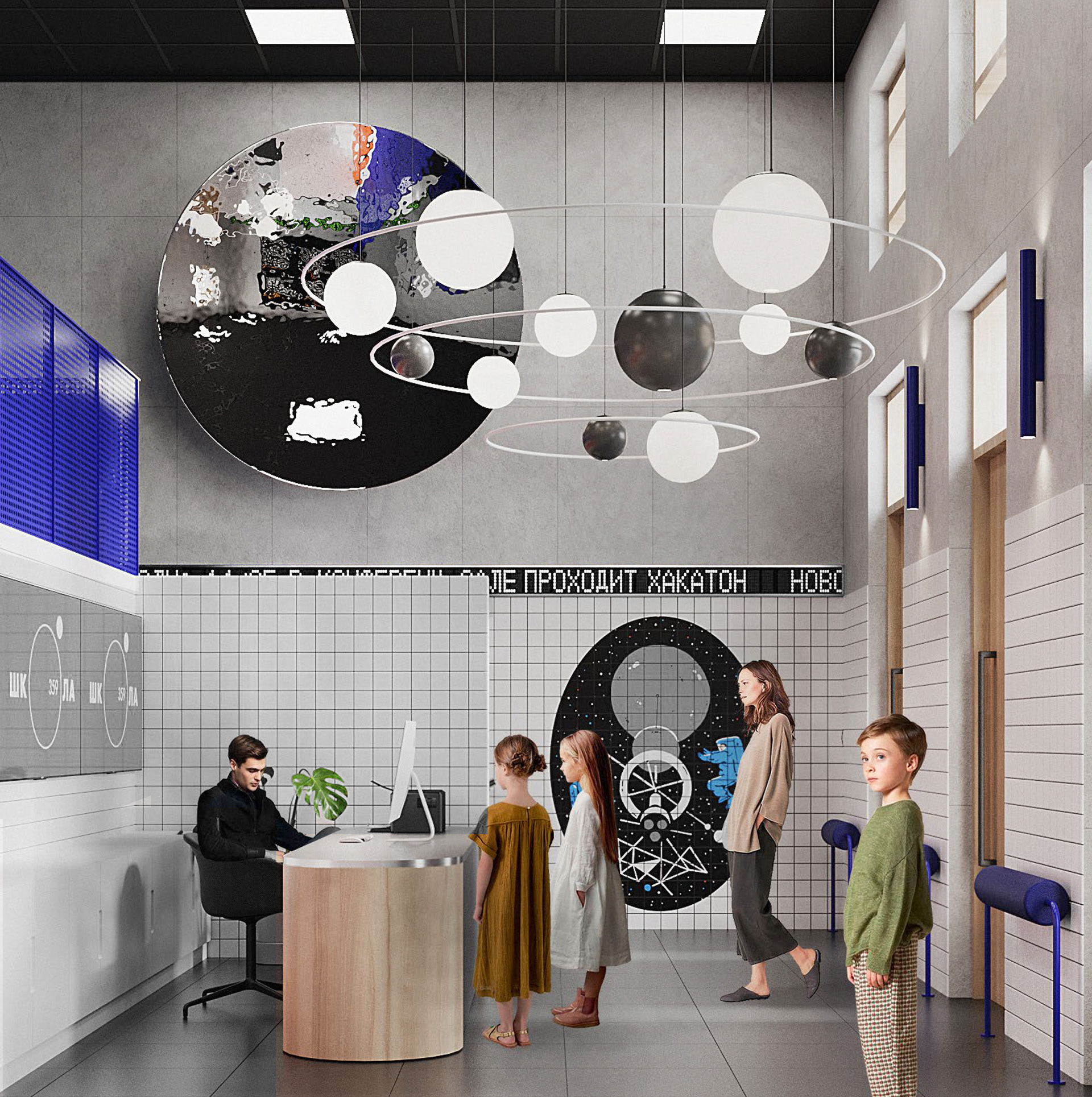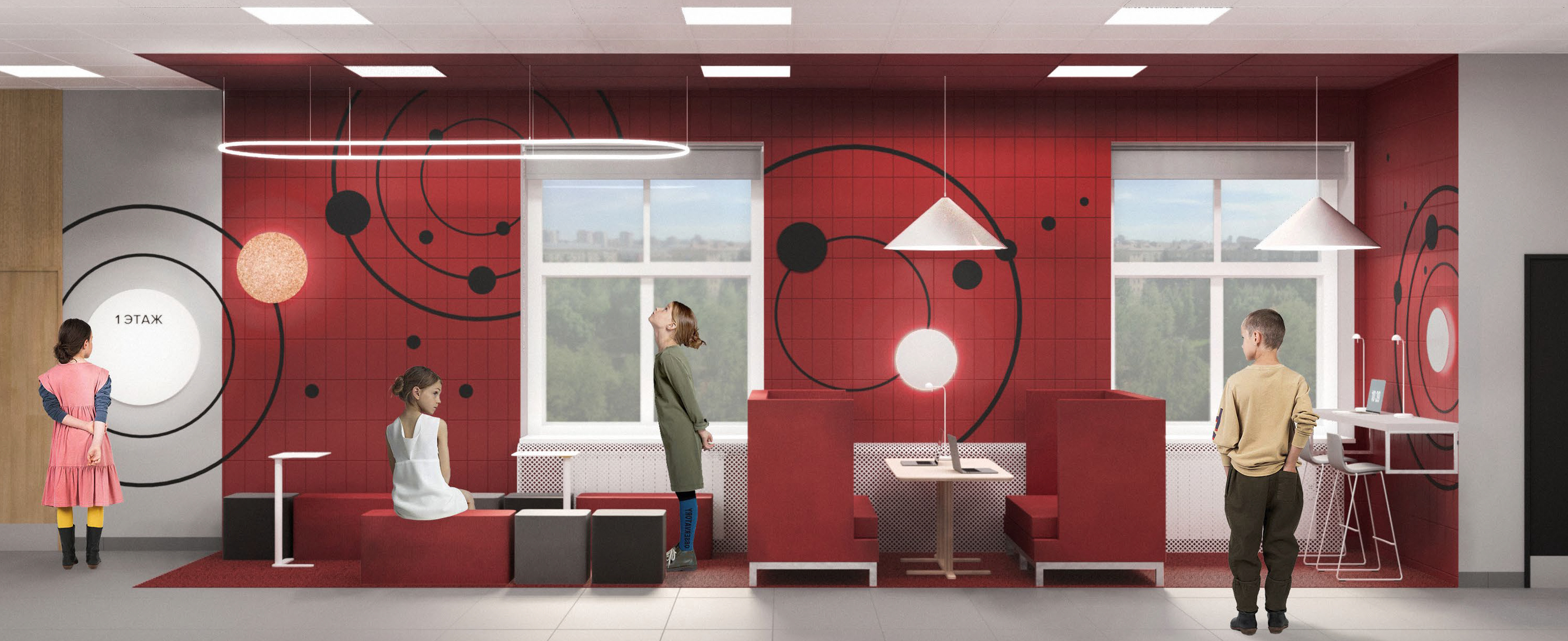 However, to inspire children and encourage them to create and explore the world around them, it is not necessary to literally depict other planets or rockets. In the context of a school, any familiar object in an unfamiliar location can already direct thoughts in a new and interesting direction. Abstract wall graphics, suspended lights in the form of balloons and rings, and finishing materials which are as atypical of the school as possible, all create an unusual, but comfortable and neutral enough environment for children to engage with their creativity.