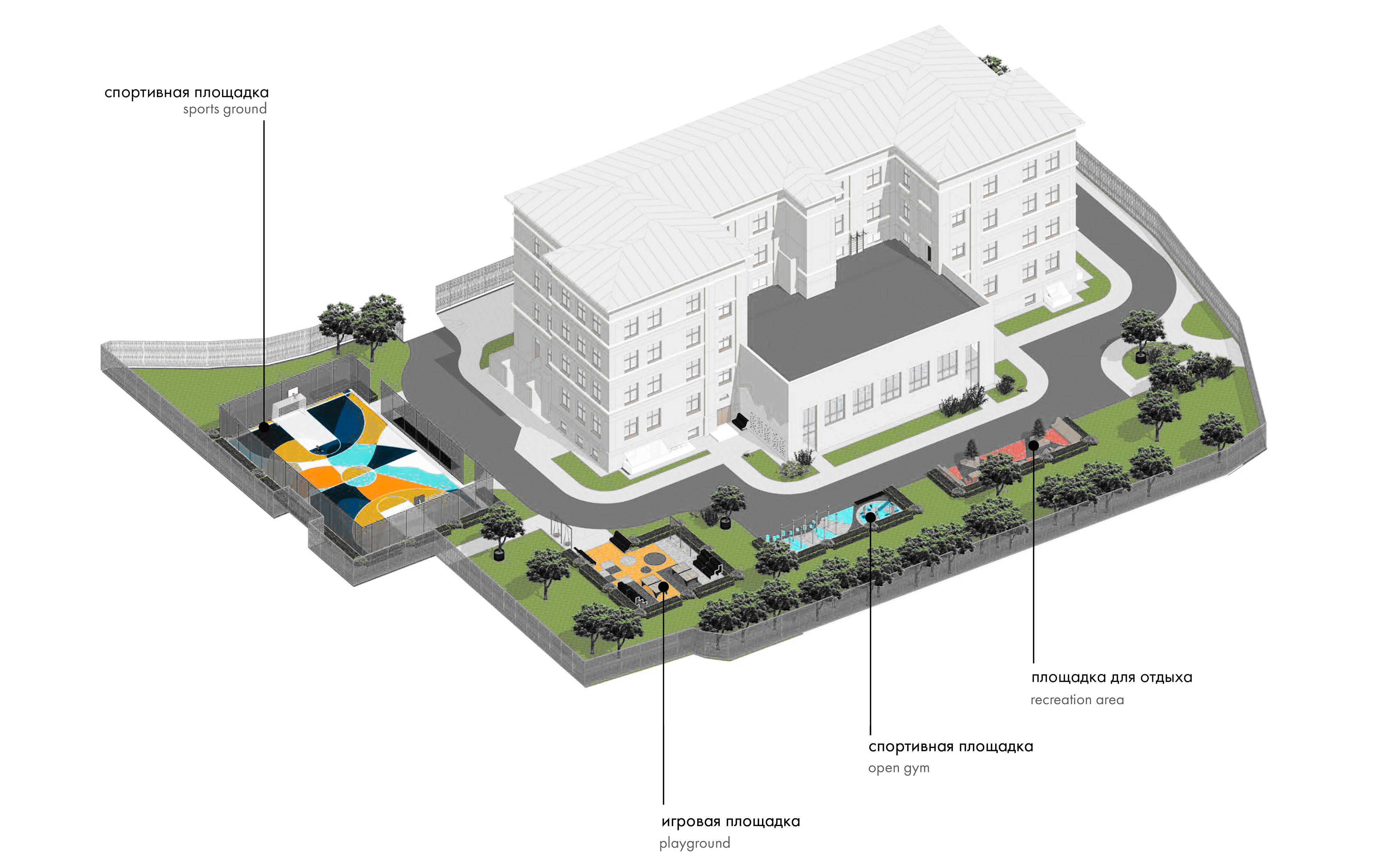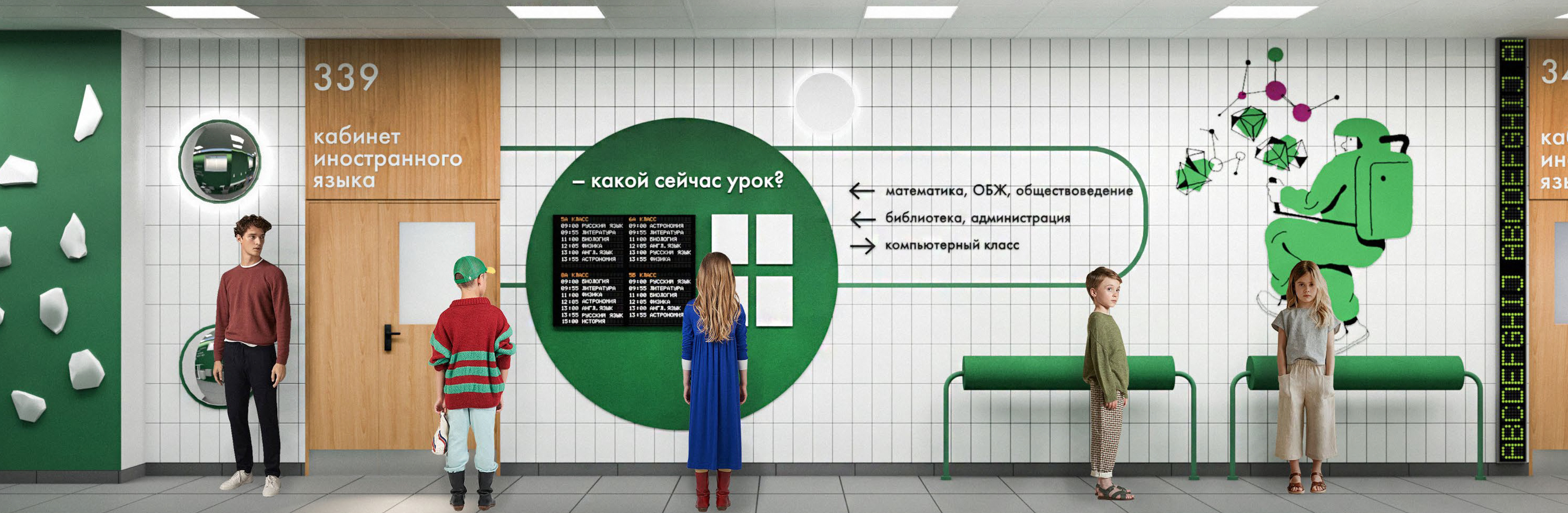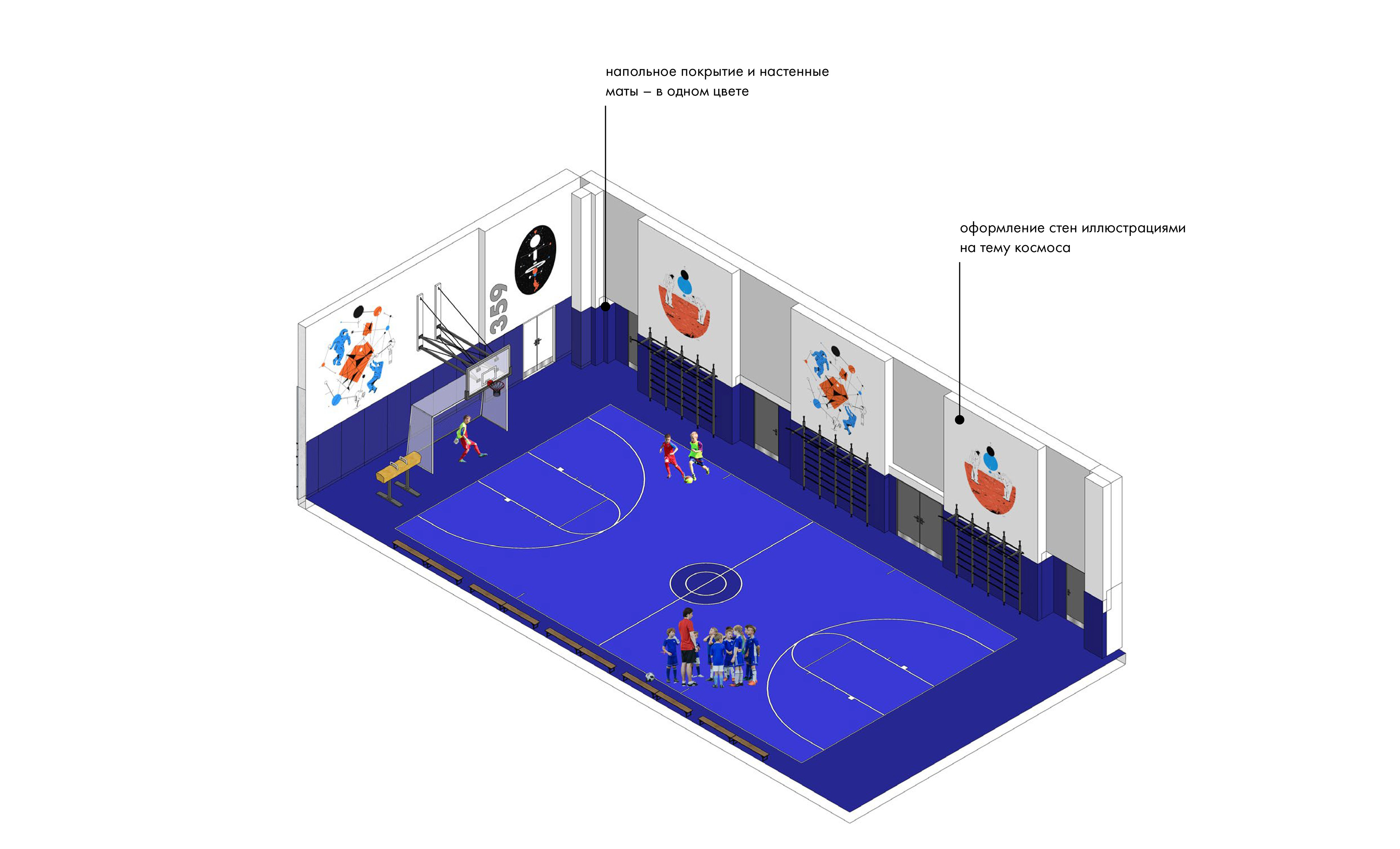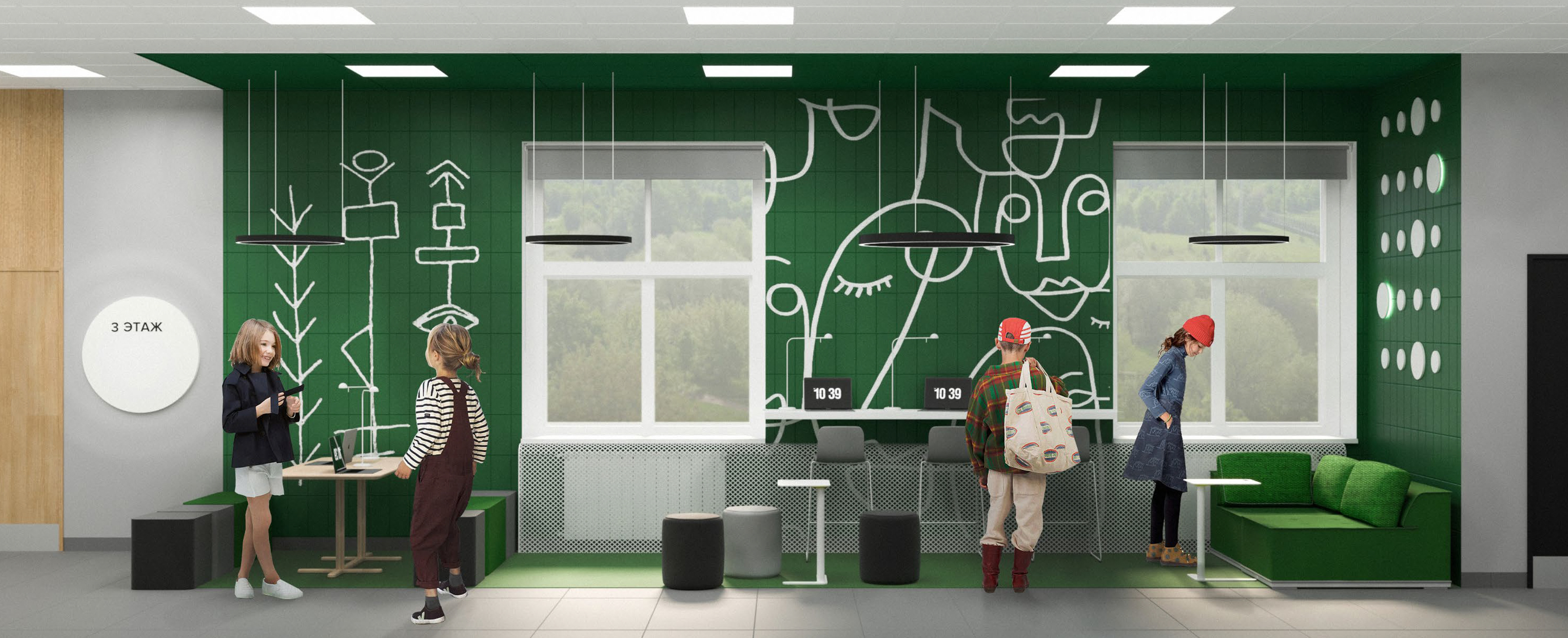 However, to inspire children and encourage them to create and explore the world around them, it is not necessary to literally depict other planets or rockets. In the context of a school, any familiar object in an unfamiliar location can already direct thoughts in a new and interesting direction. Abstract wall graphics, suspended lights in the form of balloons and rings, and finishing materials which are as atypical of the school as possible, all create an unusual, but comfortable and neutral enough environment for children to engage with their creativity.