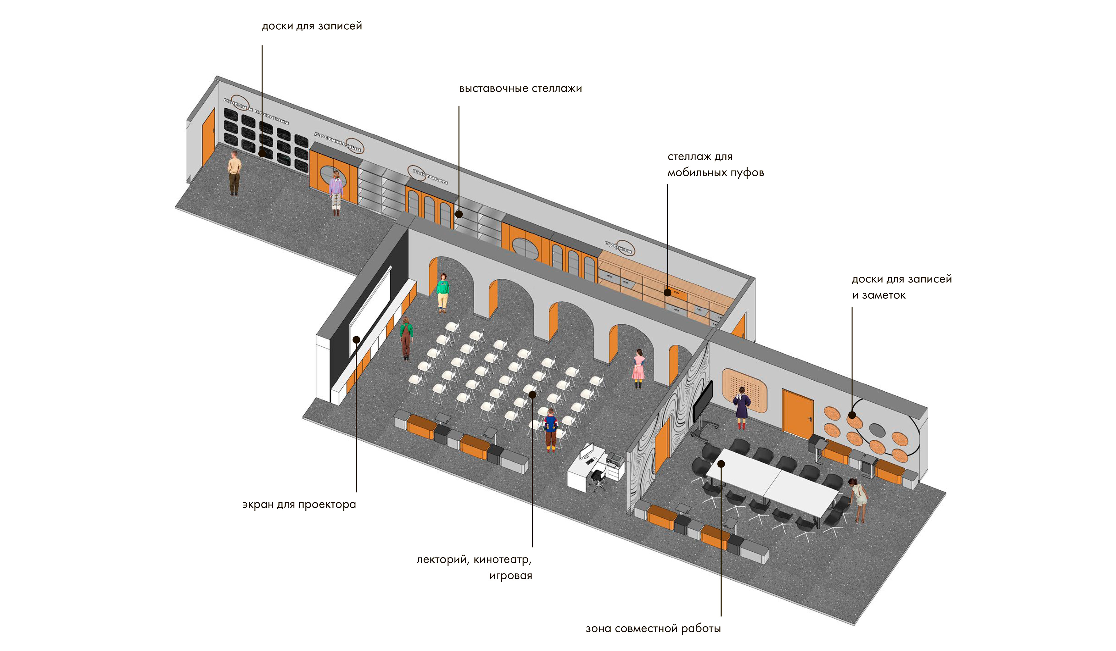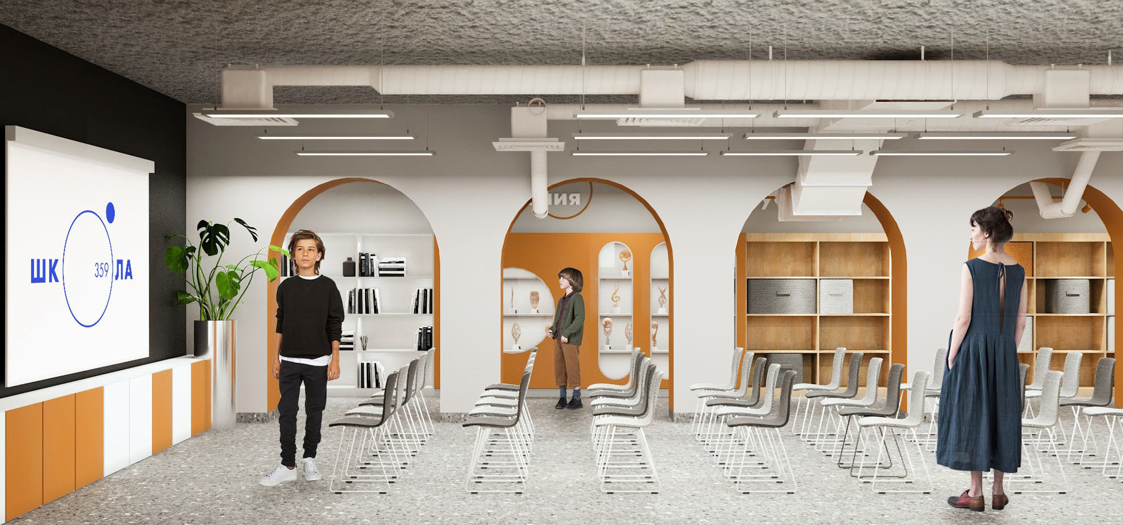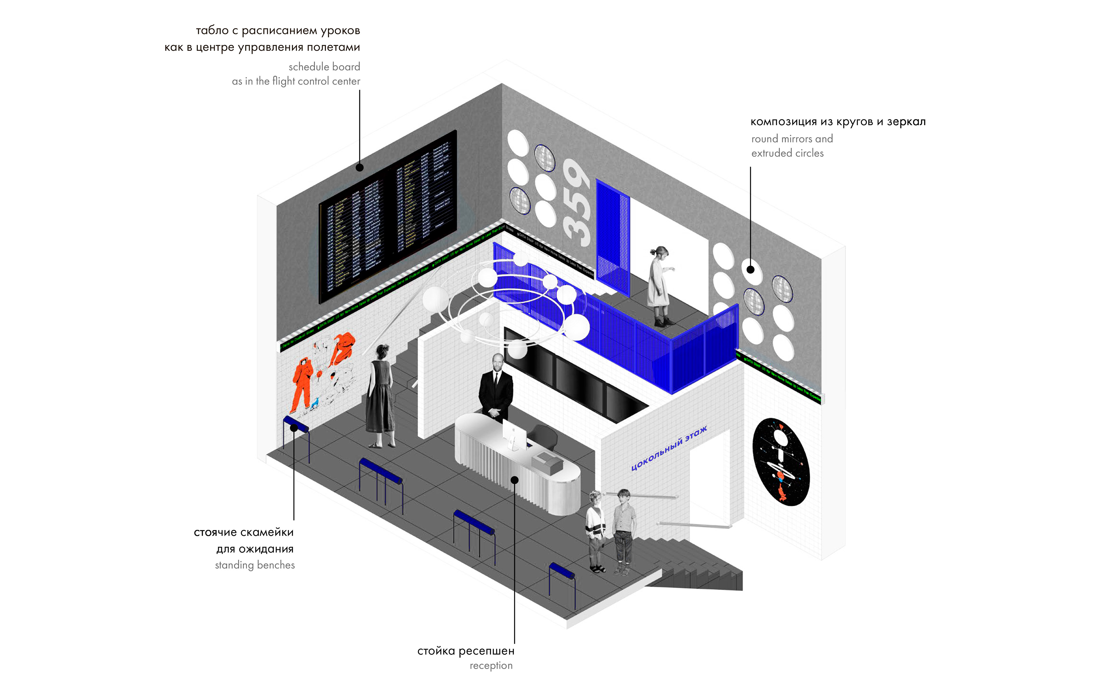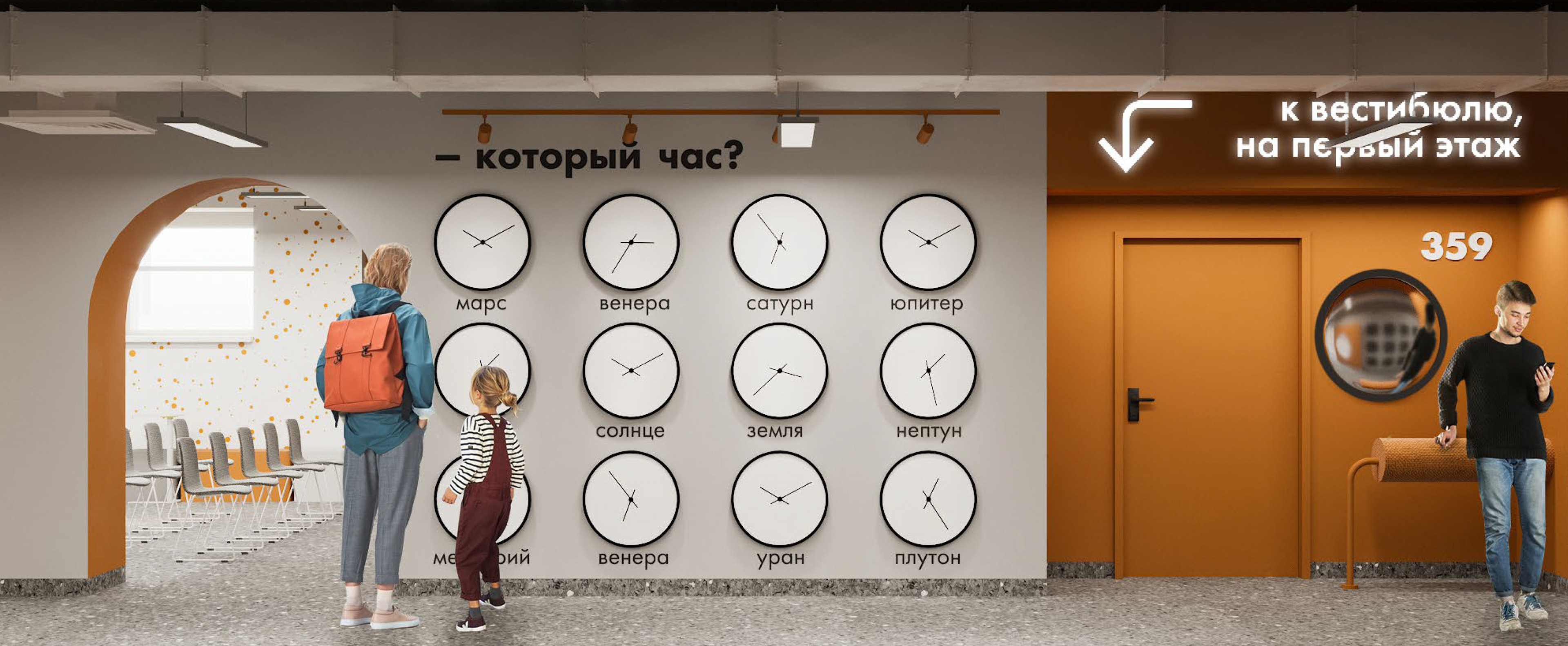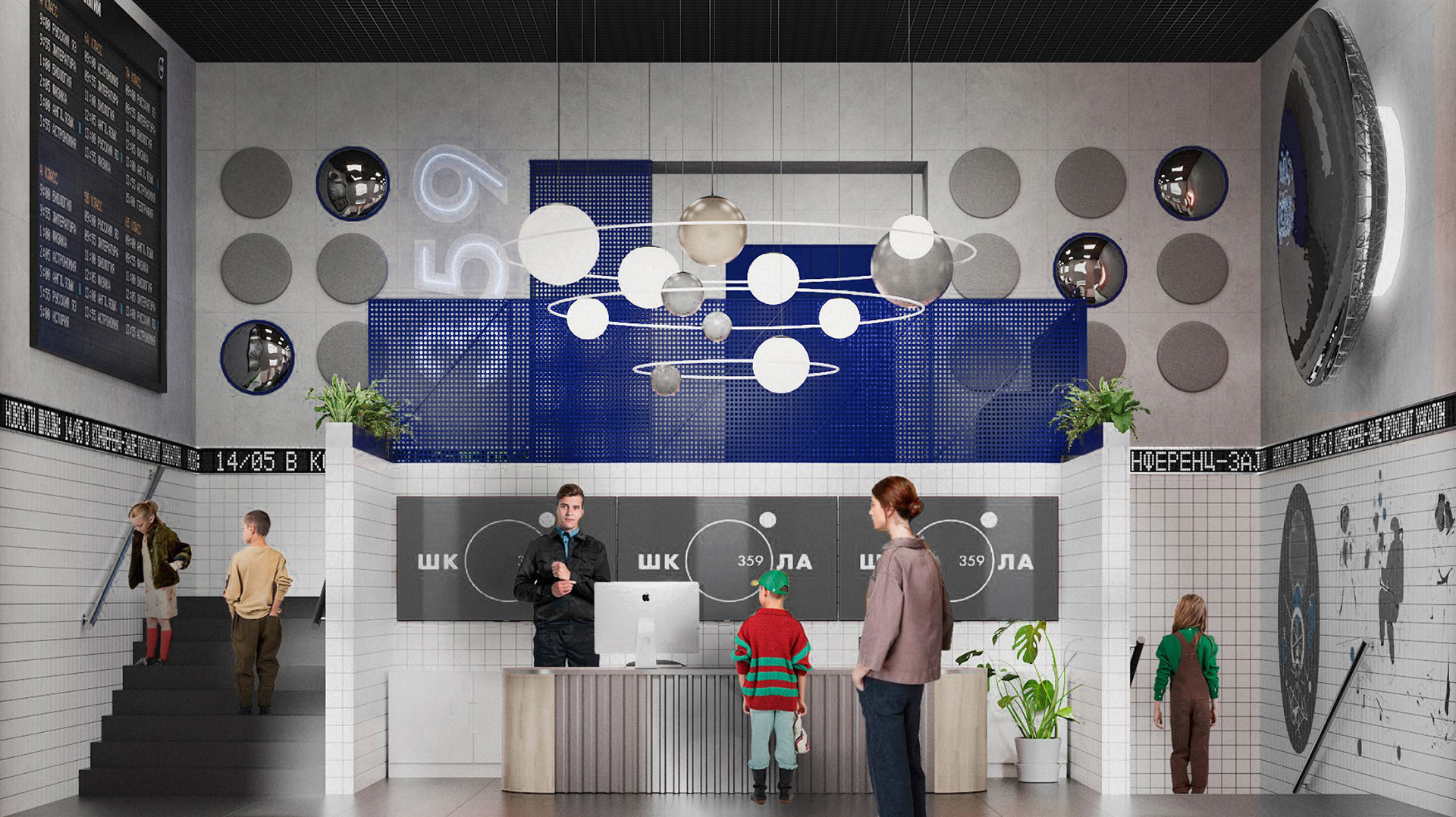 In addition to the lighting and decorative elements, the school has also implemented functional elements from the realm of space - a gigantic timetable board like in a mission control centre, LED tickers displaying the status of classes in the classrooms, and comfortable cylindrical benches resembling parts of a rocket