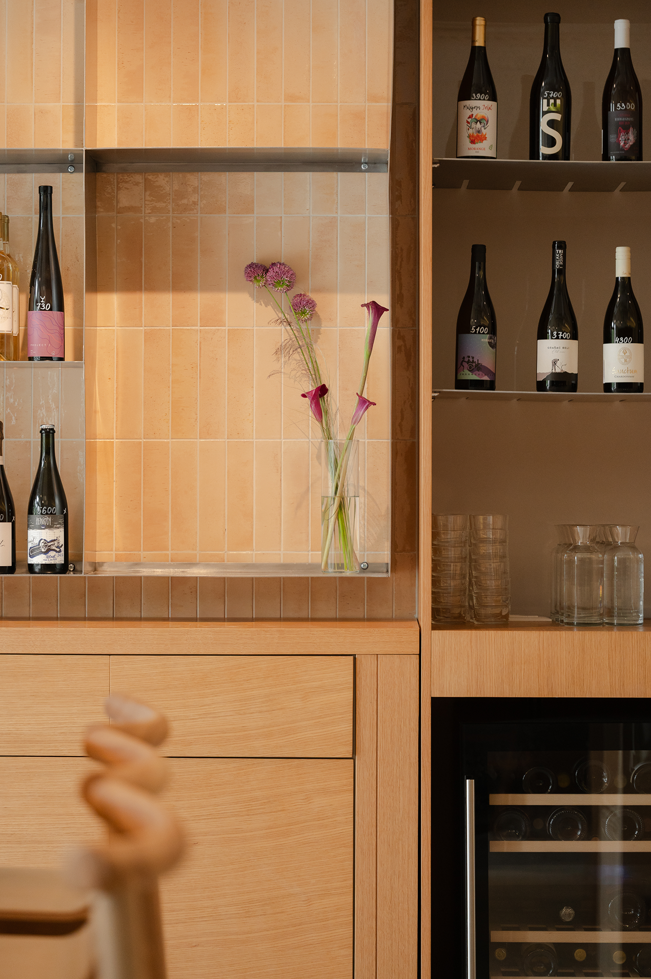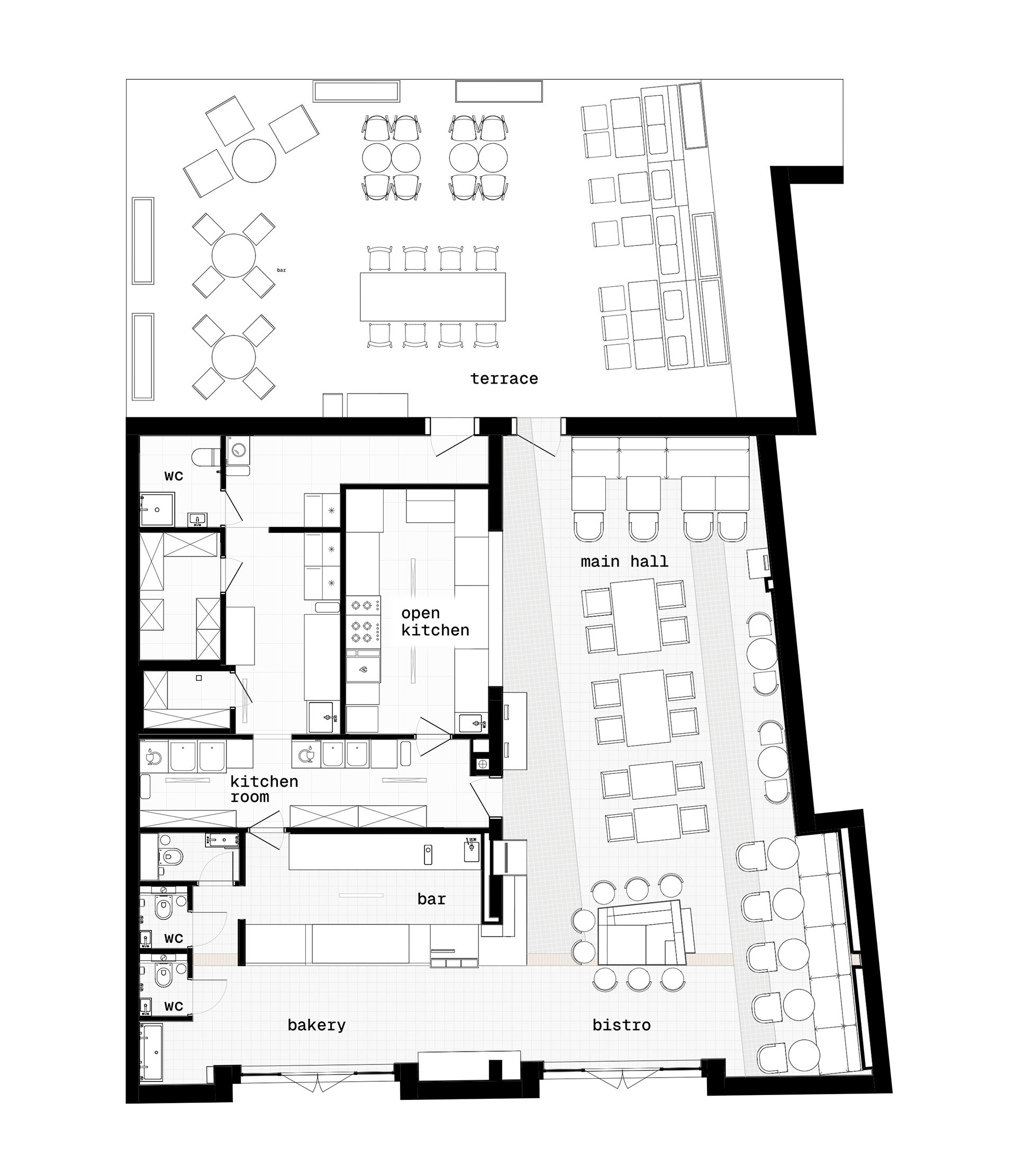 Functionally, the bakery and bistro are united within one space with two entrances, accommodating various formats — from a quick breakfast with coffee and pastry to a relaxed dinner with a glass of wine.