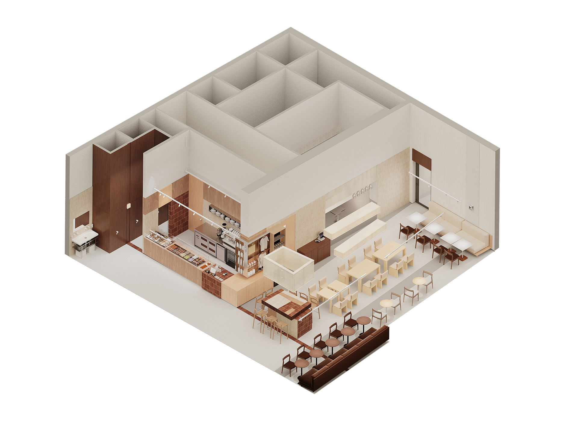 The layout was designed to make the workflow intuitive for the team and transparent for the guests. Staff and visitor flows are separated yet visually connected through open kitchen zones and display areas.