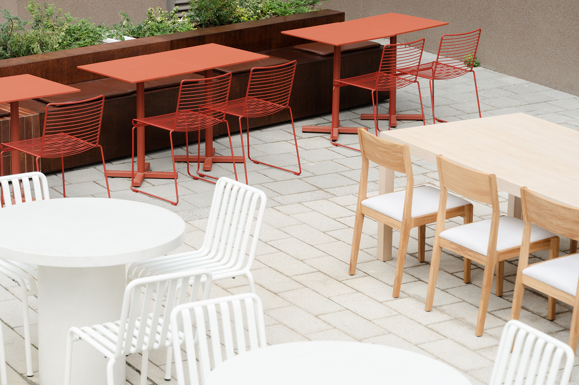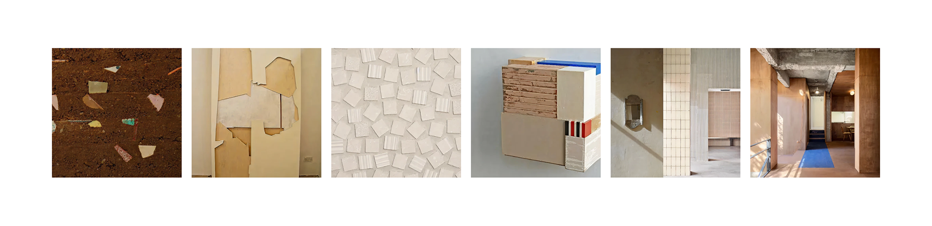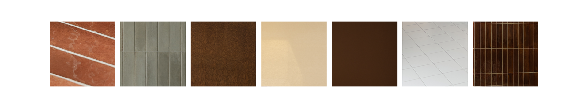 Natural materials such as wood veneer, concrete, fabric, and stainless steel define the palette. The tactile contrast of surfaces is complemented by subtle ceramic tones, while embroidered details add a graphic accent.