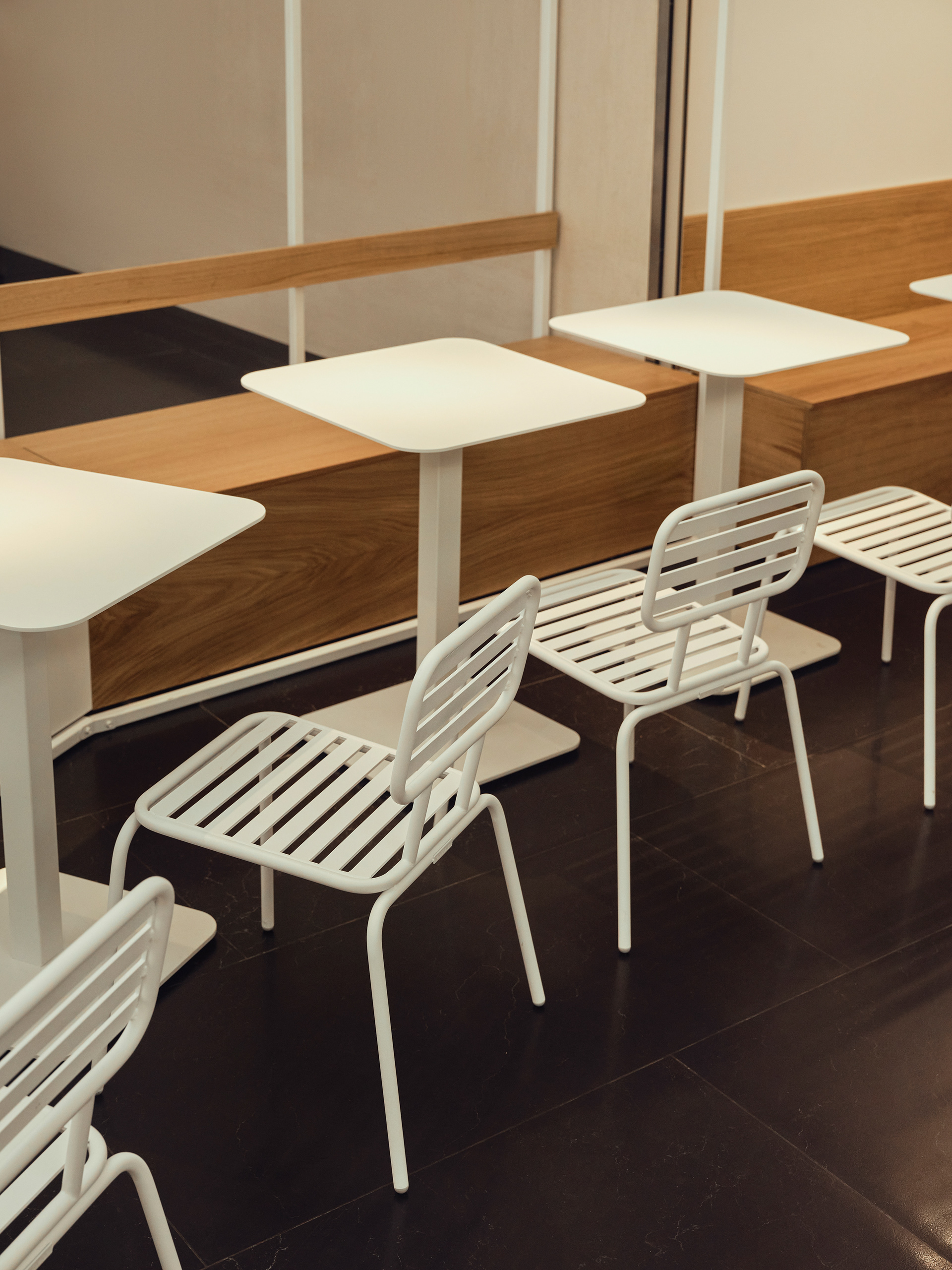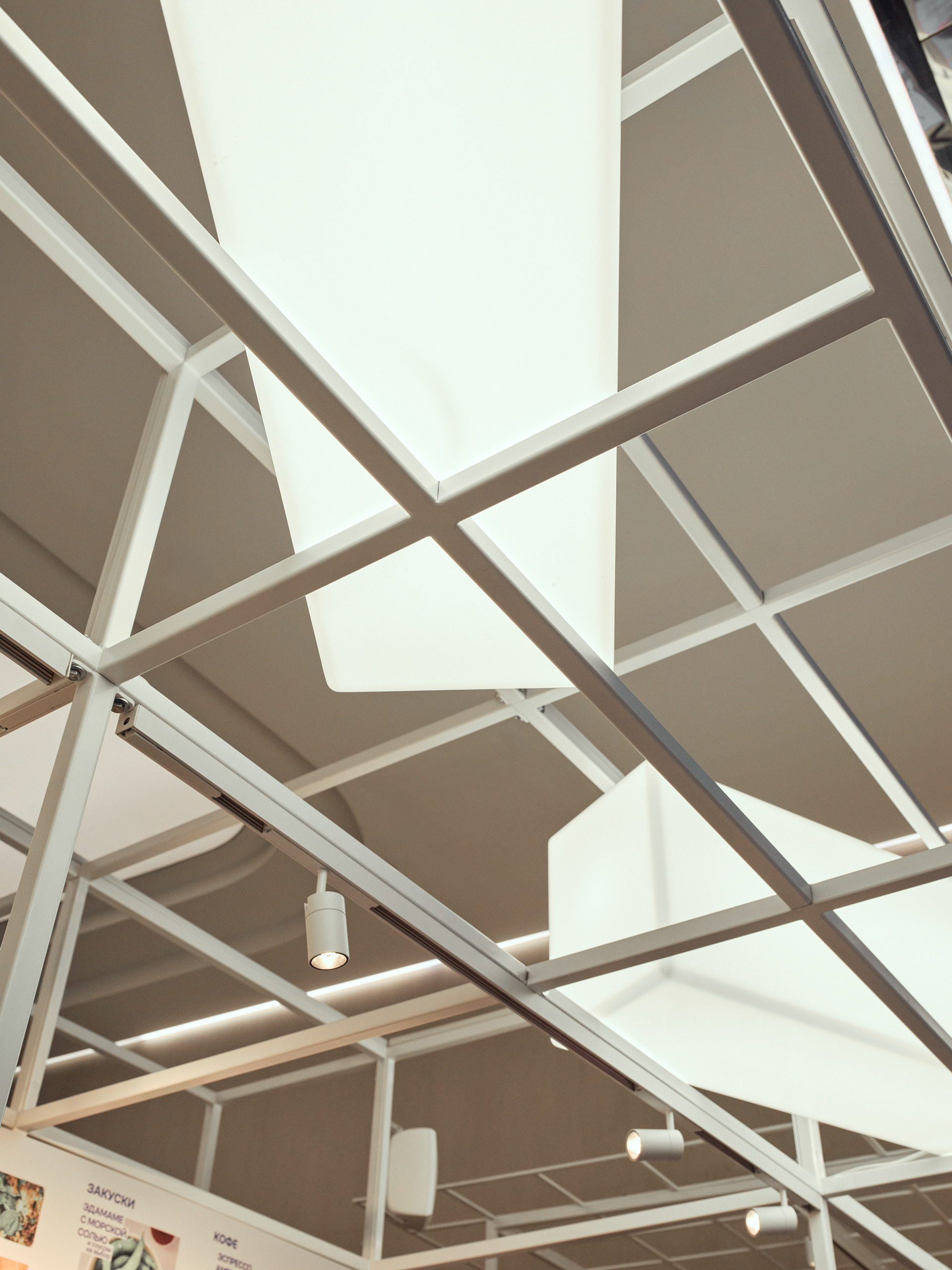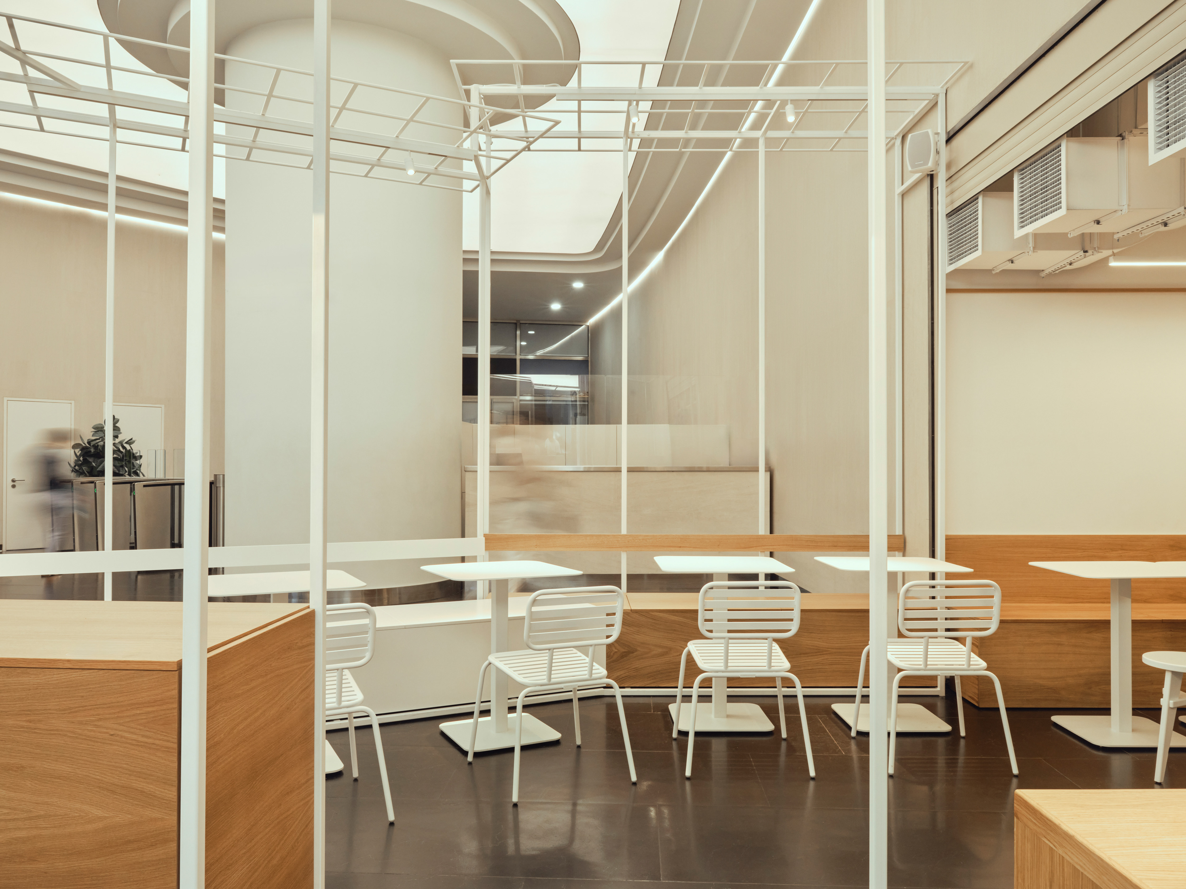 The key idea of the project was to build on the already familiar and recognizable characteristics of the brand — lightness, and warmth – and incorporate these feelings into the corner's architecture. We created a nook of peace and seclusion in the atrium of one of the office centers, which has high traffic and a noisy environment. To achieve this, the space was zoned with variously oriented canopies and the backs of seating areas.