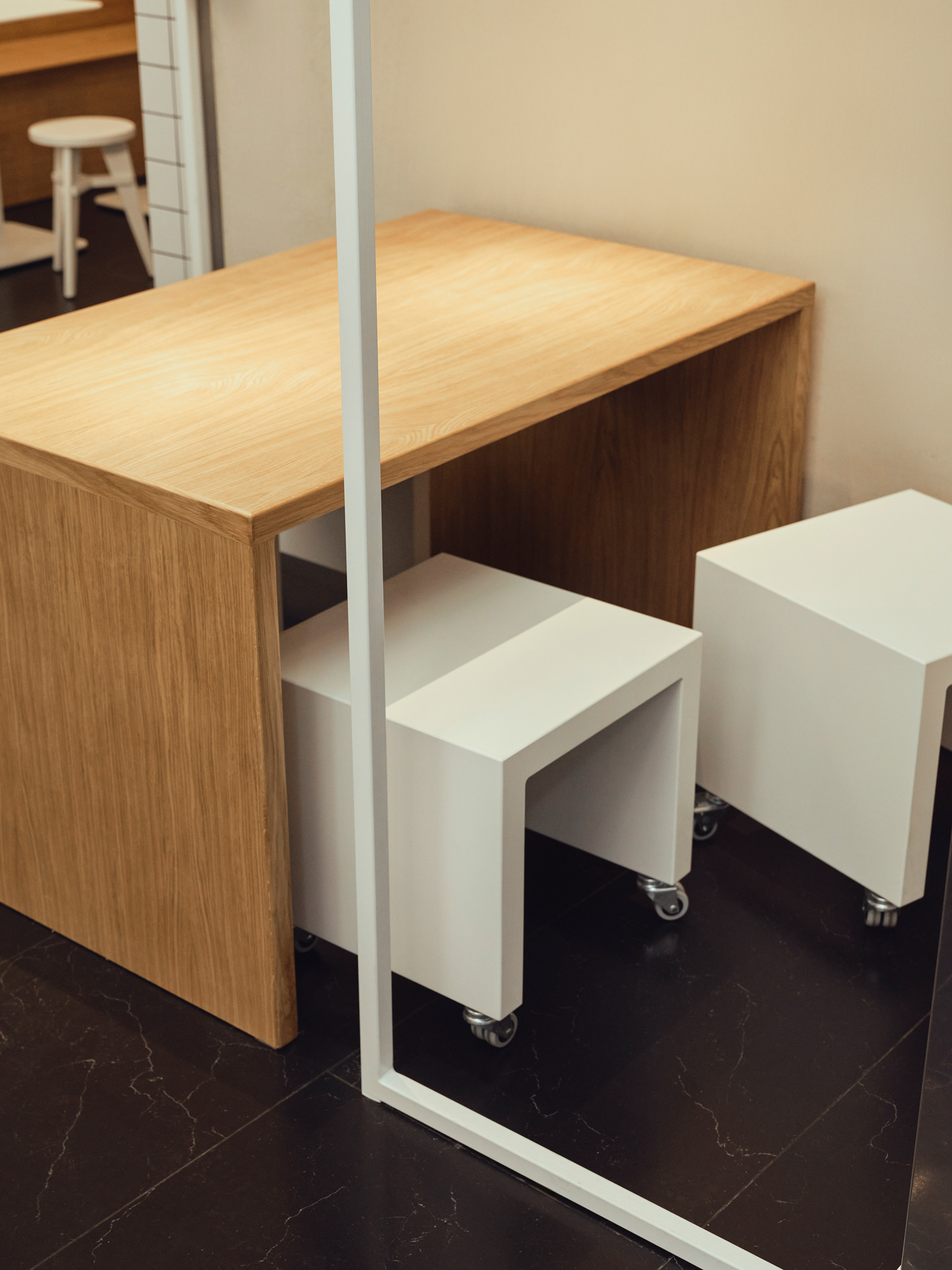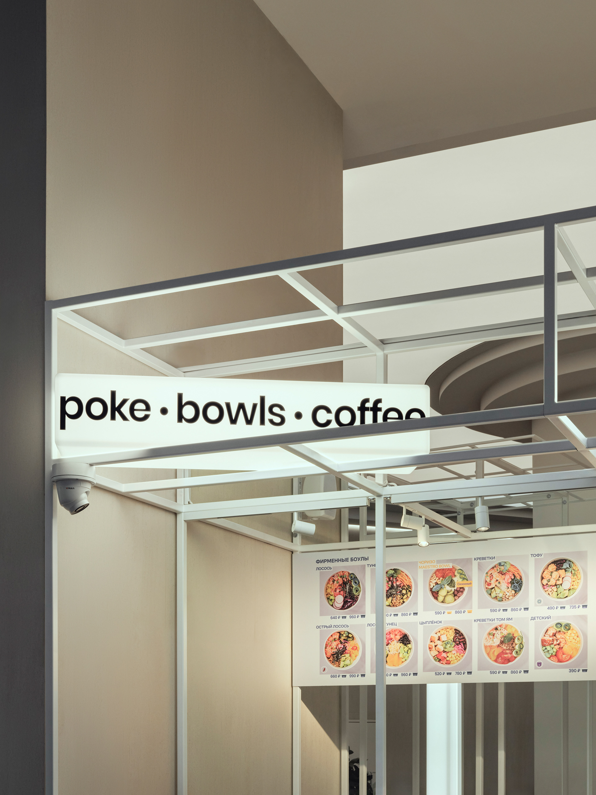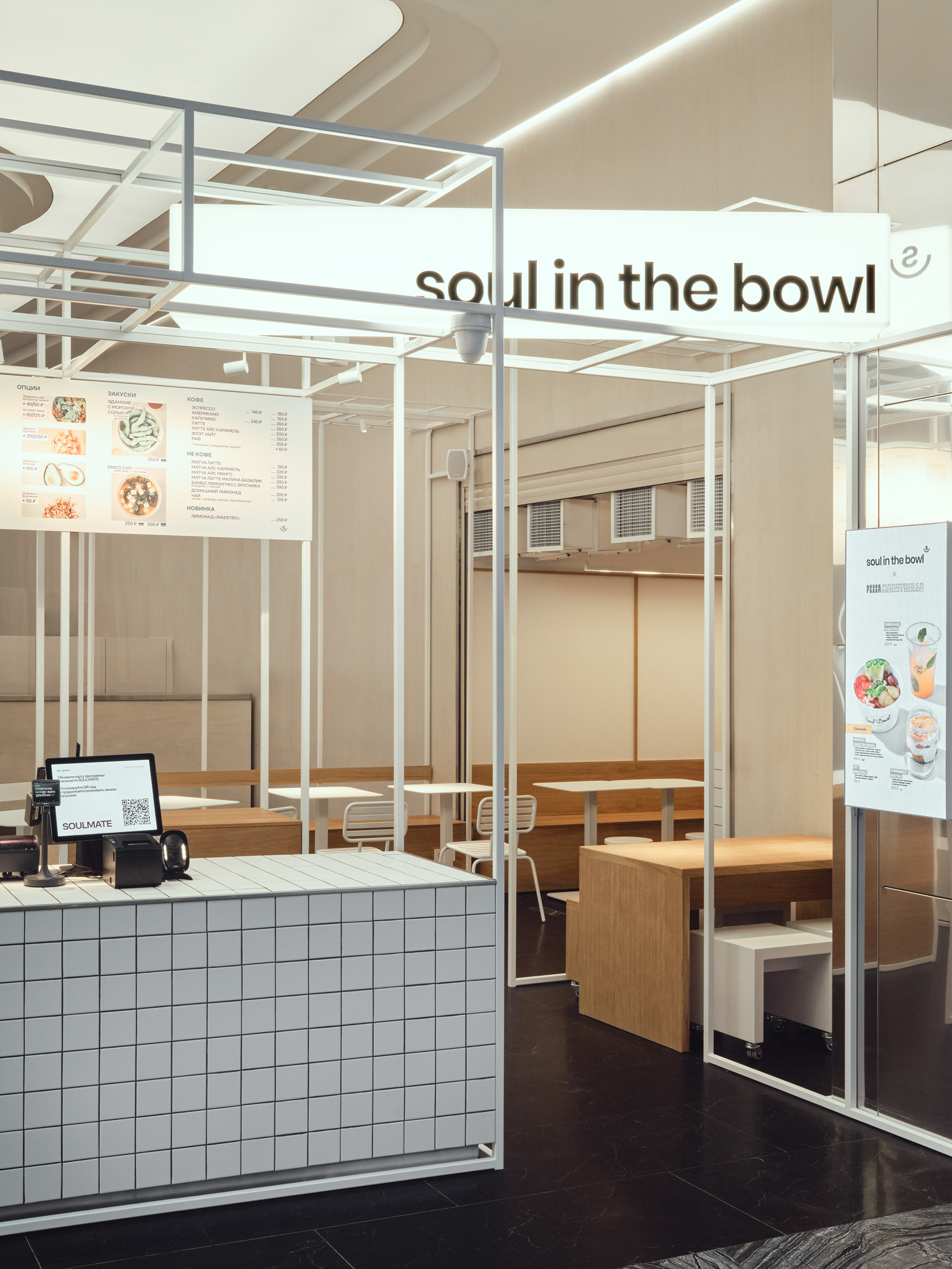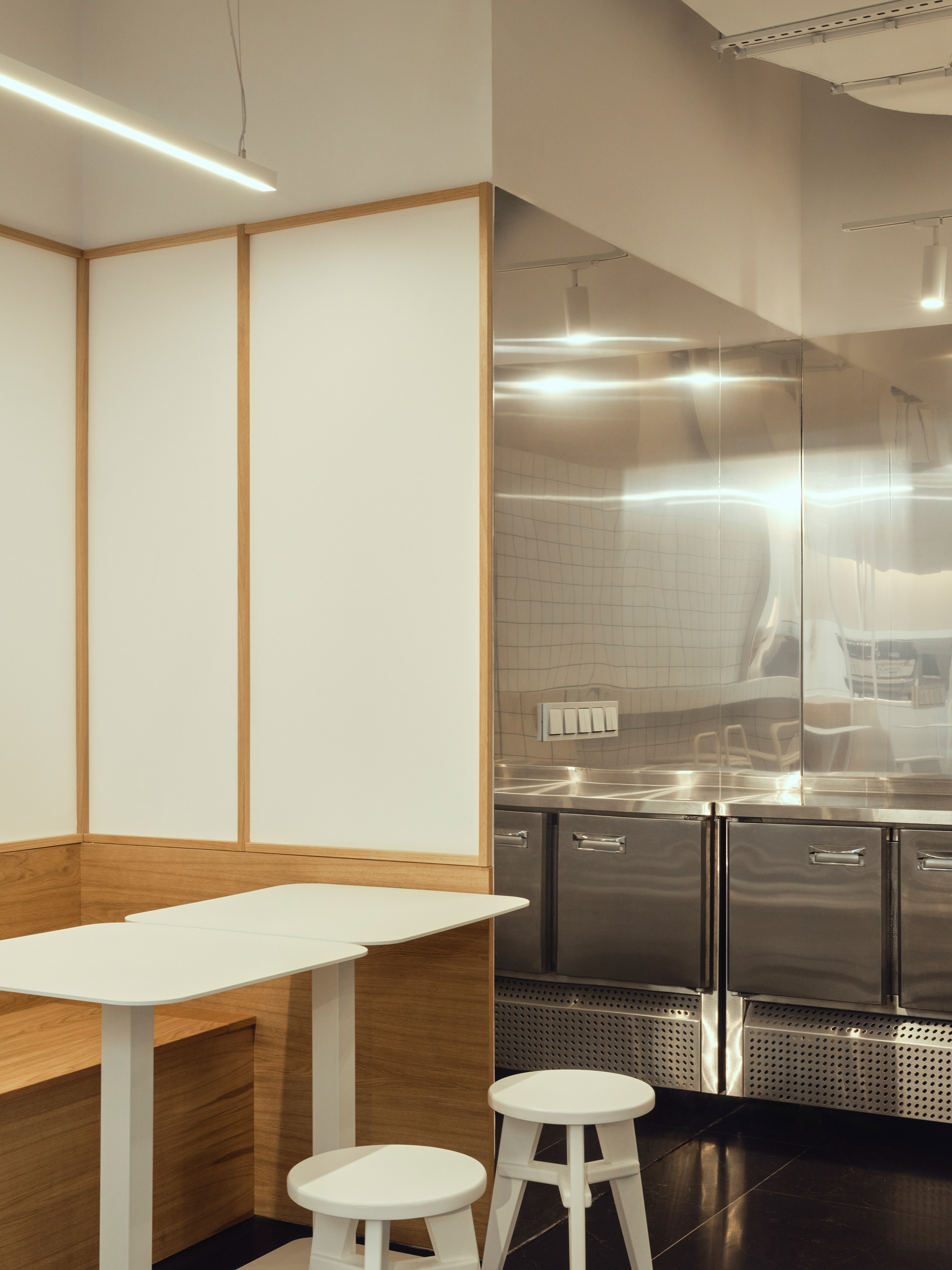 The corner space is divided into internal and external parts: the internal part is located near the preparation area, and the external part opens into the atrium. Transparent through canopies give the establishment autonomy and a sense of visual integrity, zoning it from the rest of the room. The seating is designed as outdoor furniture and stools, hinting at a brief seclusion on this island of safety. The main color of the corner is white, emphasizing lightness, and in addition, we used wood and warm lightboxes, adding a natural feel and the sensation of natural light.