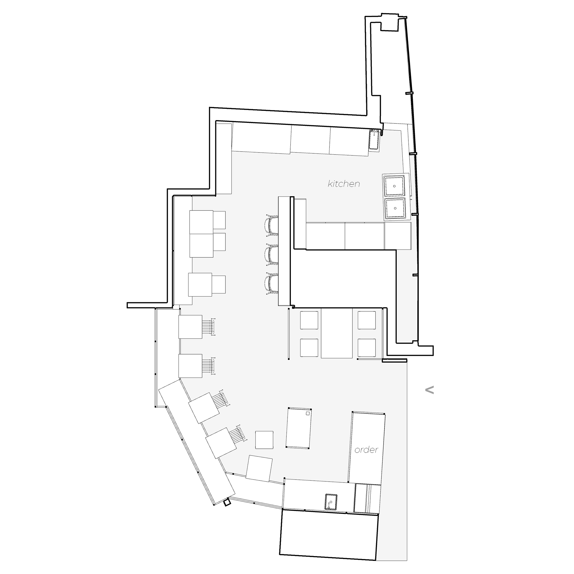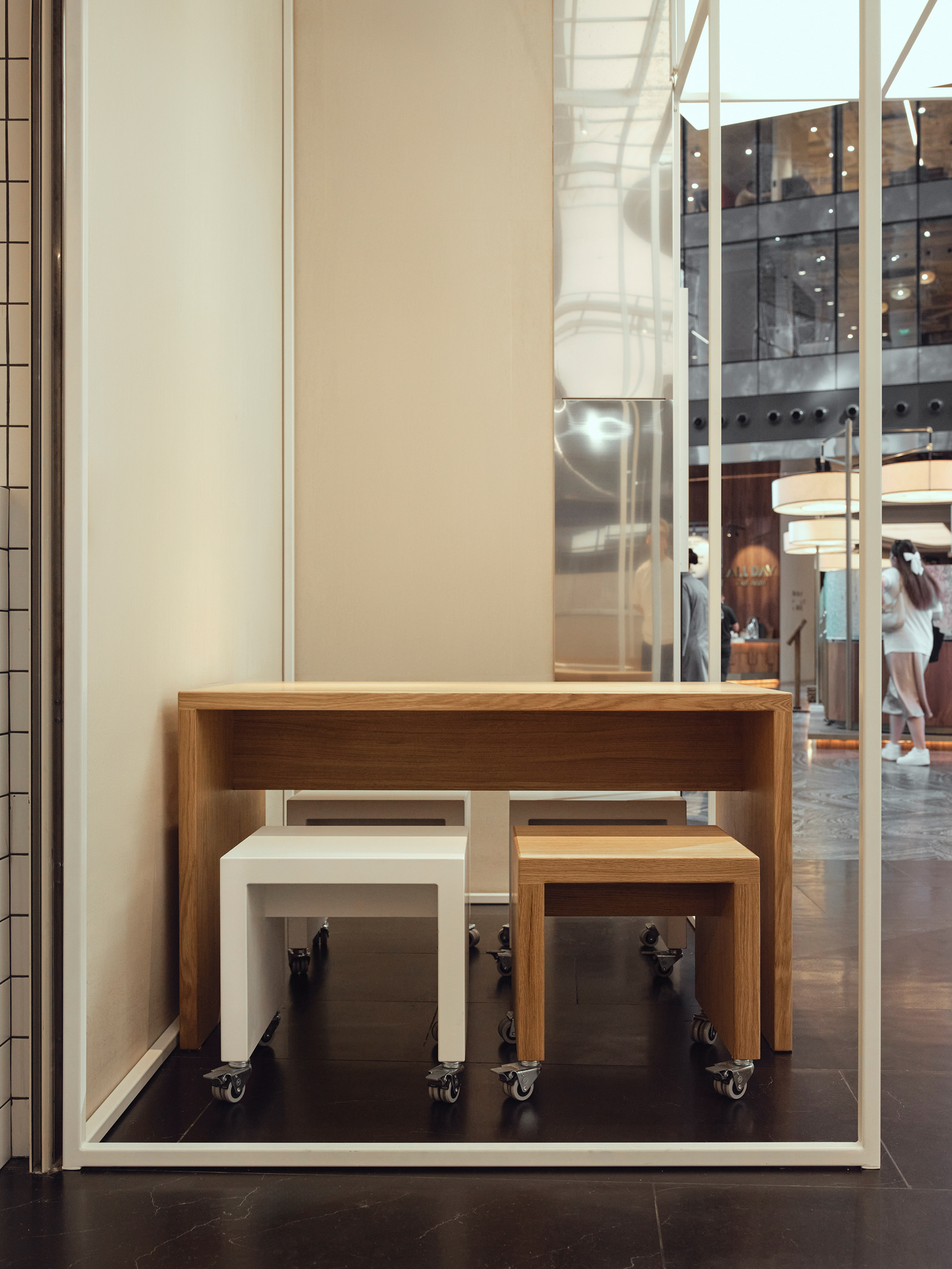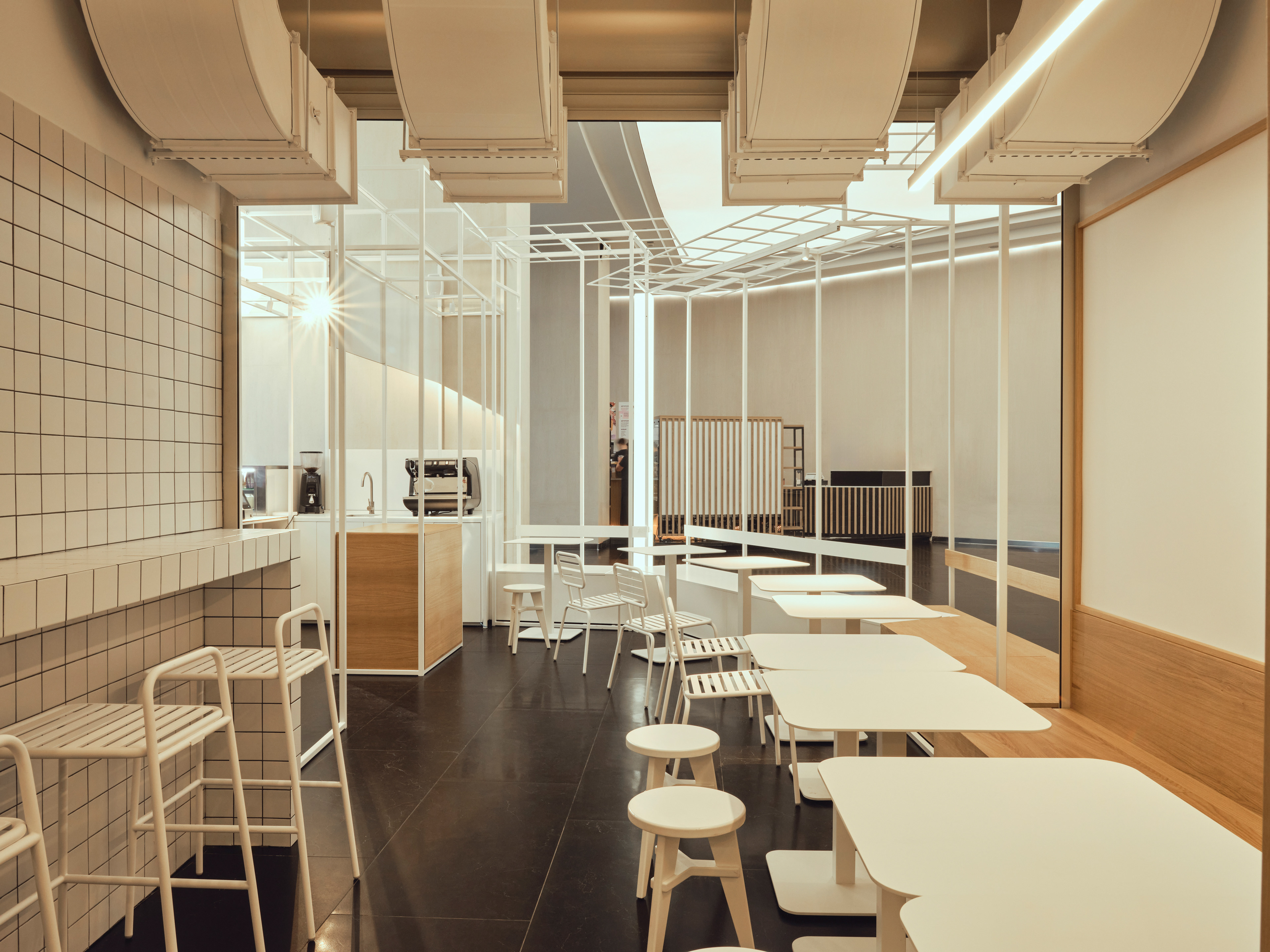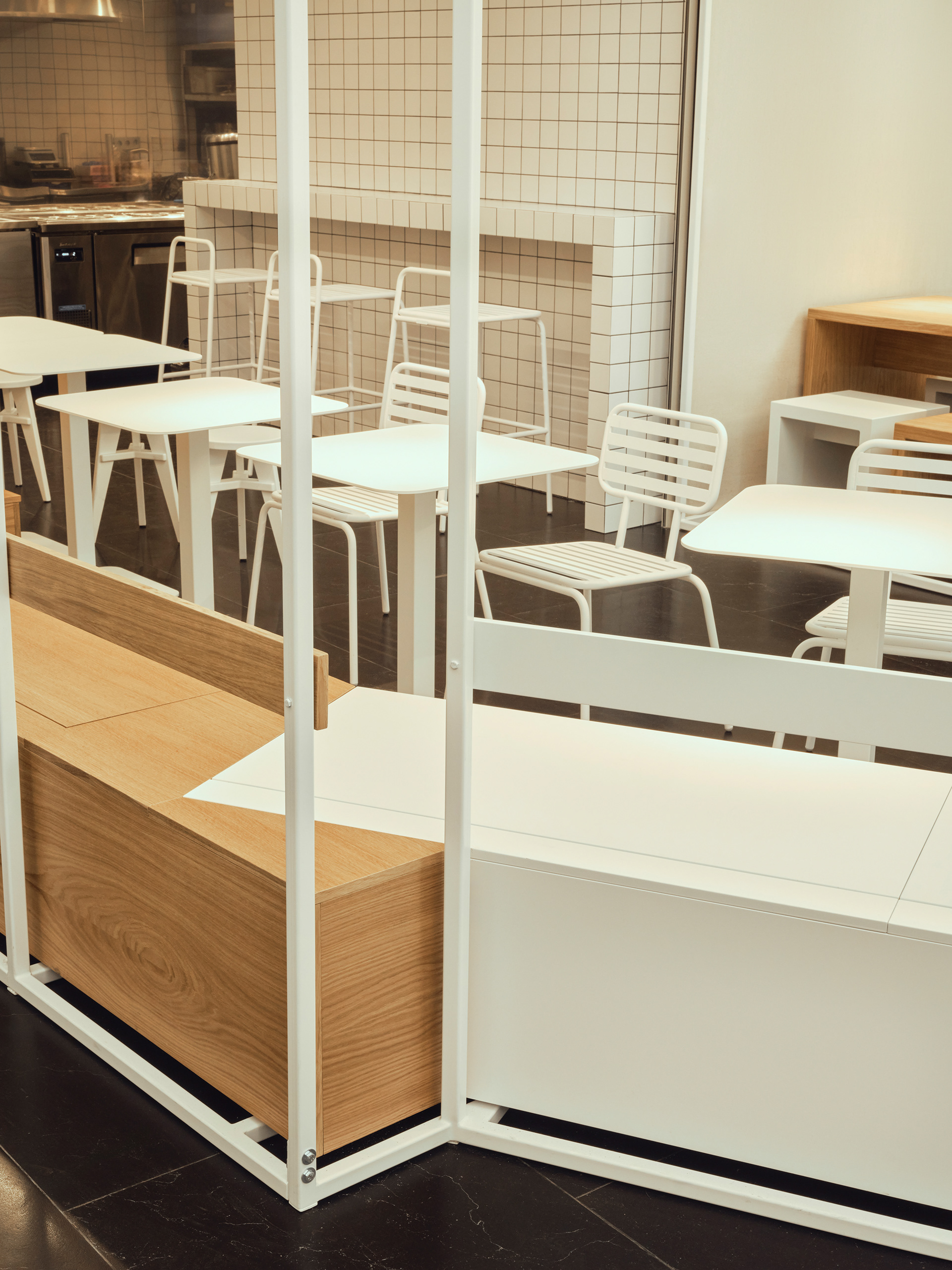 The corner space is divided into internal and external parts: the internal part is located near the preparation area, and the external part opens into the atrium. Transparent through canopies give the establishment autonomy and a sense of visual integrity, zoning it from the rest of the room. The seating is designed as outdoor furniture and stools, hinting at a brief seclusion on this island of safety. The main color of the corner is white, emphasizing lightness, and in addition, we used wood and warm lightboxes, adding a natural feel and the sensation of natural light.