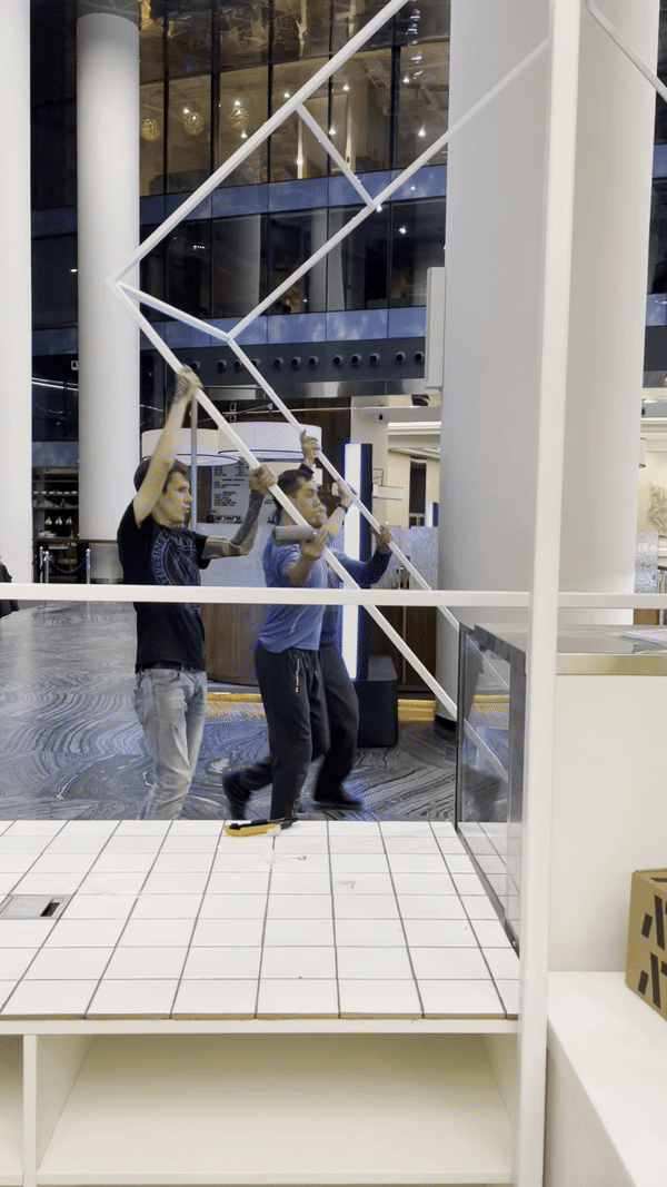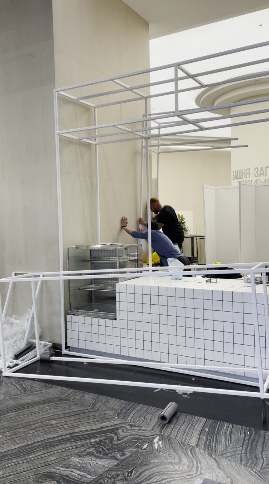 One of the challenges in the project was the design and assembly of the metal frame, which is not attached to any of the walls or the floor. The frame had to be self-supporting and bear the load of the lightboxes. Together with the furniture contractor’s designers, we developed the optimal frame configuration. The installation took place in several stages, as the structure was collapsible and consisted of two parts, each of which included several elements, allowing the frame to be brought into the room without problems.