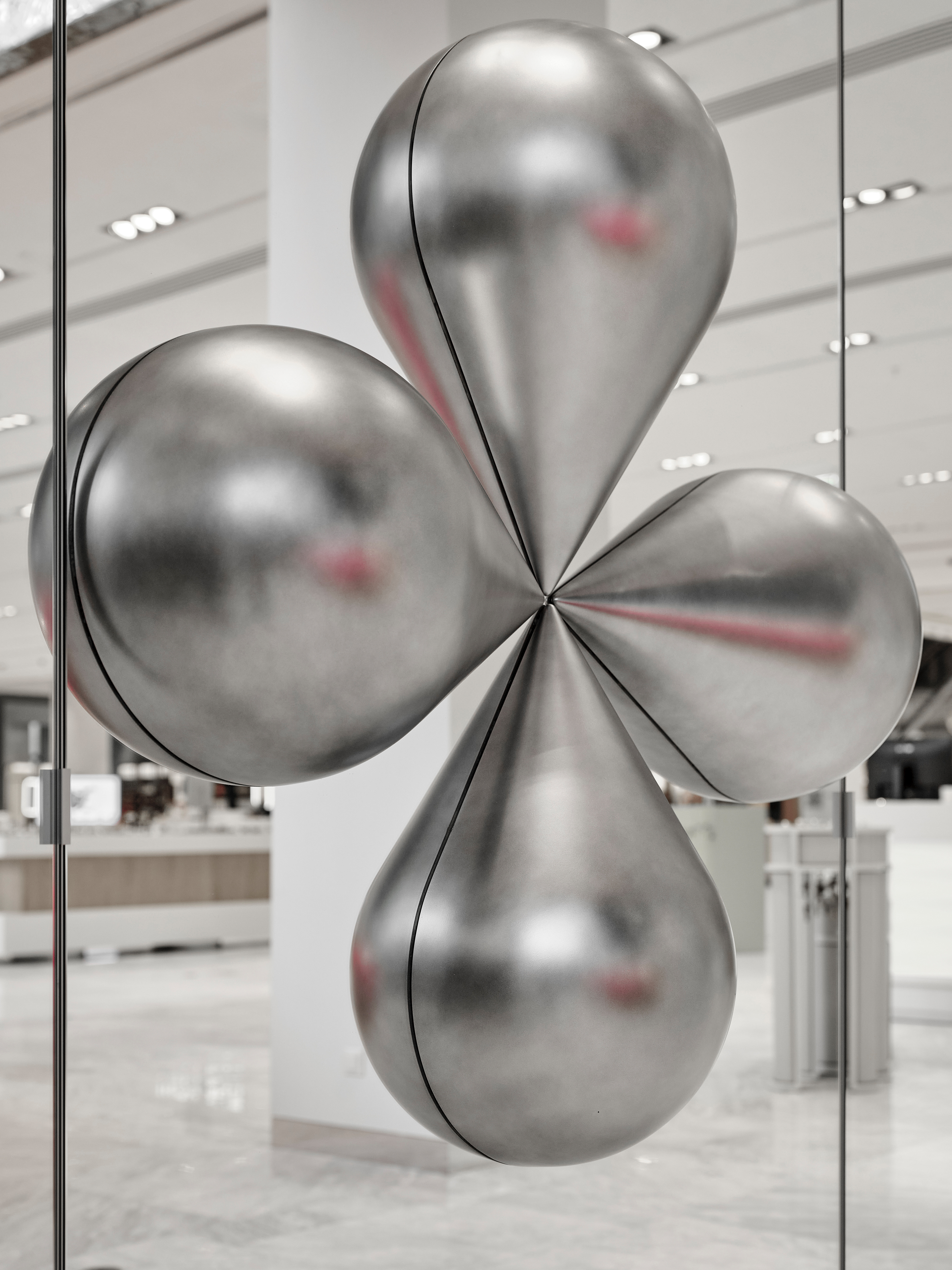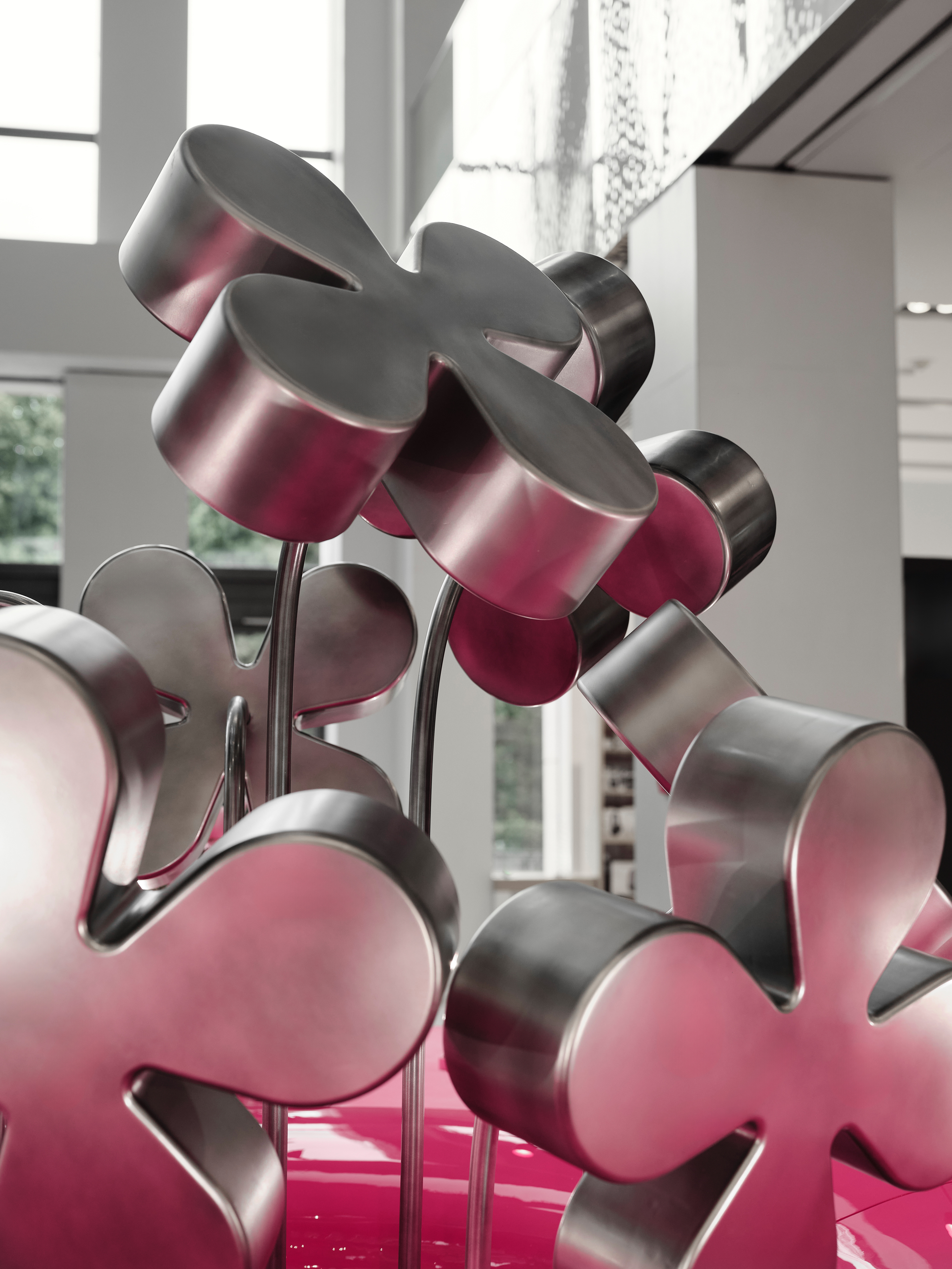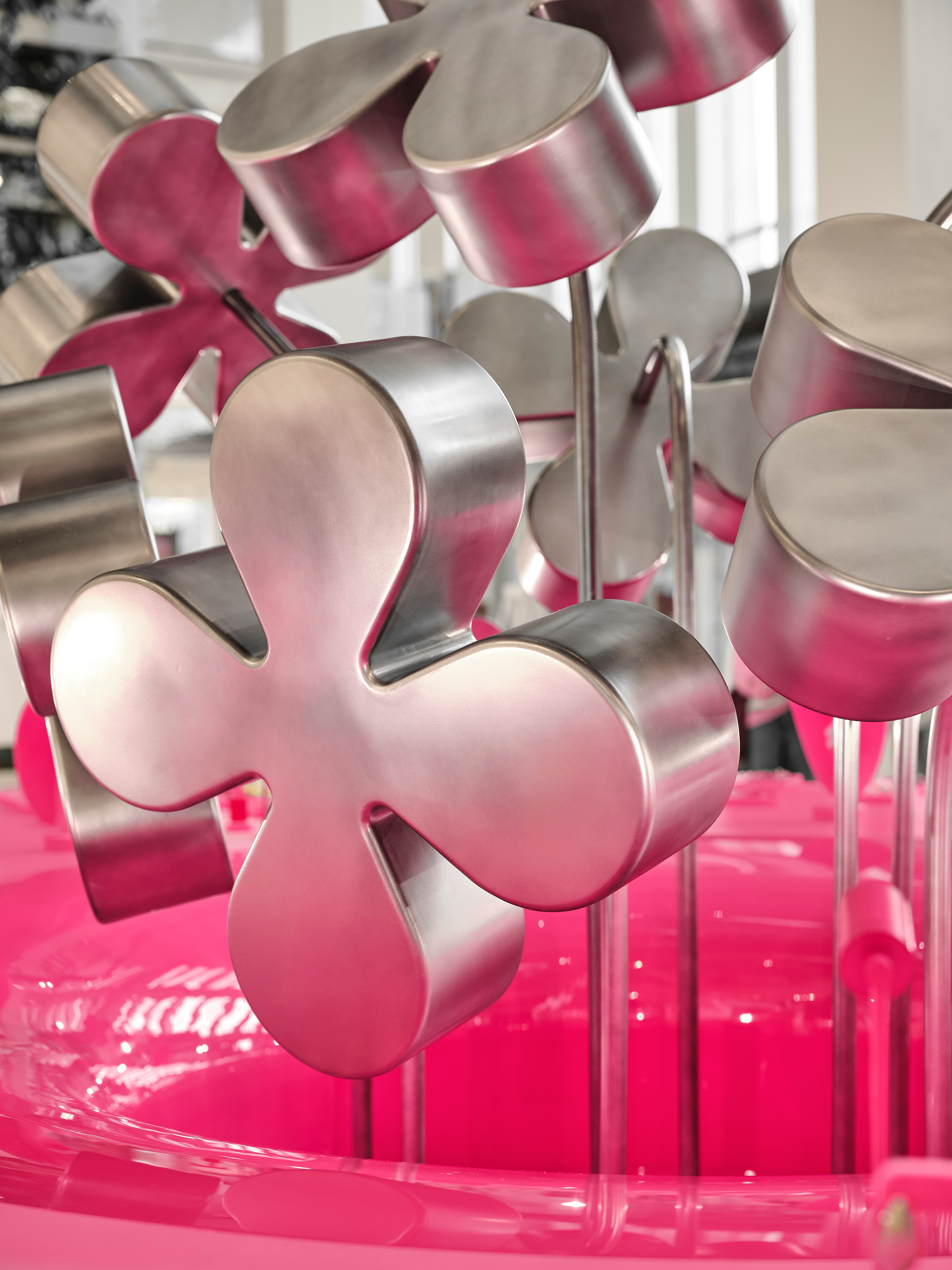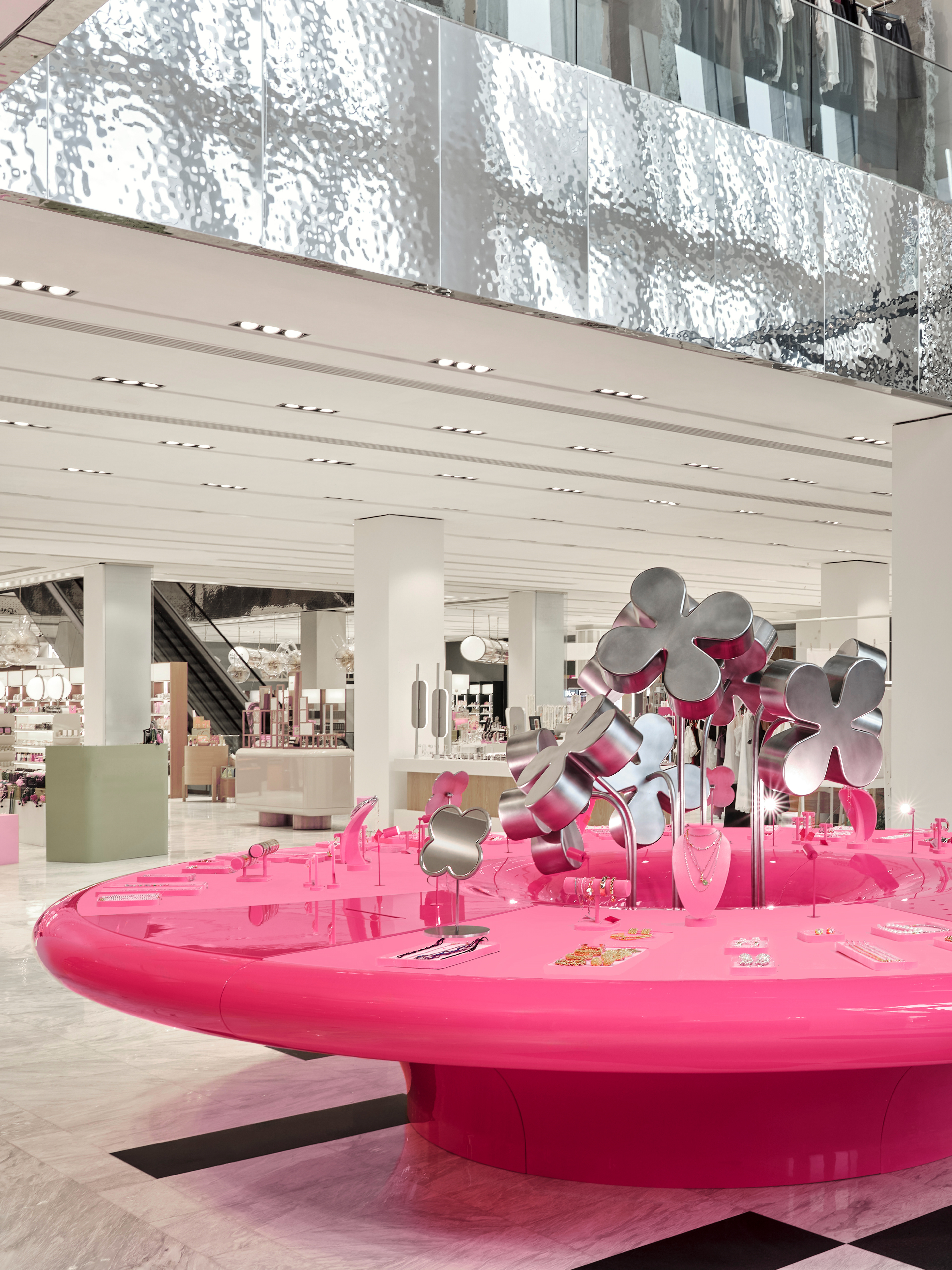 Surrealism, scale, reflections, and meticulous material work turn this space into a floral sculpture, living its own life within the store.