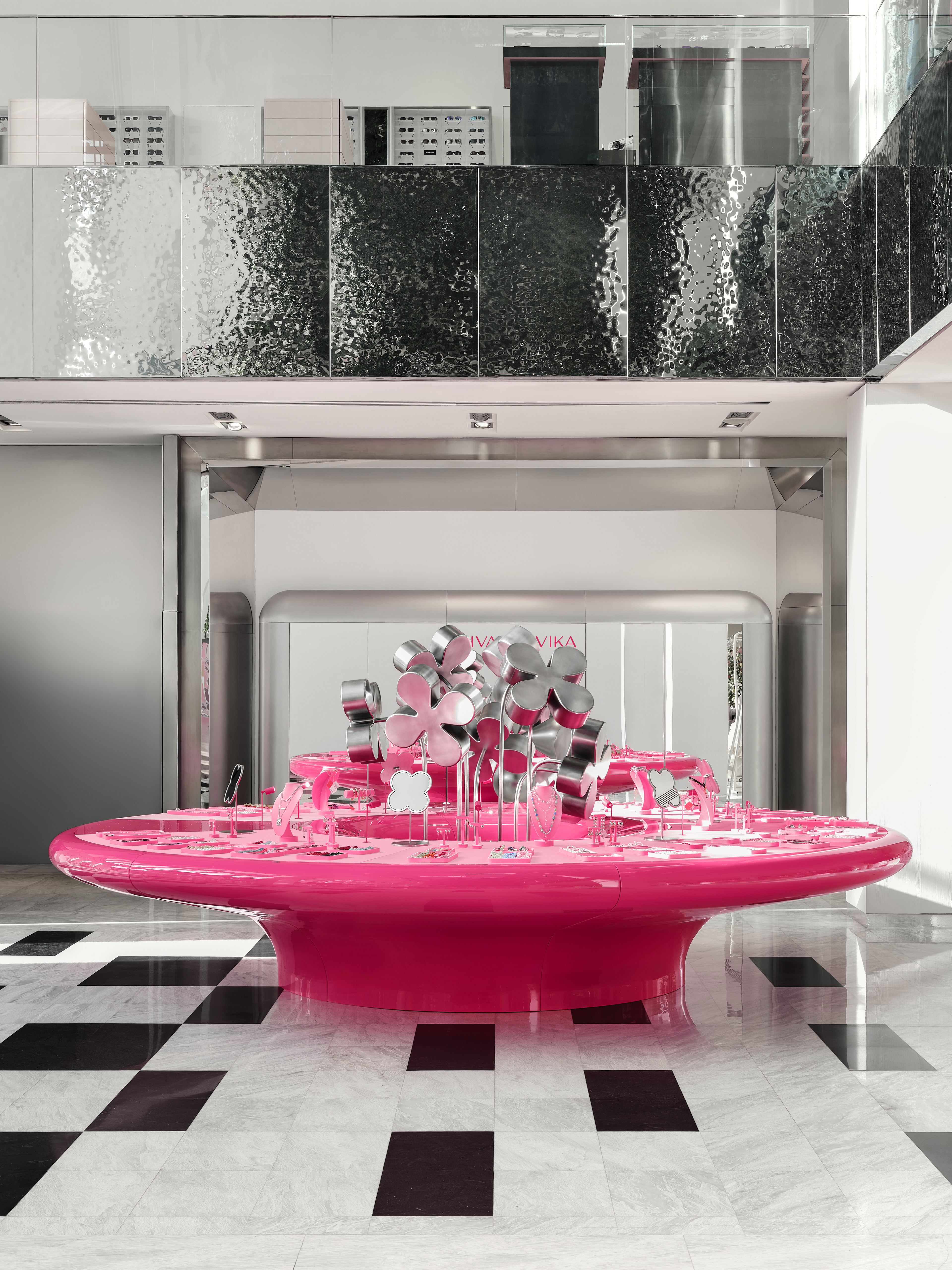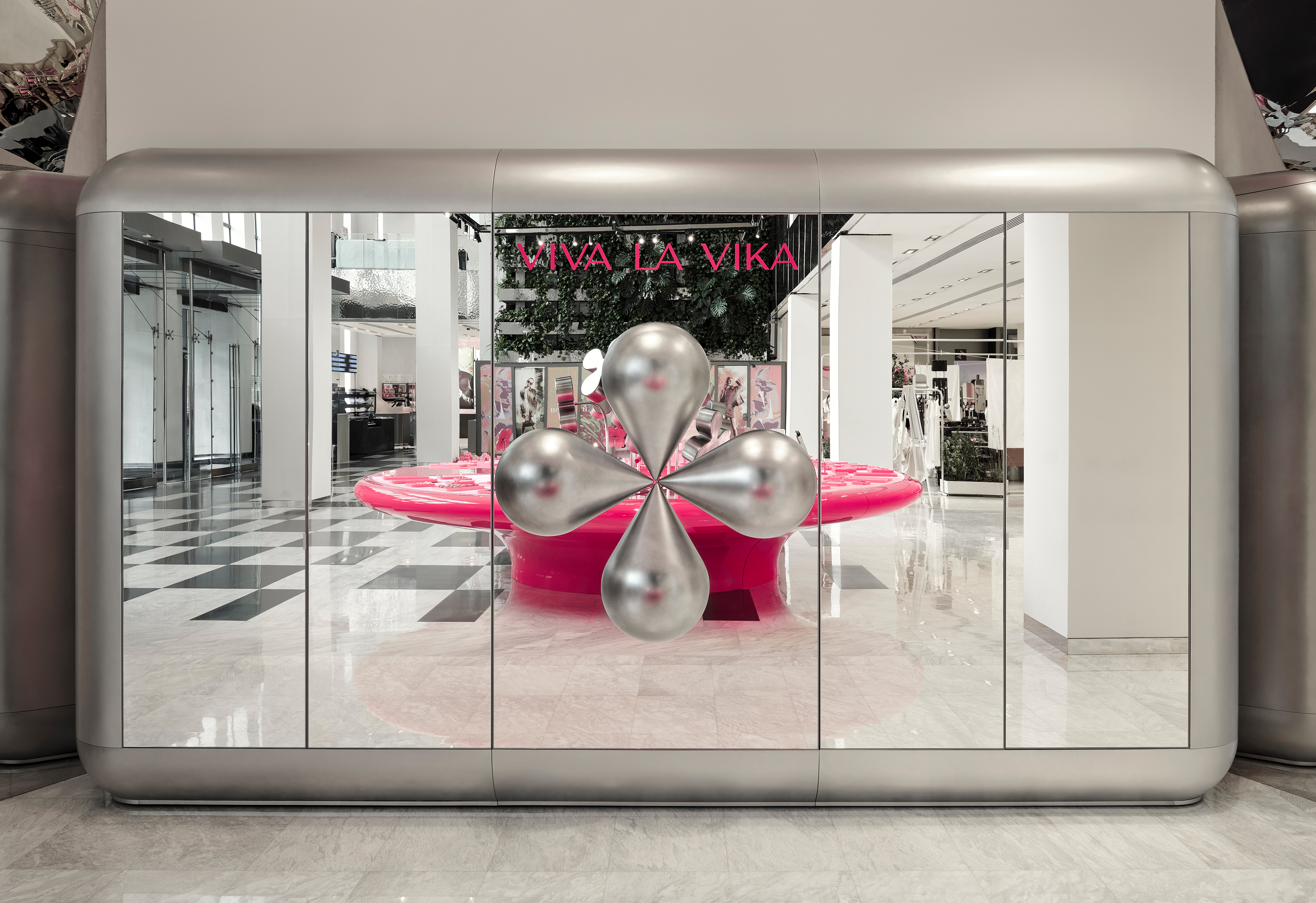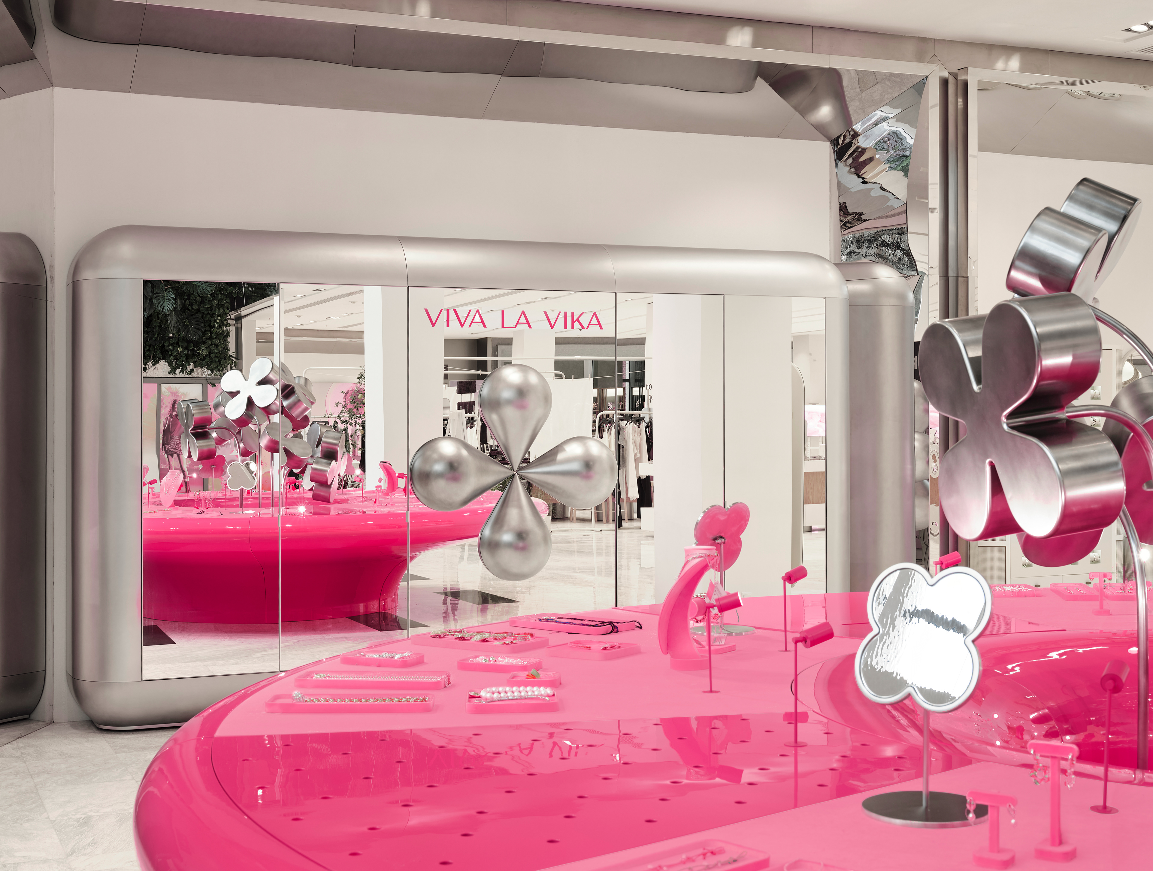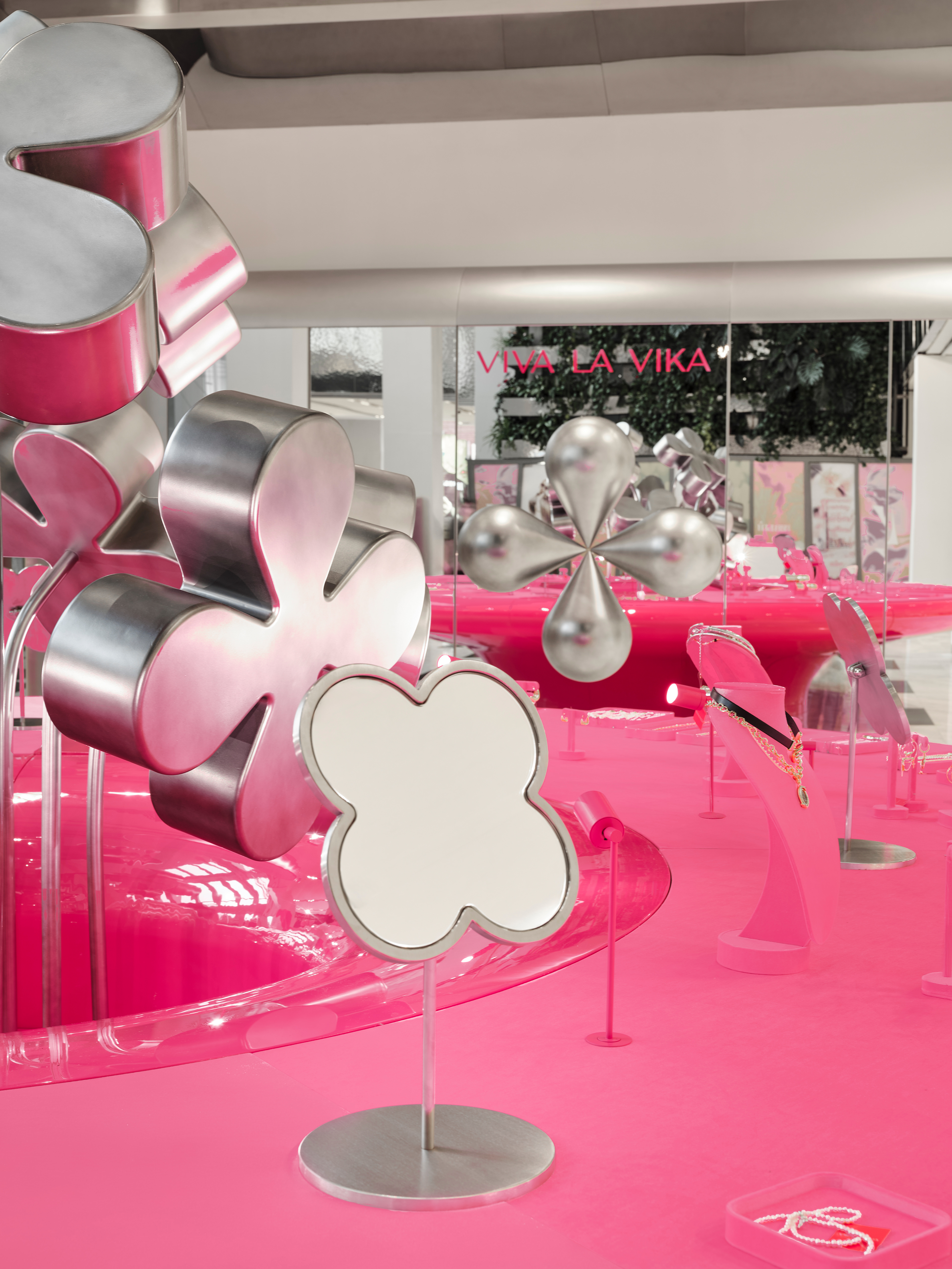 Instead of conventional solutions, a strategy of bold dominance was chosen: reflective metallic flowers, chrome, a pink pedestal, and a mirrored cabinet with rounded edges — all forming a self-contained, recognizable universe amidst the bustle of the shopping space.