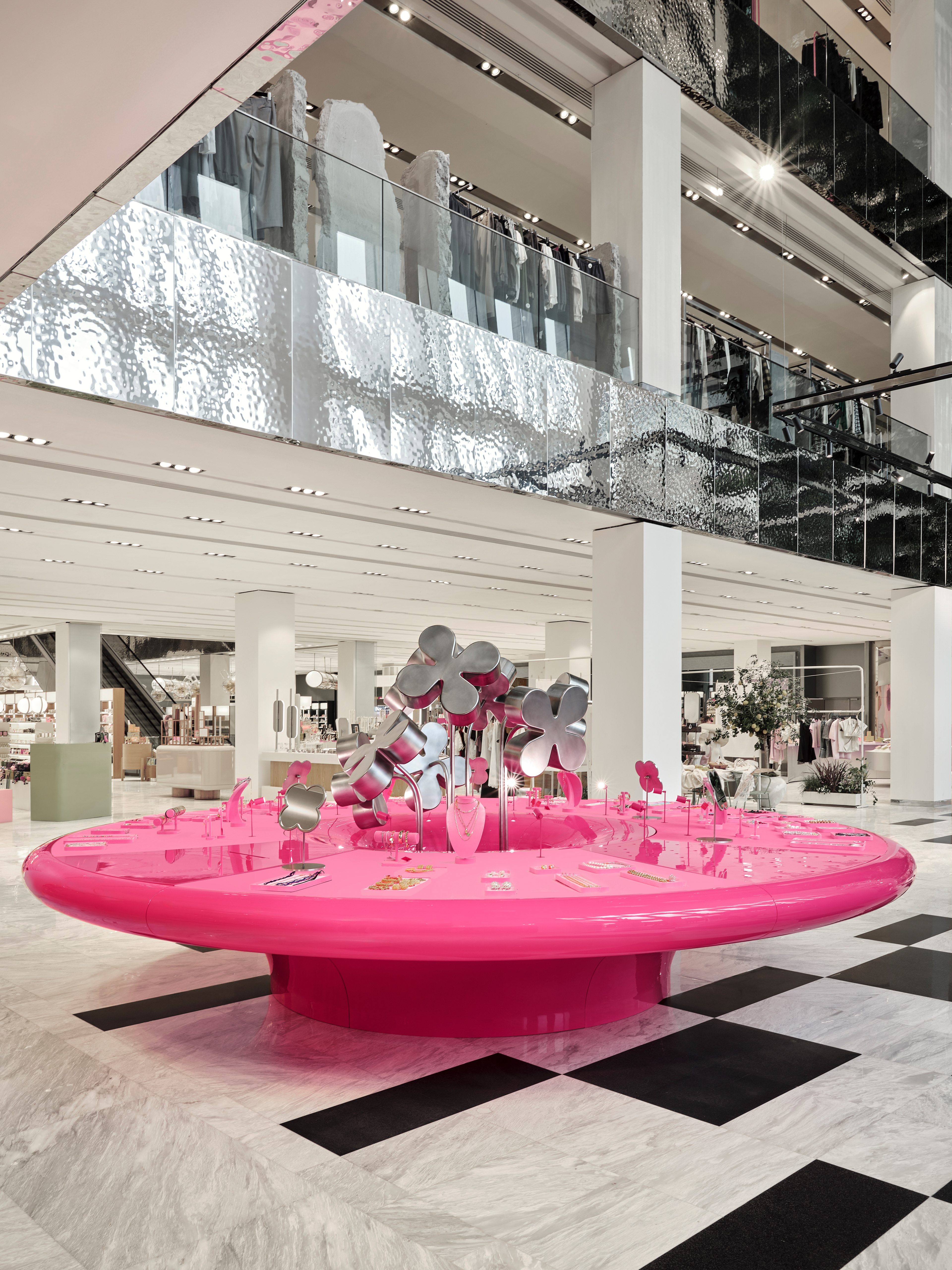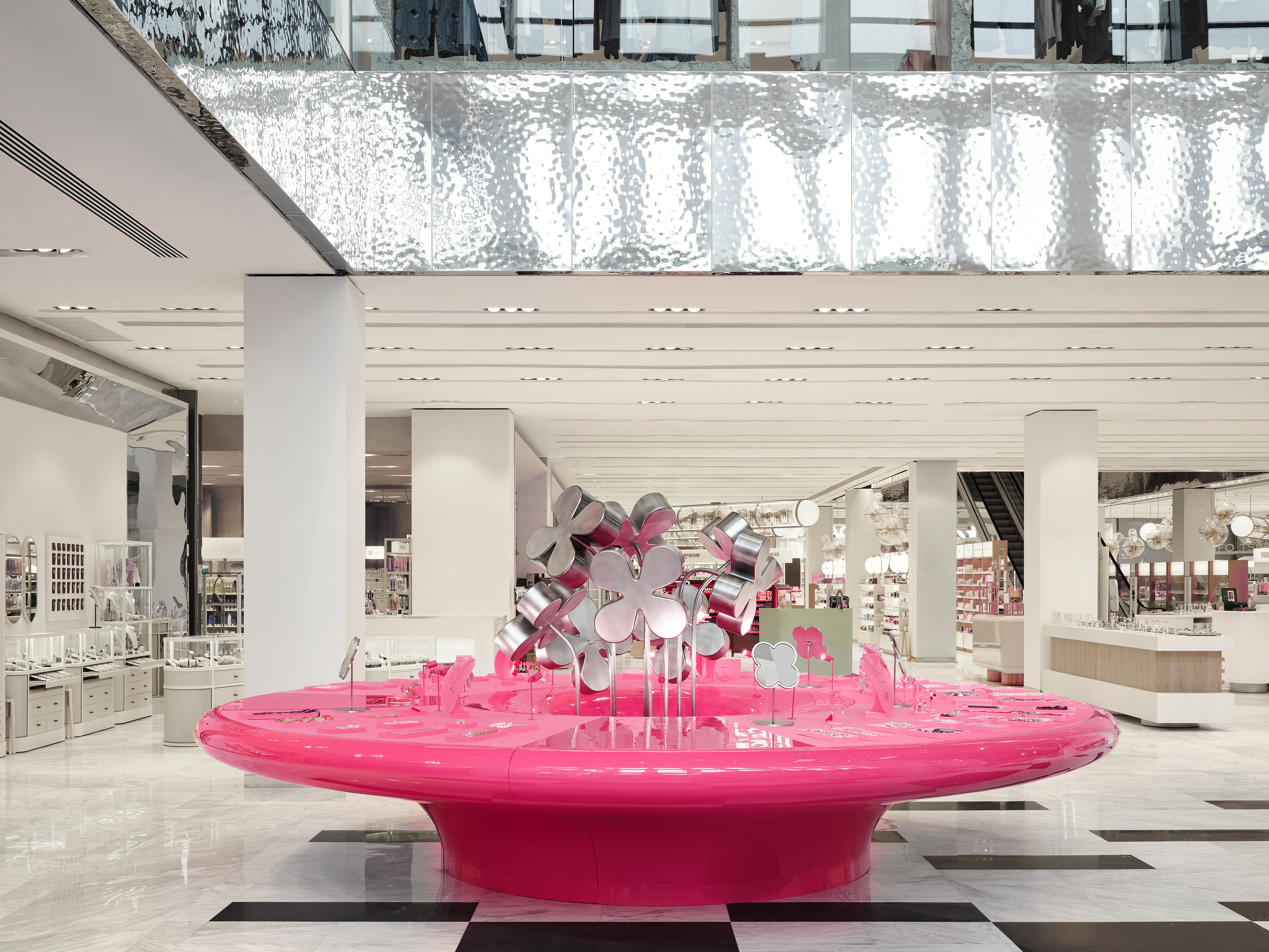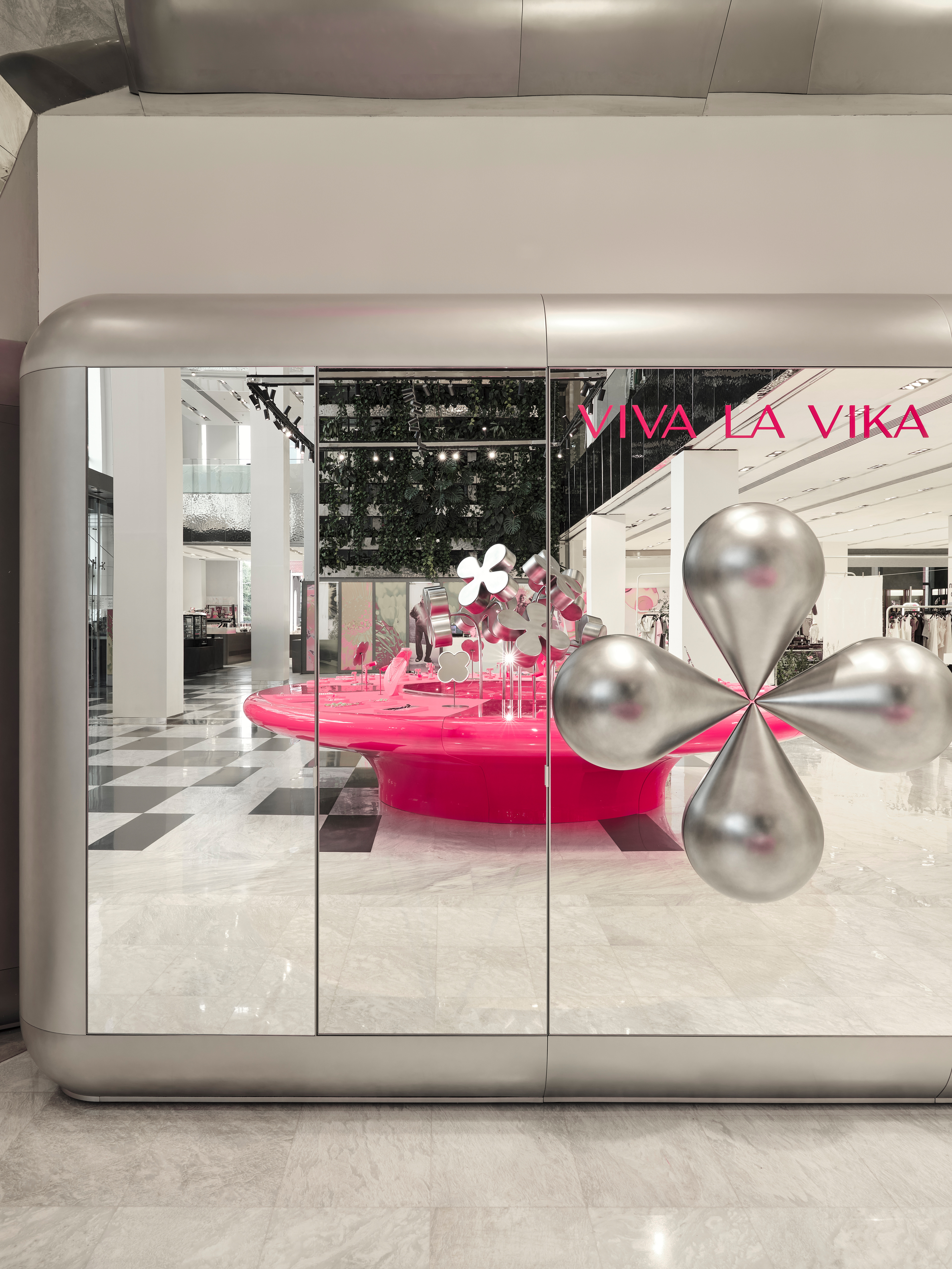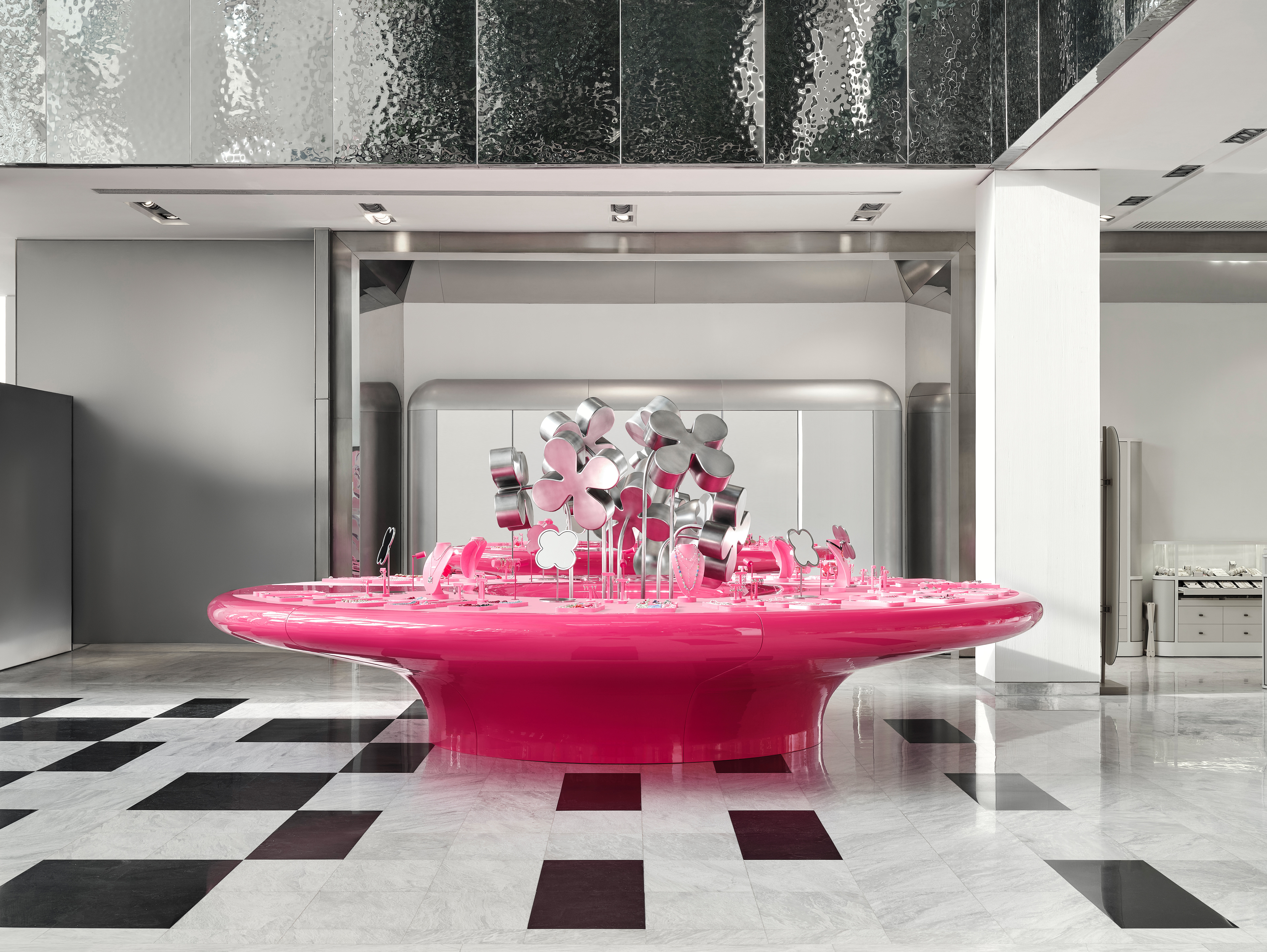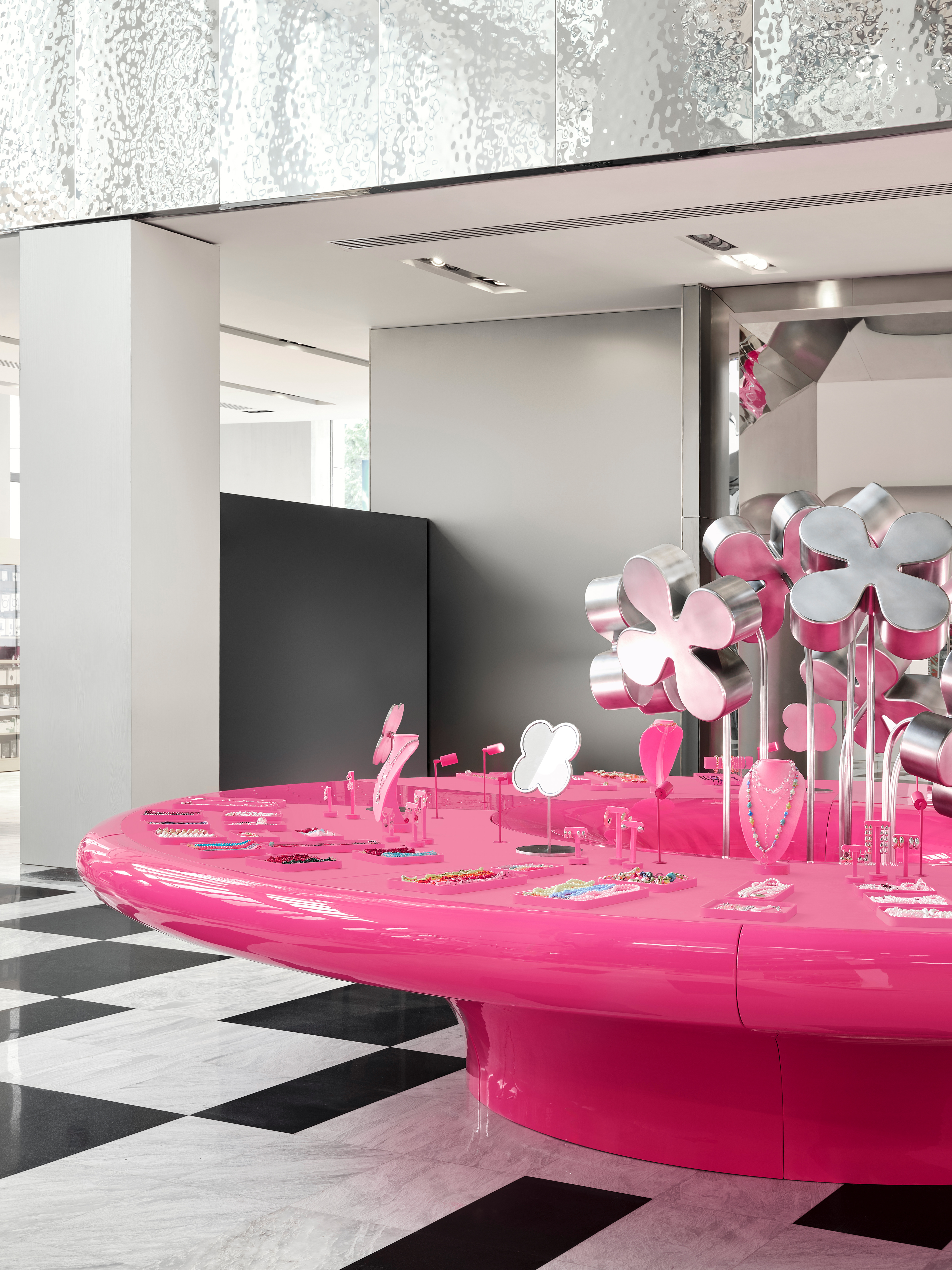 Instead of conventional solutions, a strategy of bold dominance was chosen: reflective metallic flowers, chrome, a pink pedestal, and a mirrored cabinet with rounded edges — all forming a self-contained, recognizable universe amidst the bustle of the shopping space.