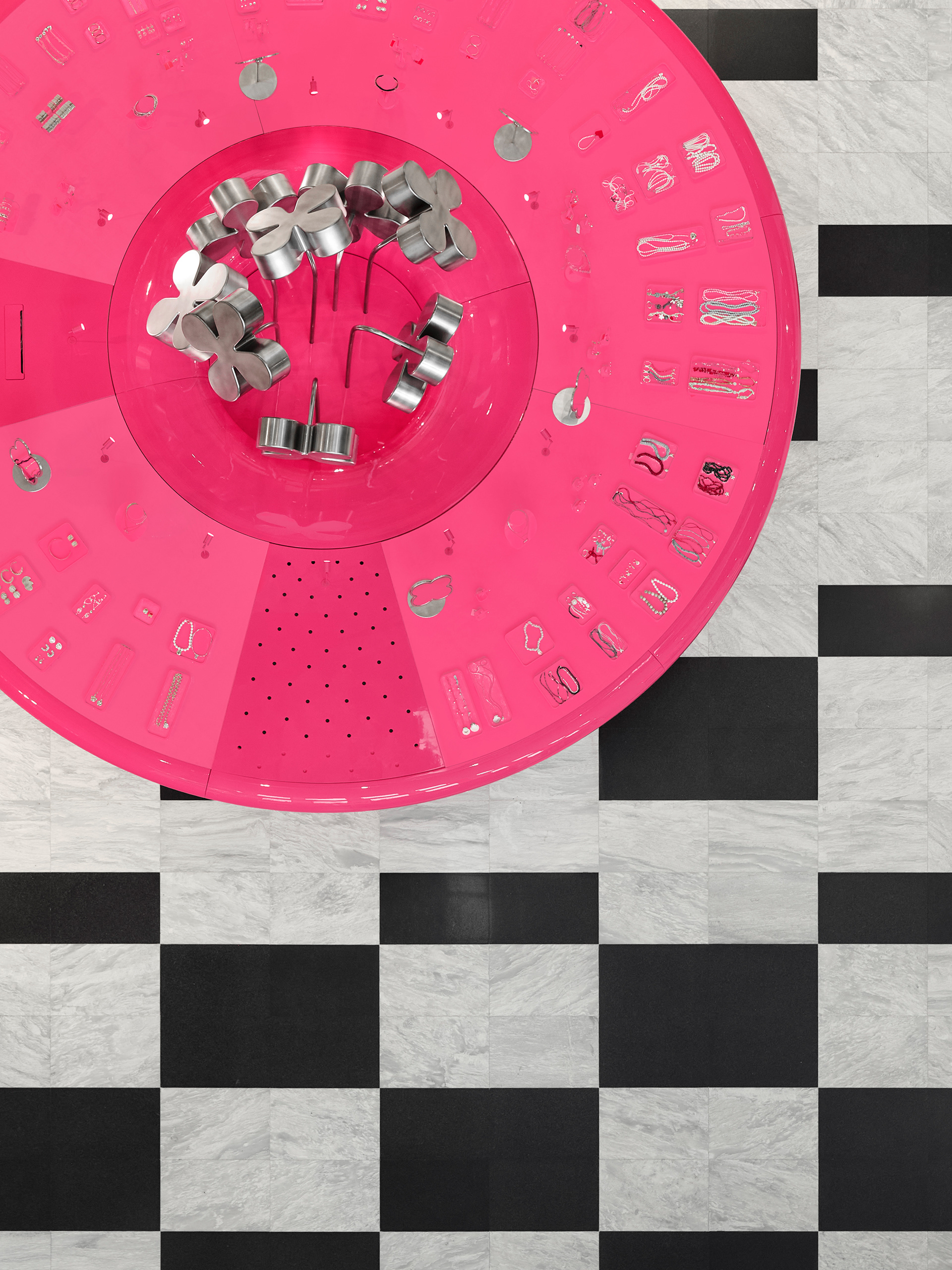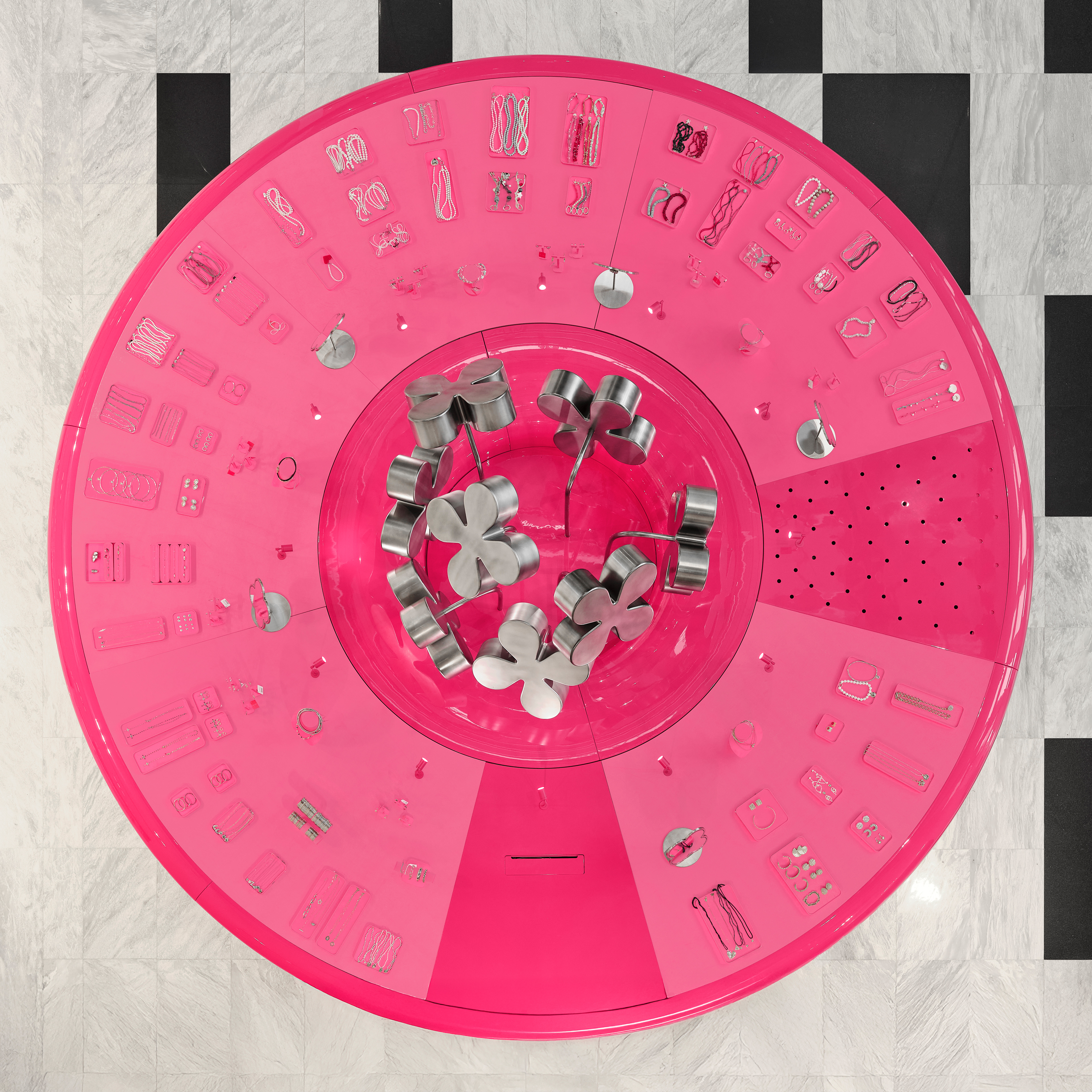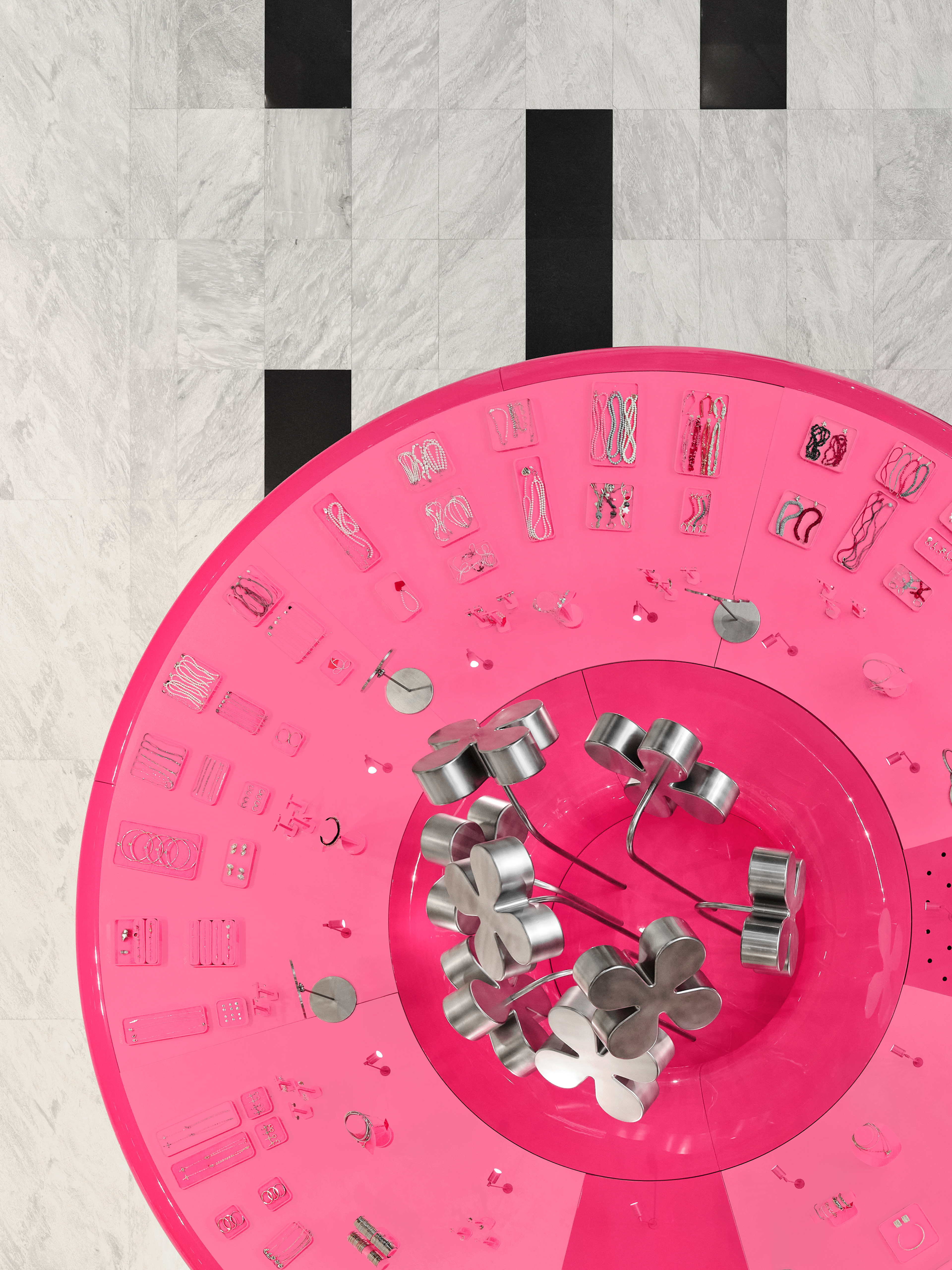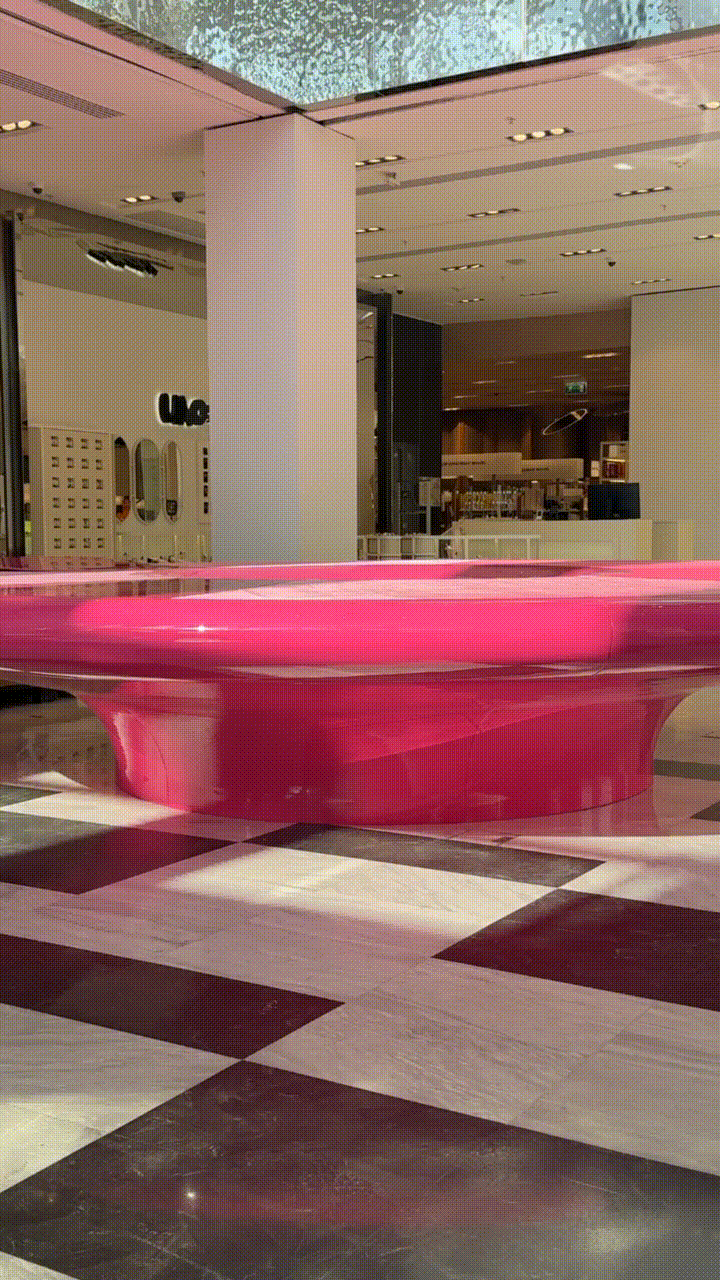 Instead of conventional solutions, a strategy of bold dominance was chosen: reflective metallic flowers, chrome, a pink pedestal, and a mirrored cabinet with rounded edges — all forming a self-contained, recognizable universe amidst the bustle of the shopping space.
