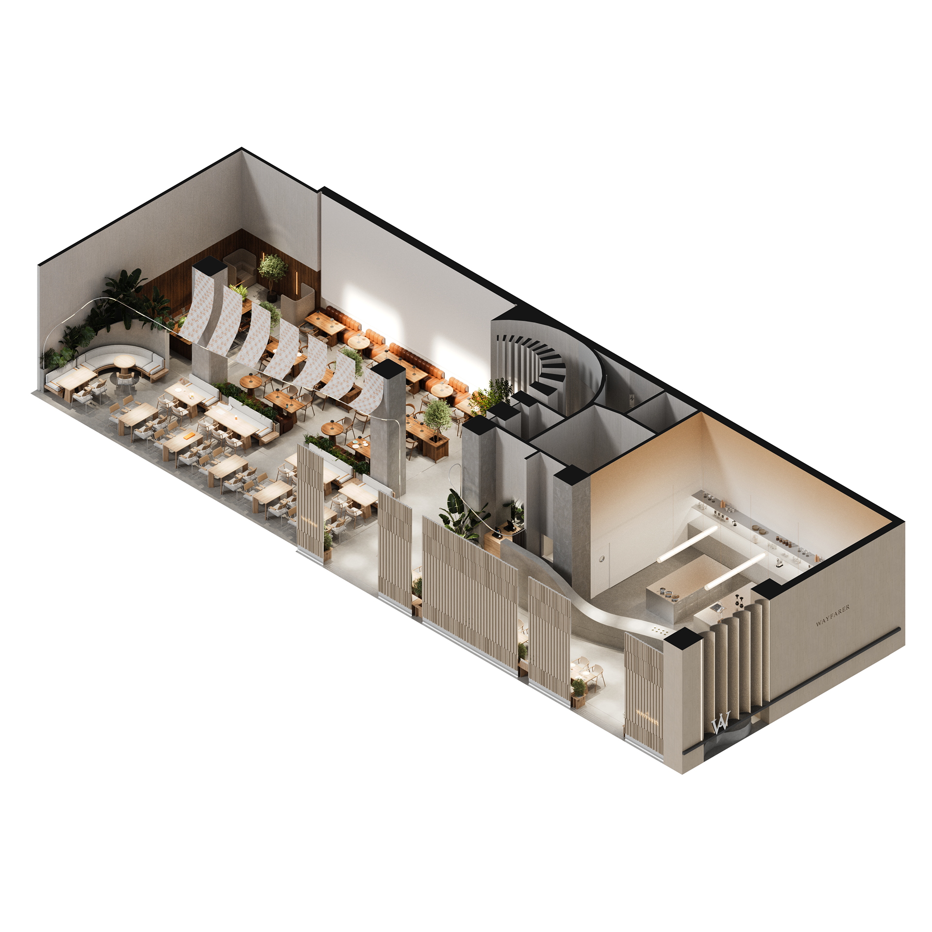 The elongated, rectangular layout is divided into zones aligned along a central axis. To the left of the entrance, a terrace-like seating area by the windows invites guests to pause. Further inside, warm outdoor-style lighting mimics natural daylight.